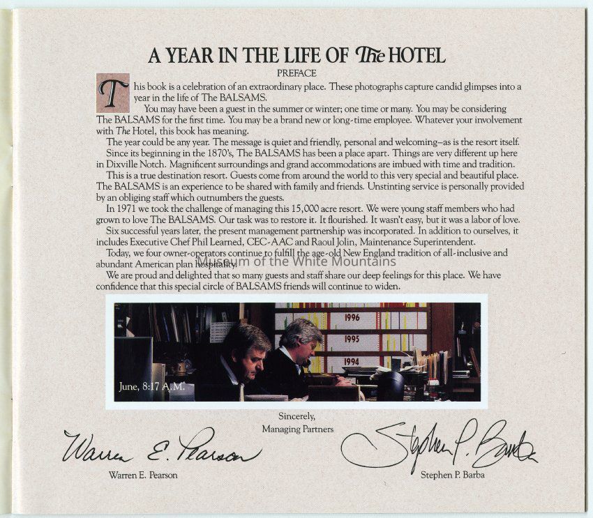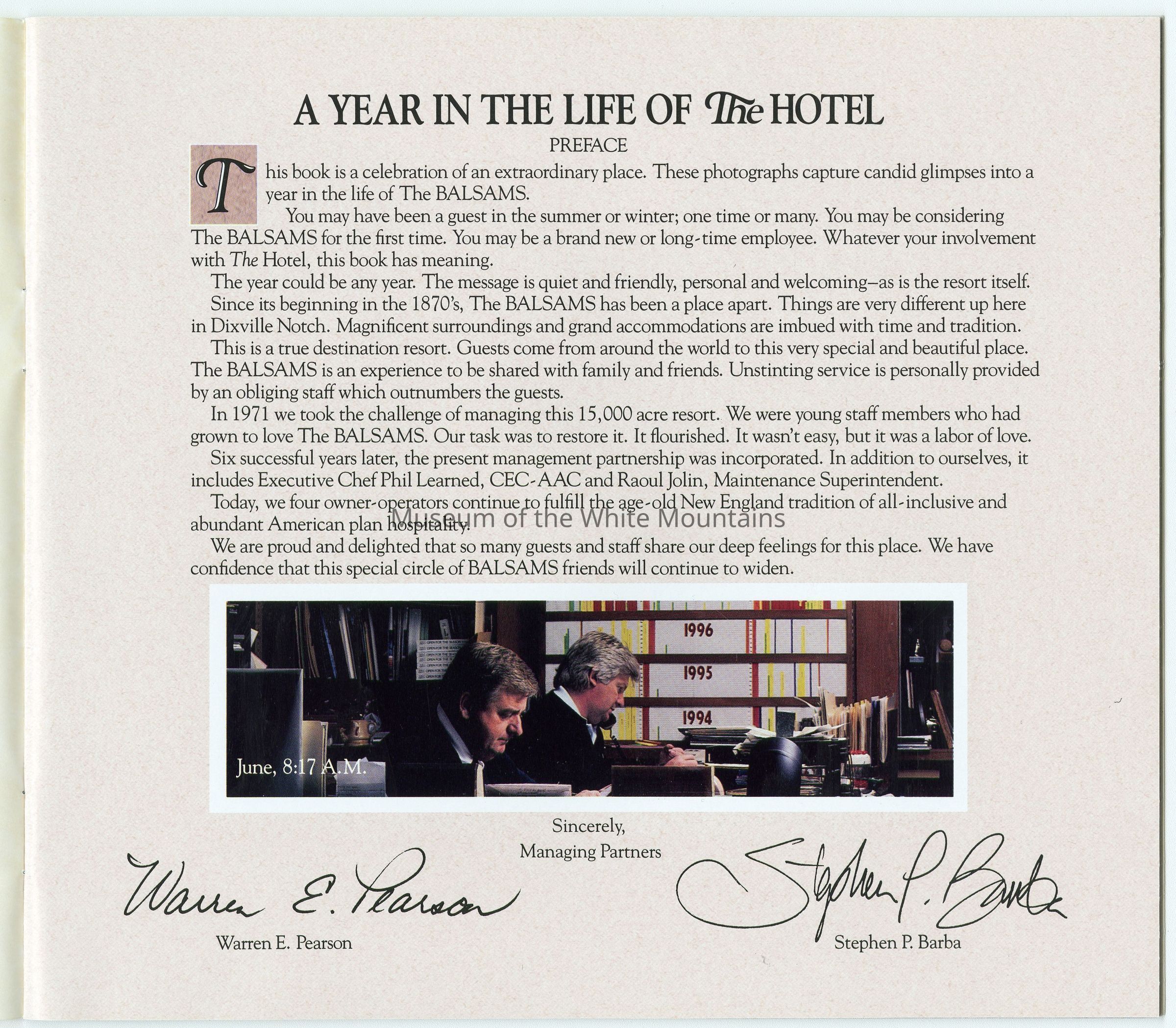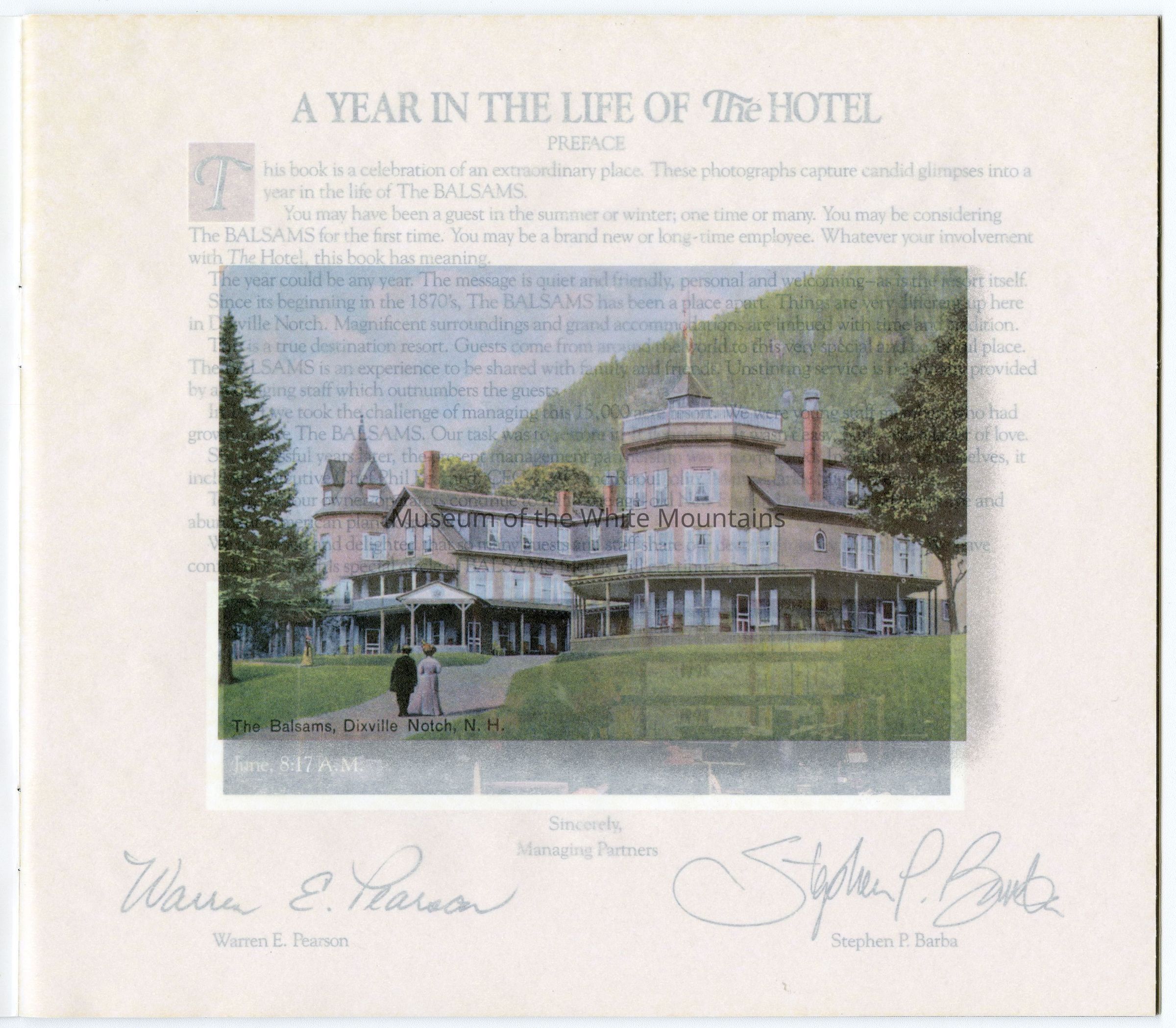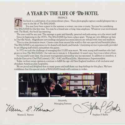 A booklet containing images of year round activities at the Balsams Hotel like skiing, golfing, tennis, etc. The preface states that "This book is a celebration of an extraordinary place."