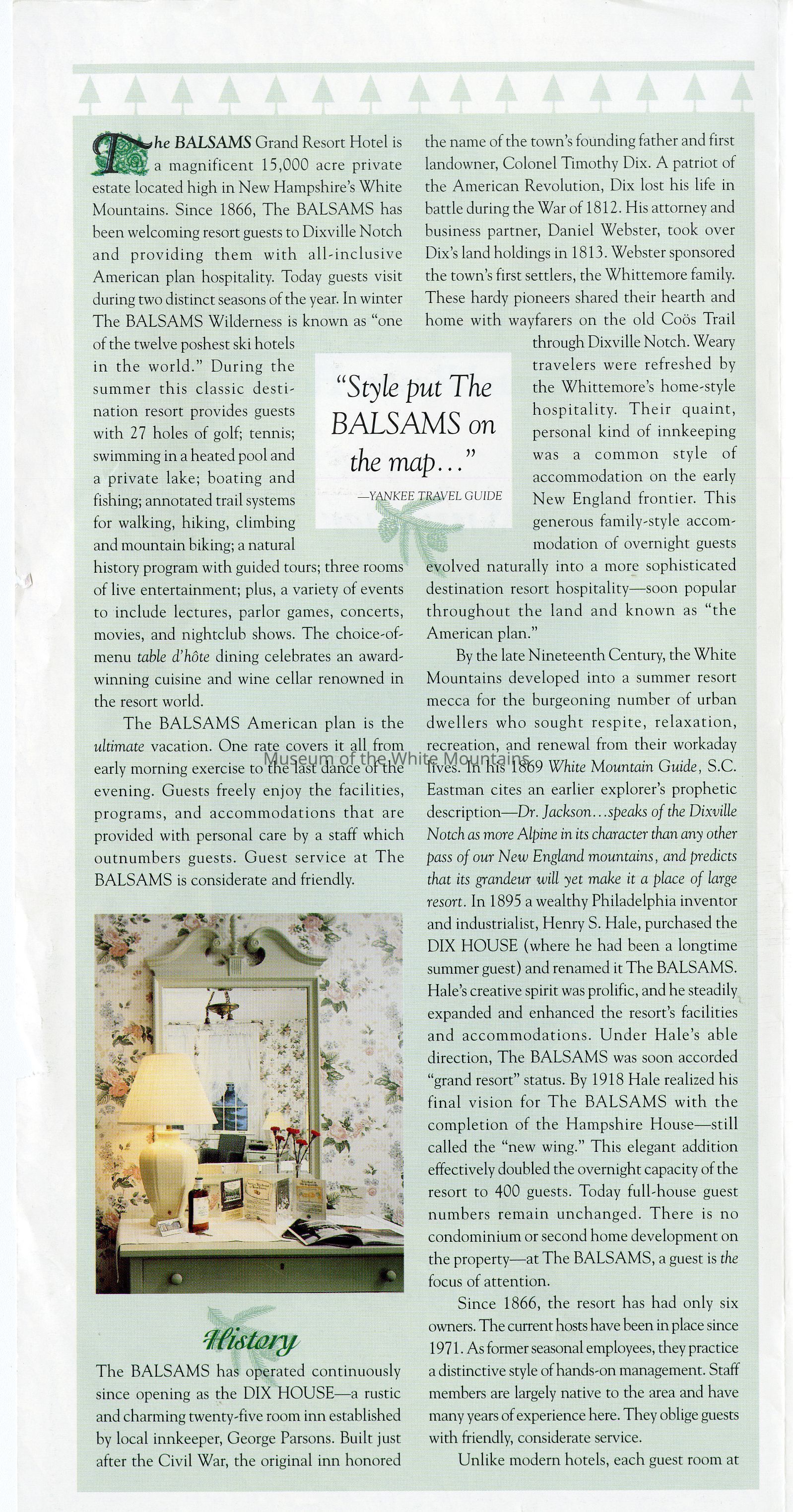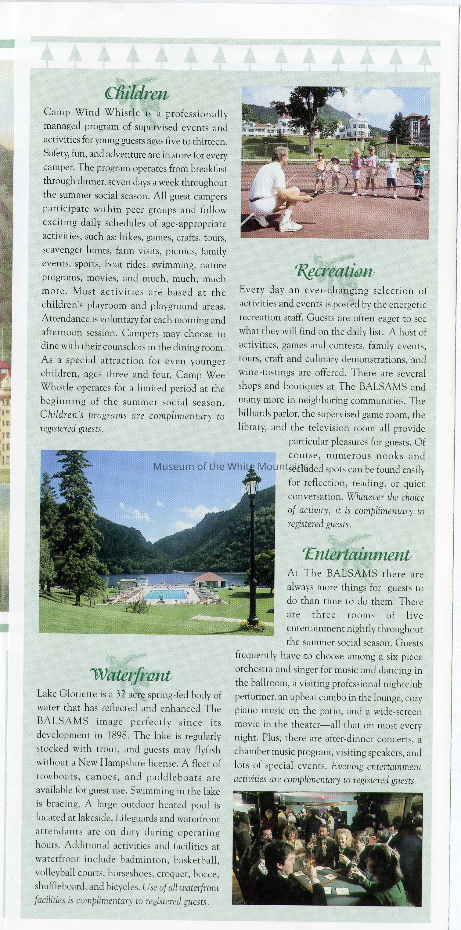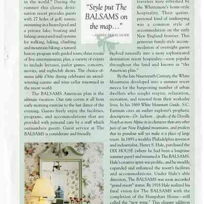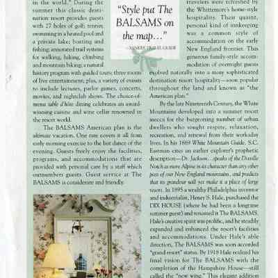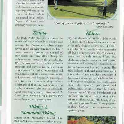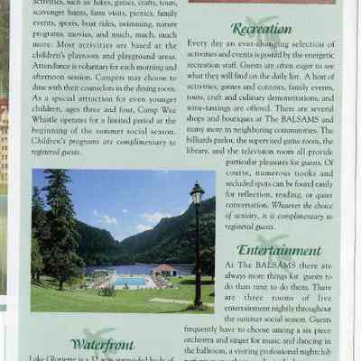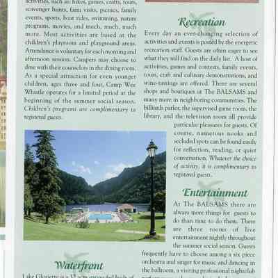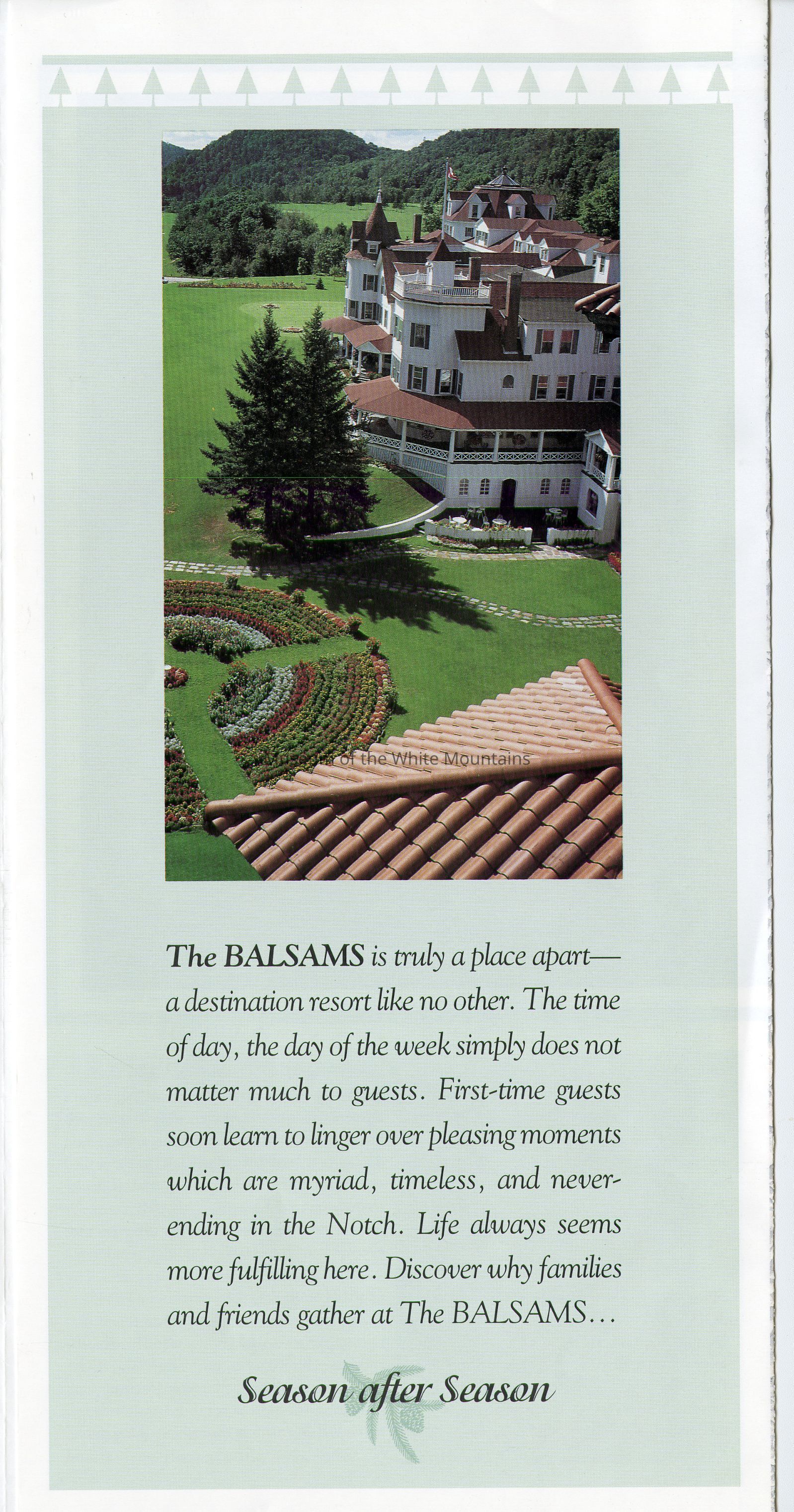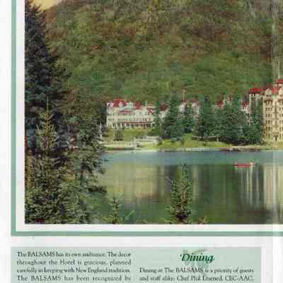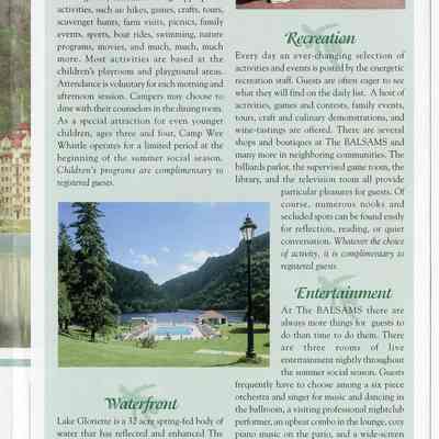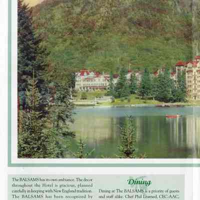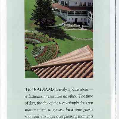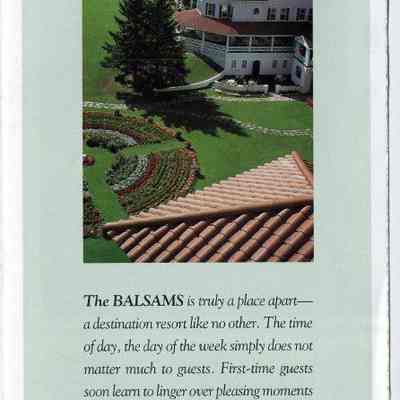 Brochure describing the Balsams Hotel Summer resort. Enclosed are sections on the history of the hotel, along with descriptions of activites and ammenities including dining, recreation, entertainment, nature, sports, waterfront, and childrens activities.Acquisition
