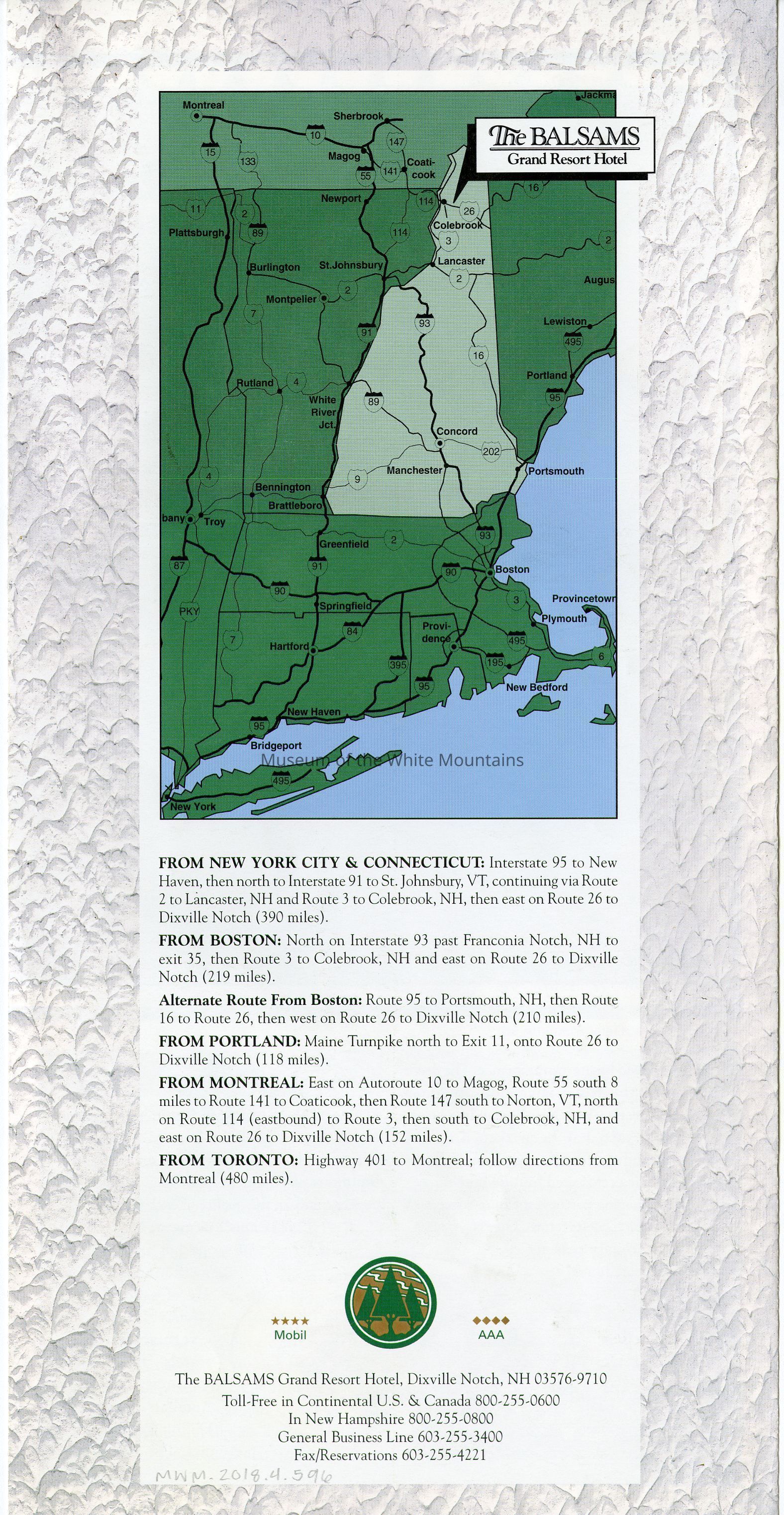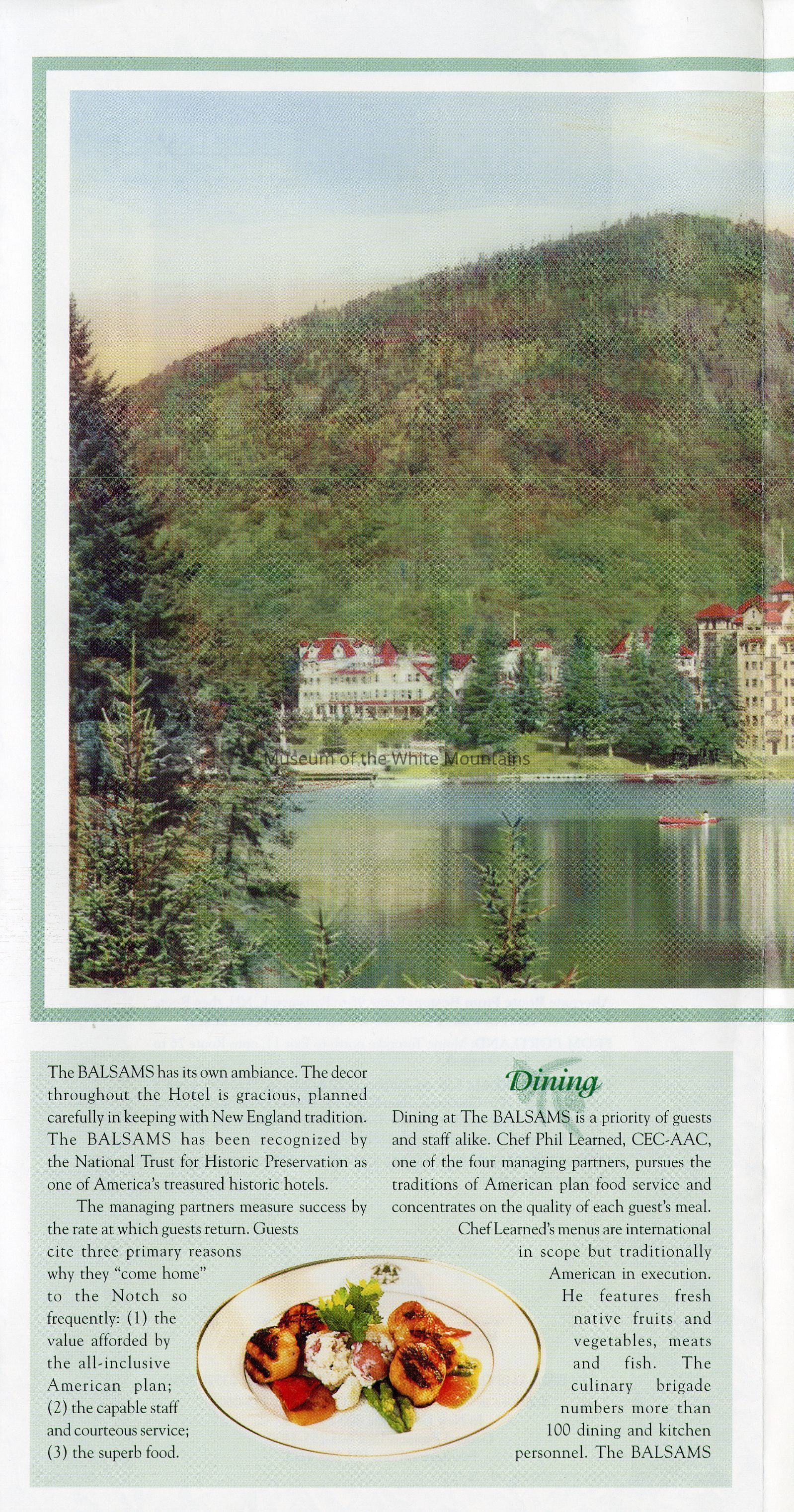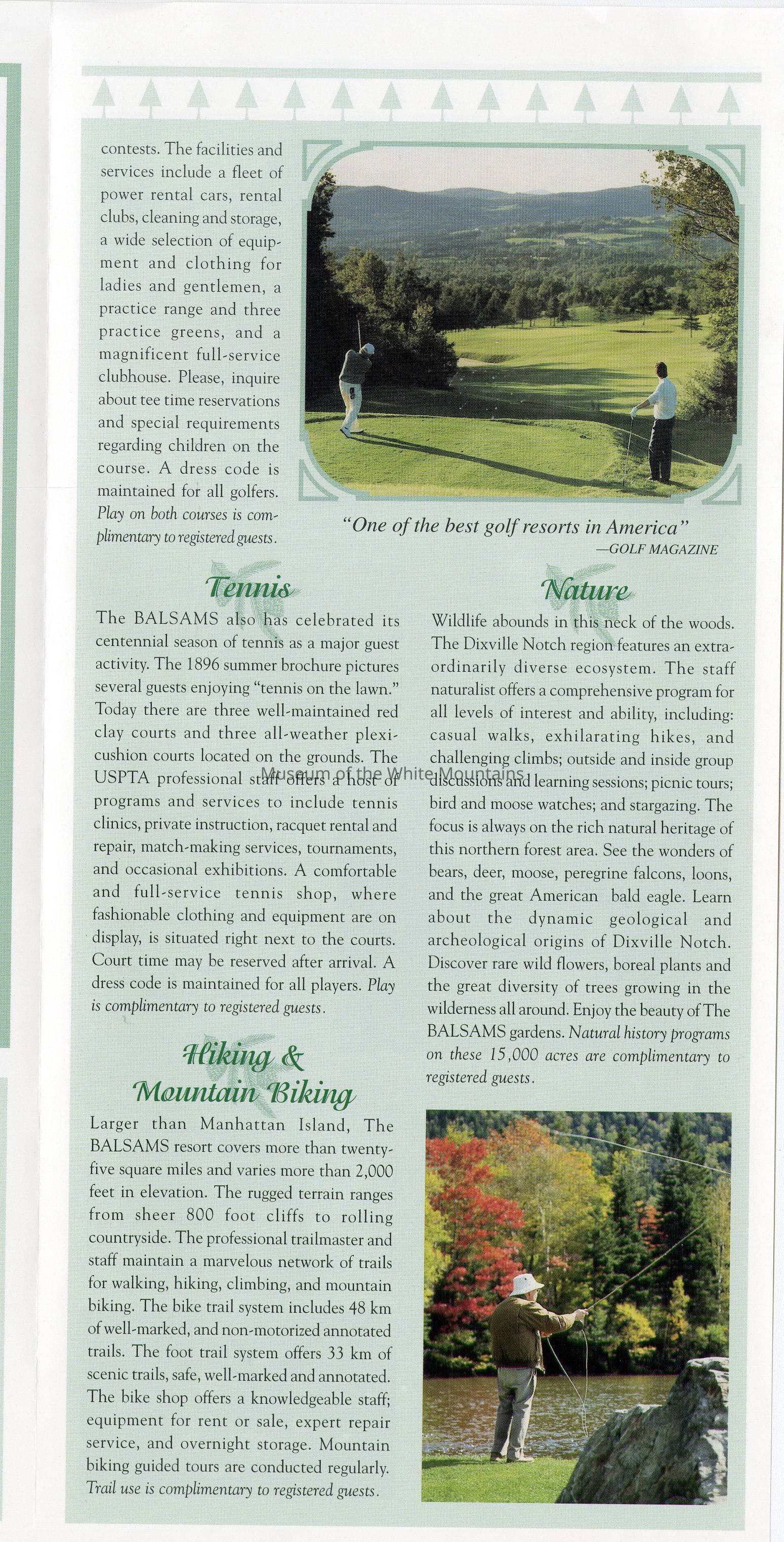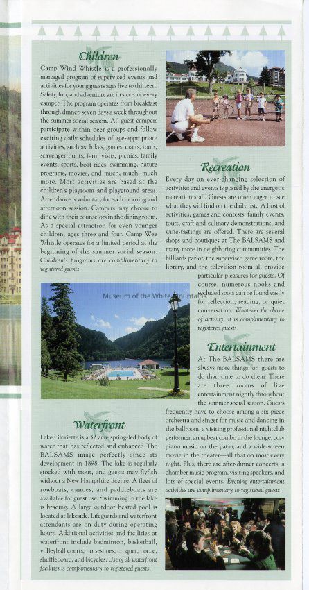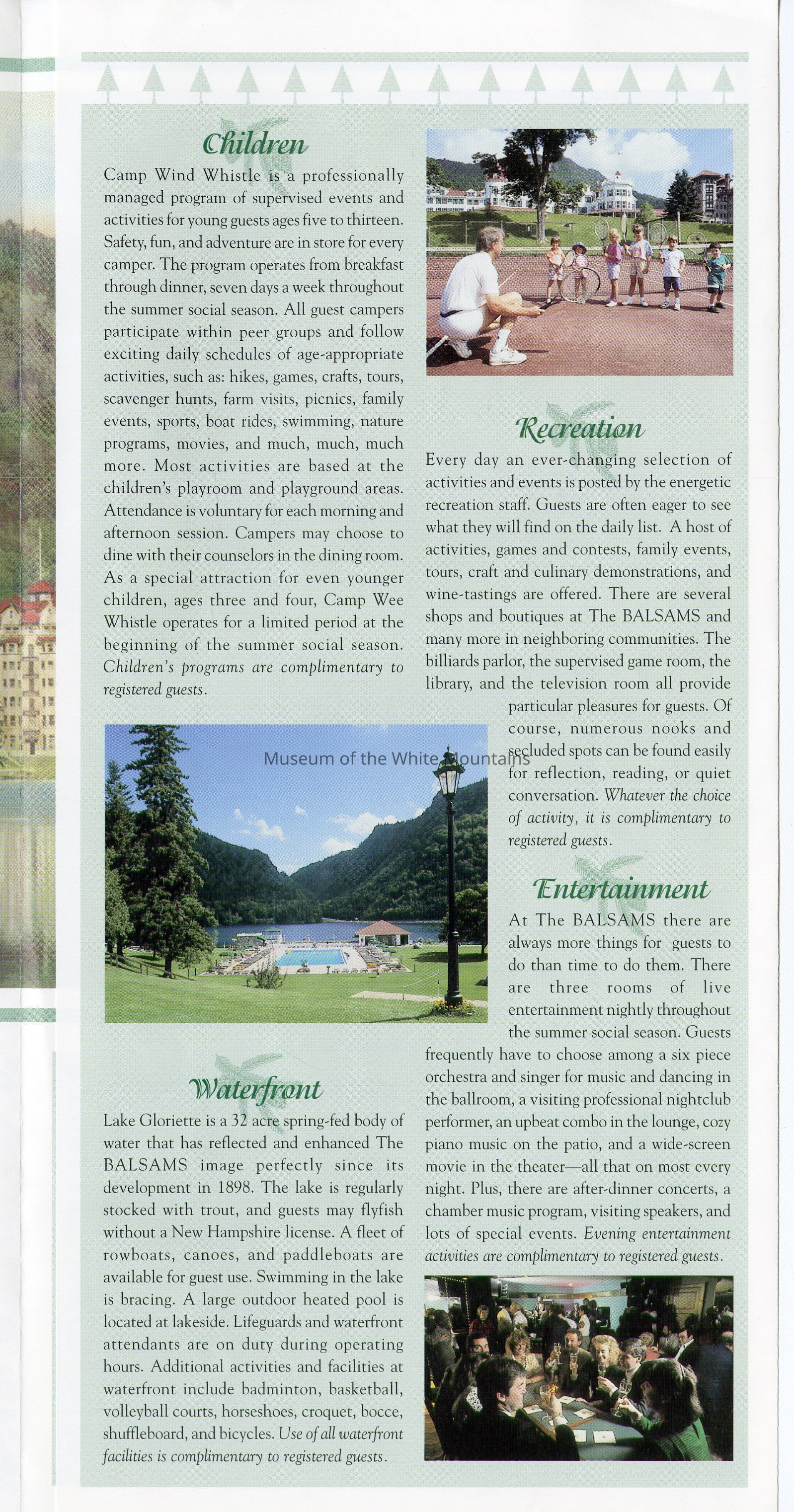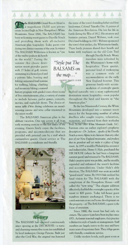 Brochure describing the Balsams Hotel Summer resort. Enclosed are sections on the history of the hotel, along with descriptions of activites and ammenities including dining, recreation, entertainment, nature, sports, waterfront, and childrens activities.Acquisition