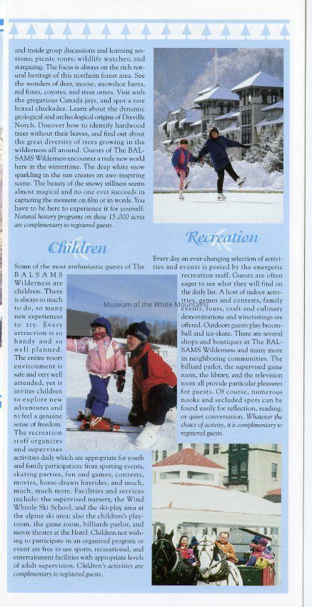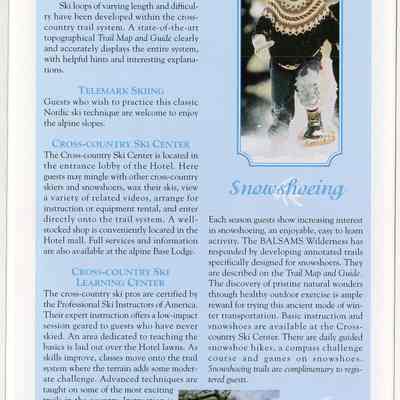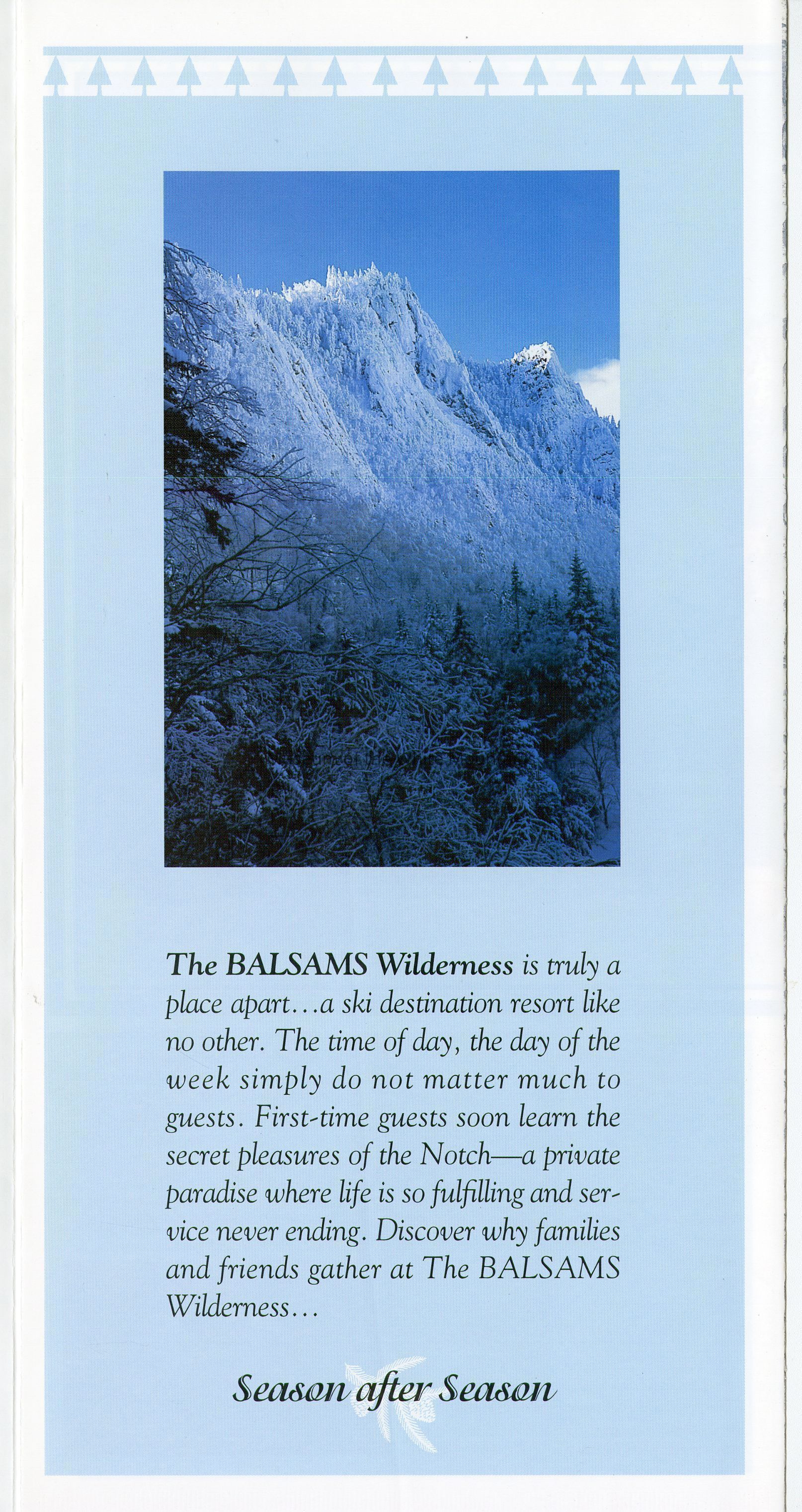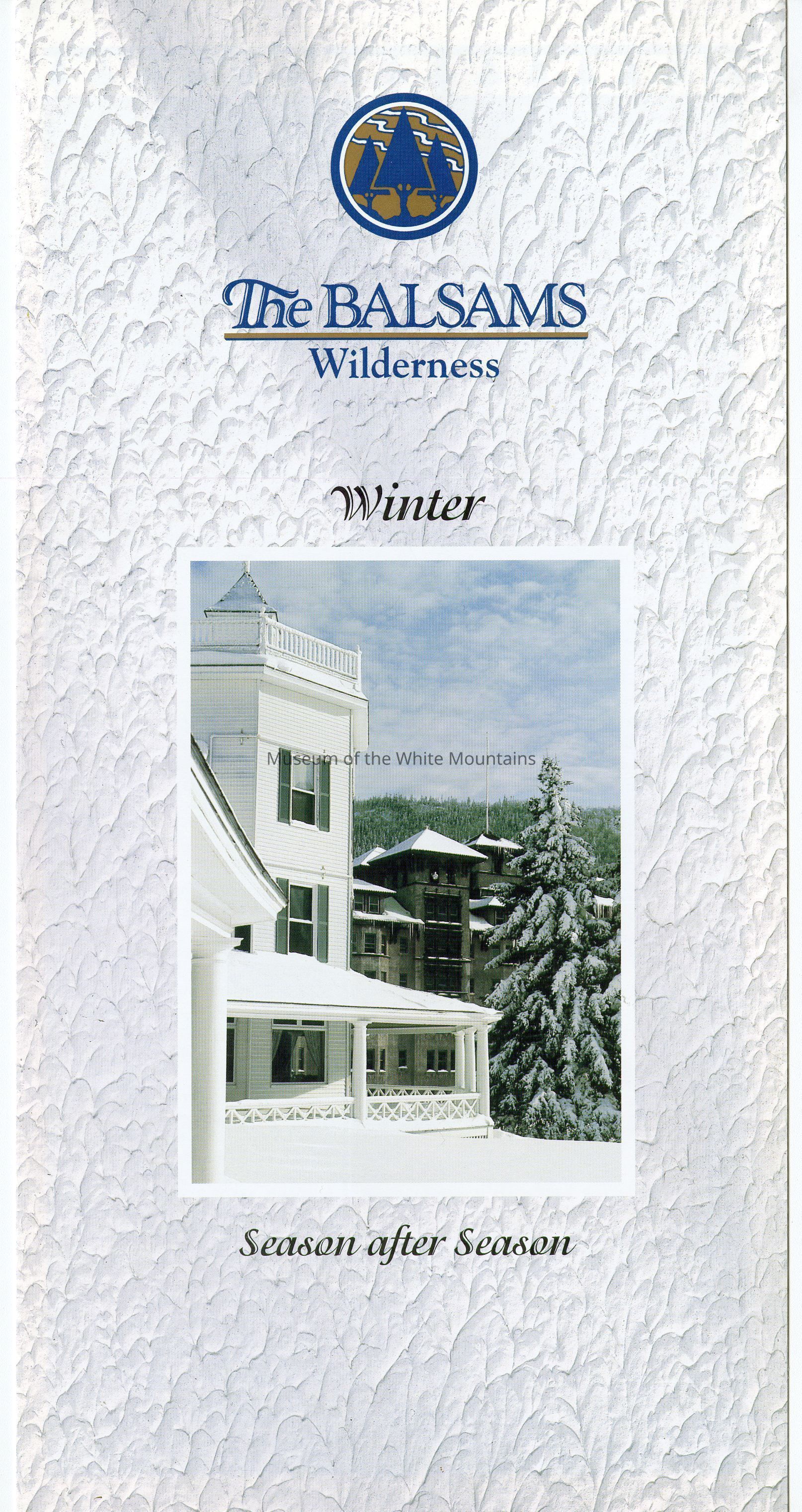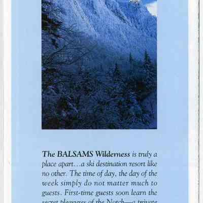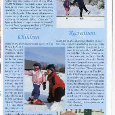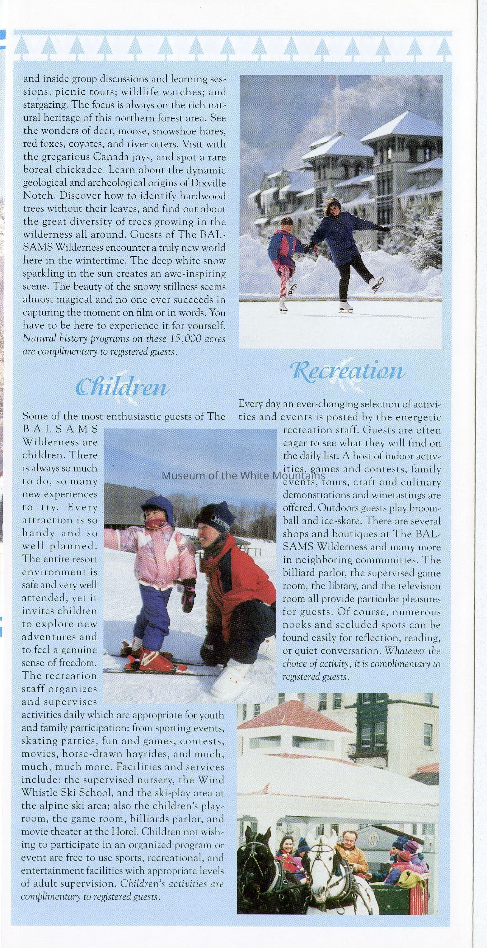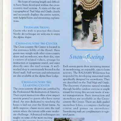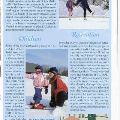 Brochure describing the Balsams Wilderness and activities for guests and families during their stay. Enclosed are descriptions regarding the history of the hotel, activities for children, dining, recreation, the cross-country ski center, showshoeing, and entertainment.Acquisition