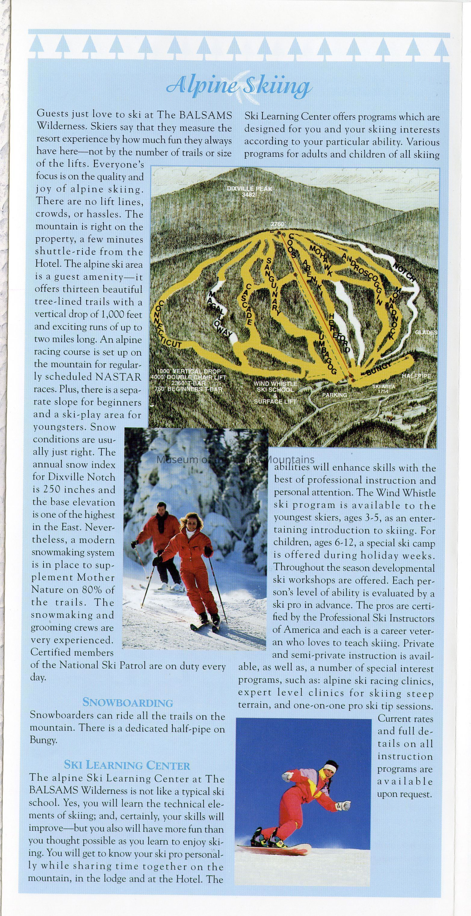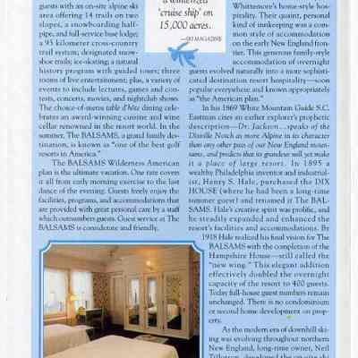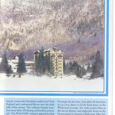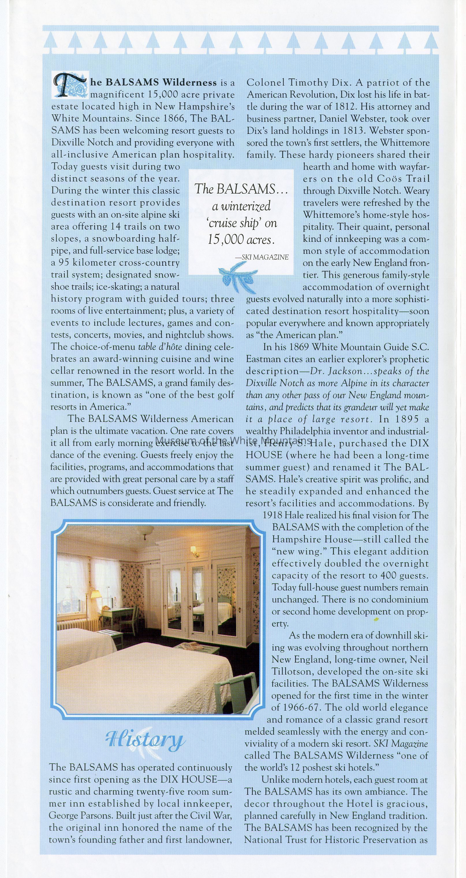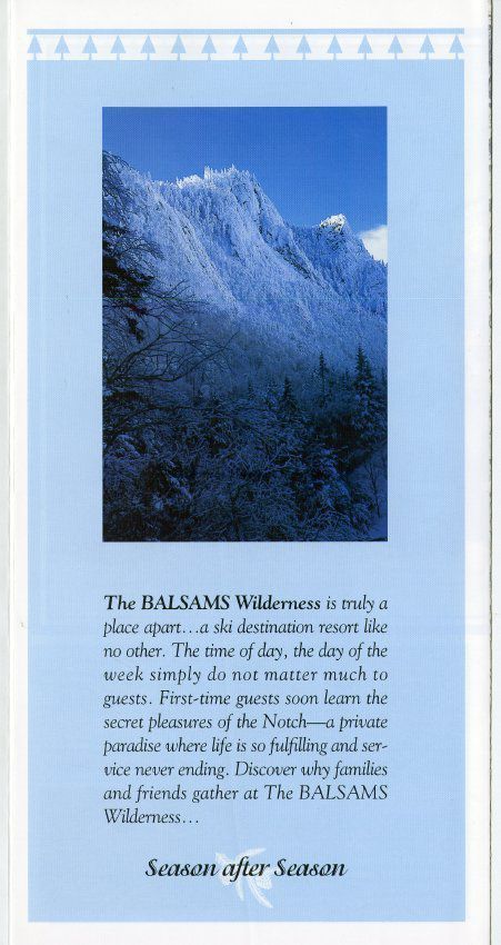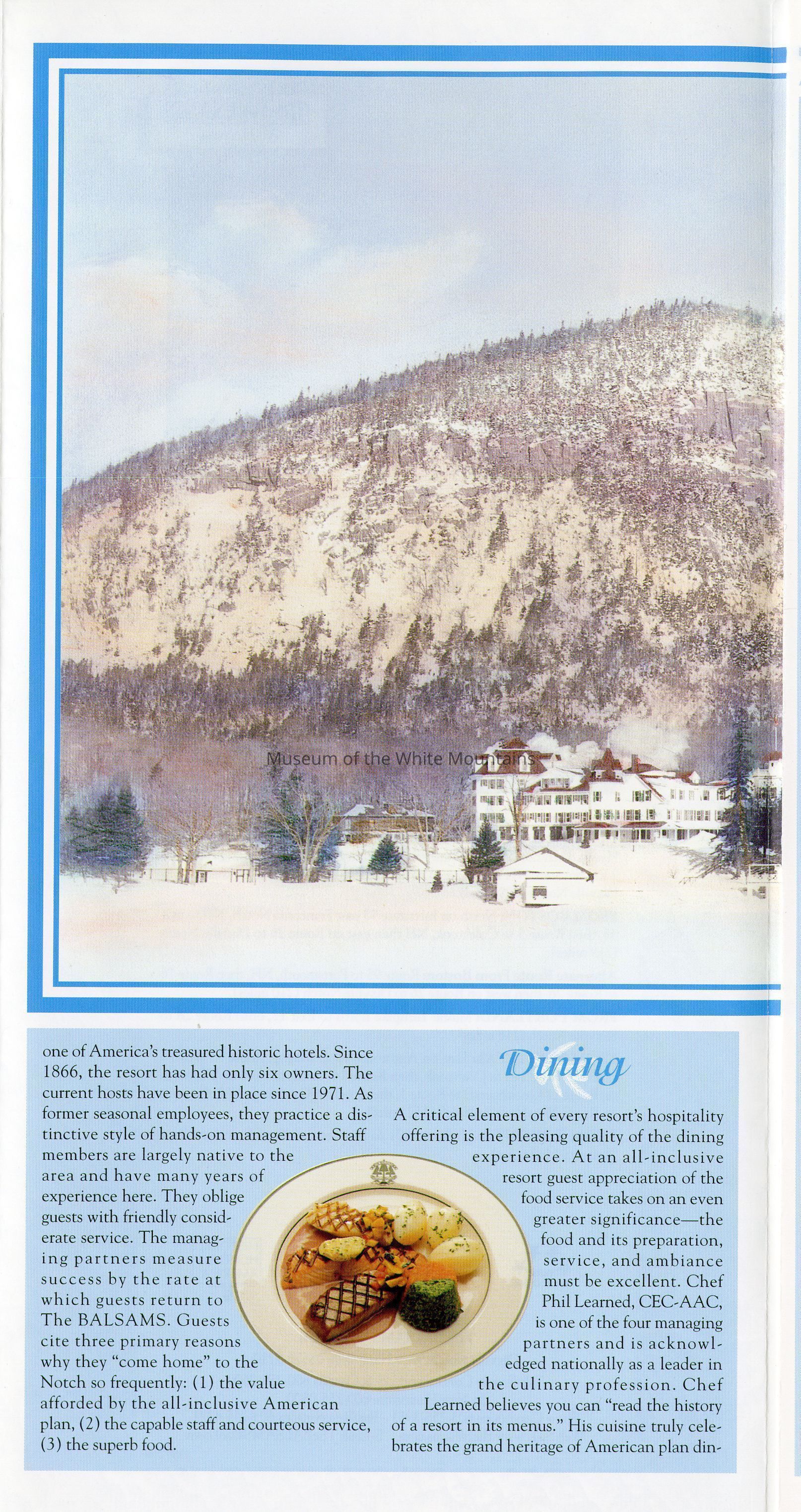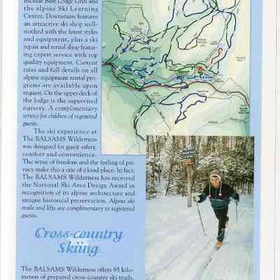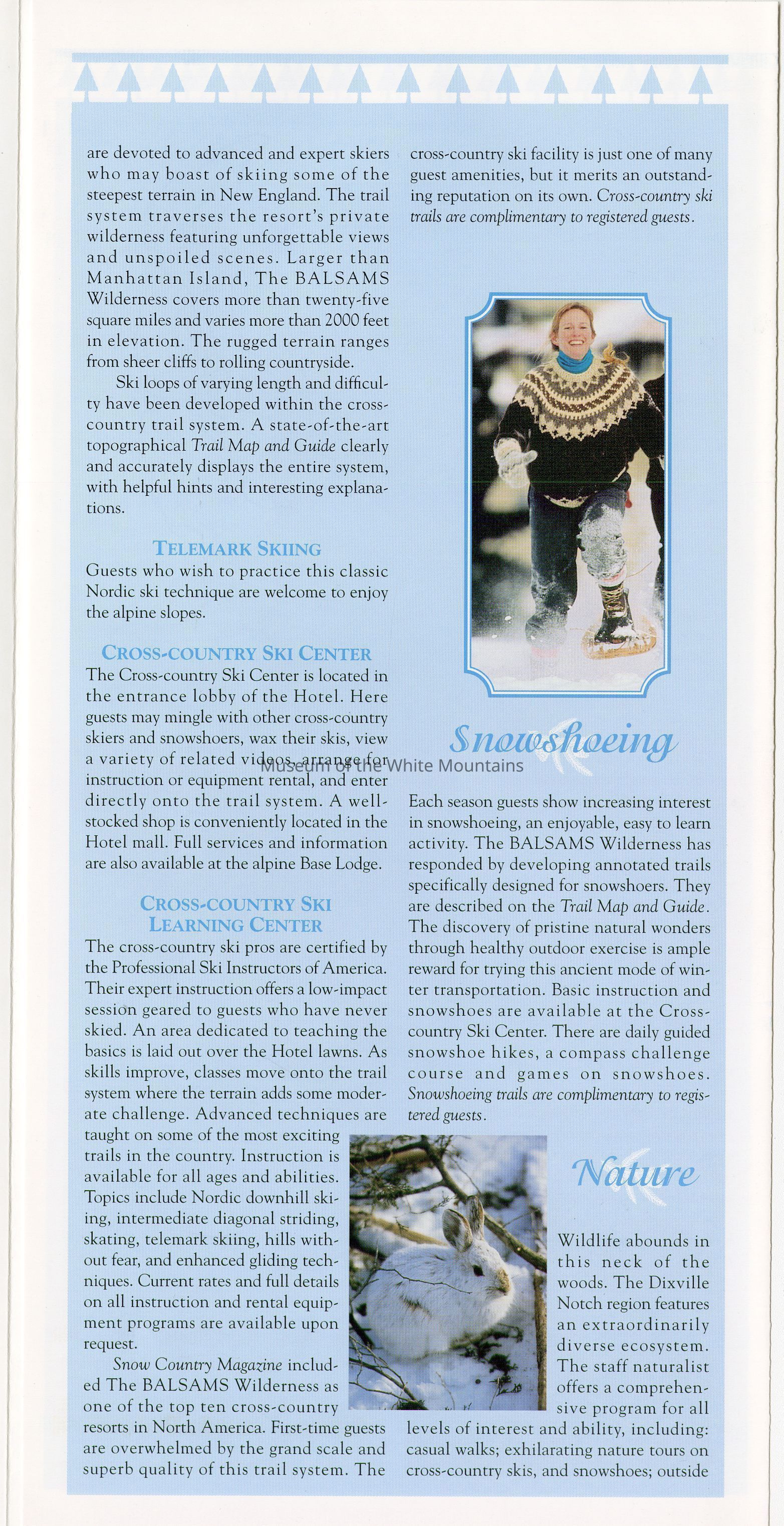 Brochure describing the Balsams Wilderness and activities for guests and families during their stay. Enclosed are descriptions regarding the history of the hotel, activities for children, dining, recreation, the cross-country ski center, showshoeing, and entertainment.Acquisition