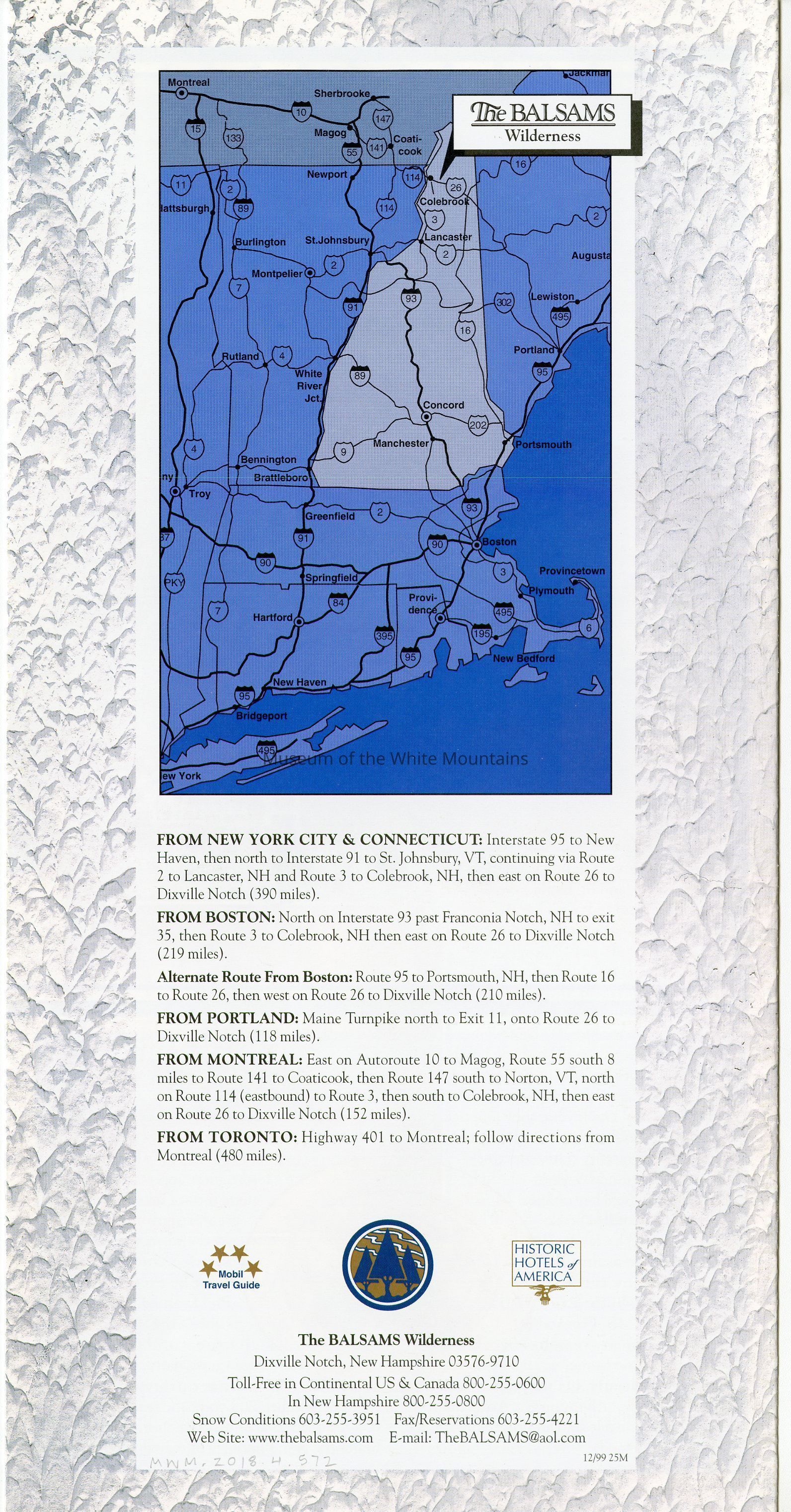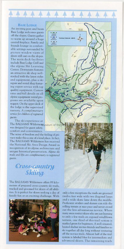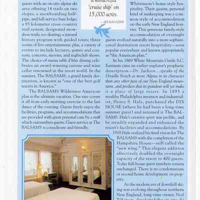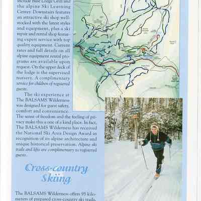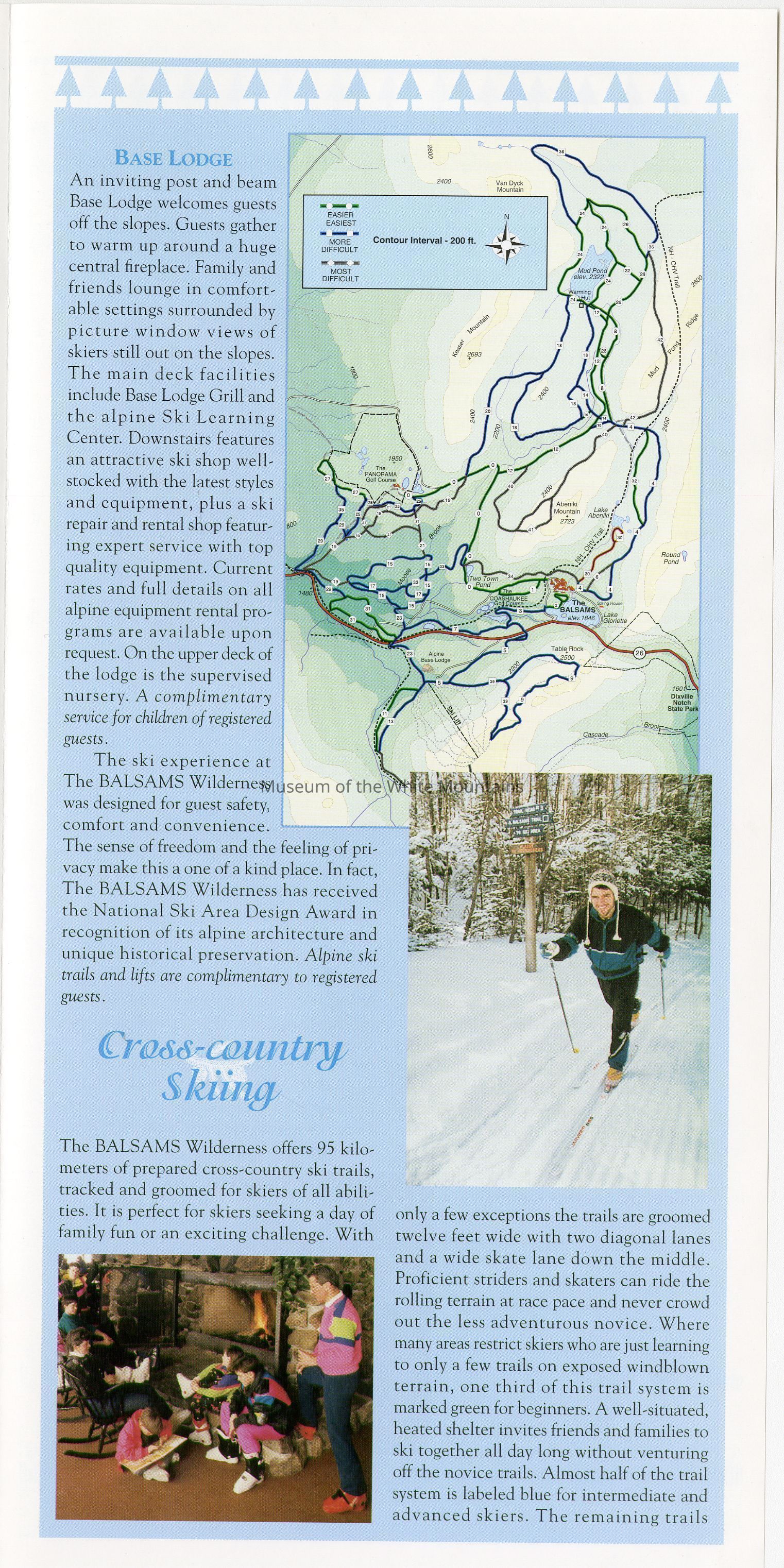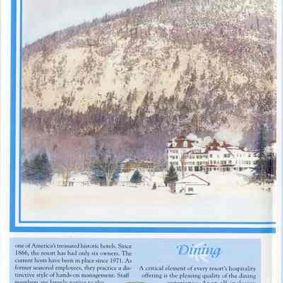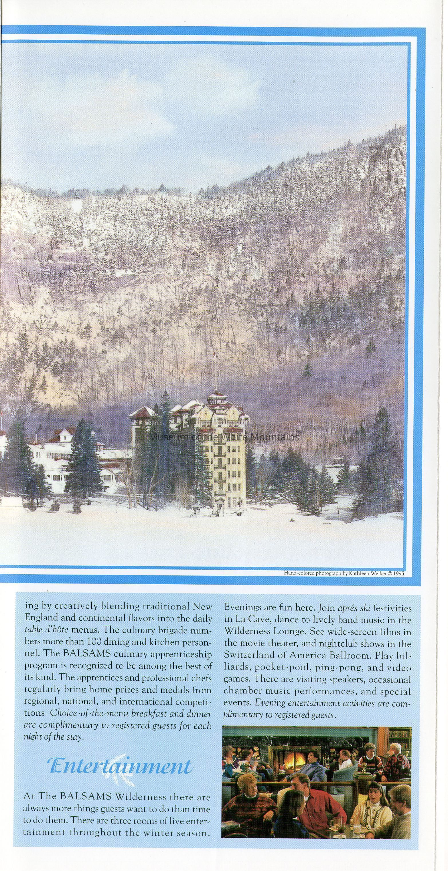 Brochure describing the Balsams Wilderness and activities for guests and families during their stay. Enclosed are descriptions regarding the history of the hotel, activities for children, dining, recreation, the cross-country ski center, showshoeing, and entertainment.Acquisition