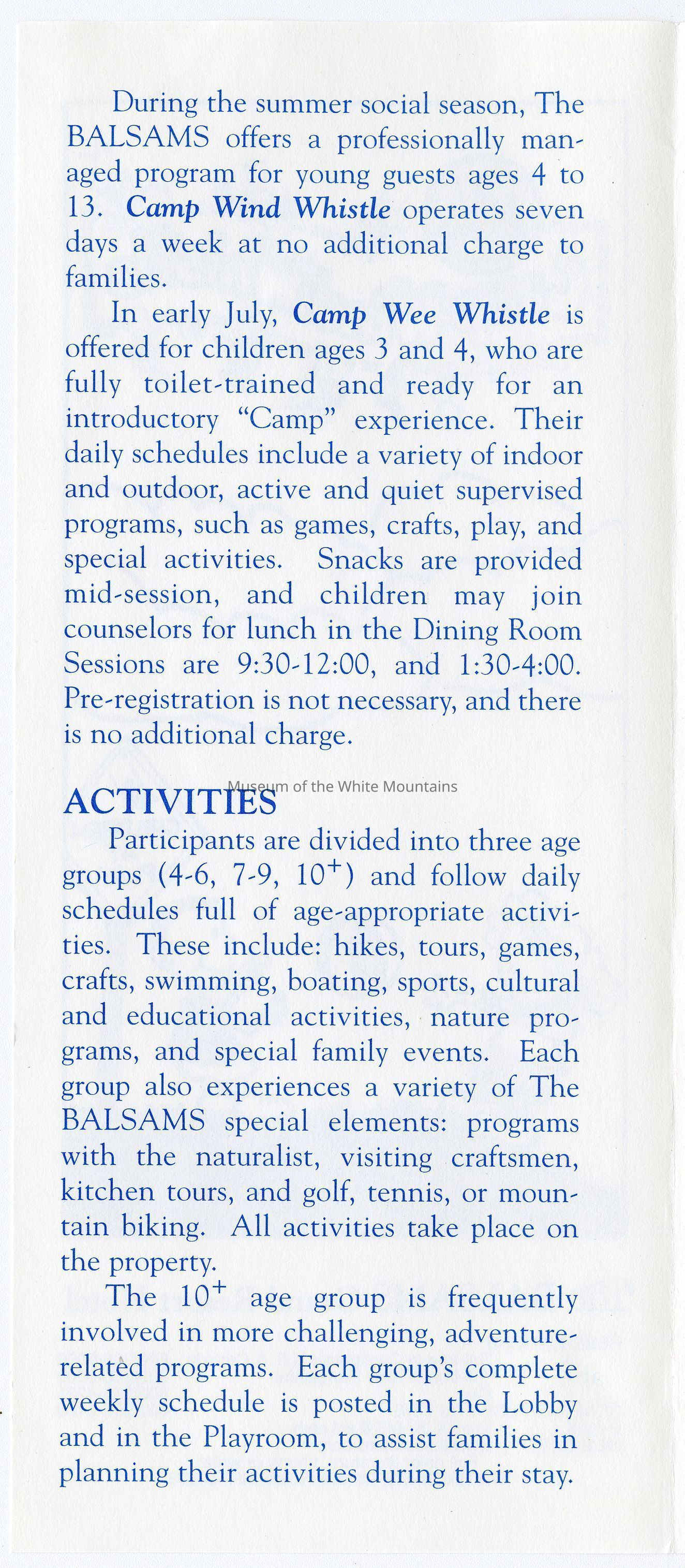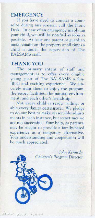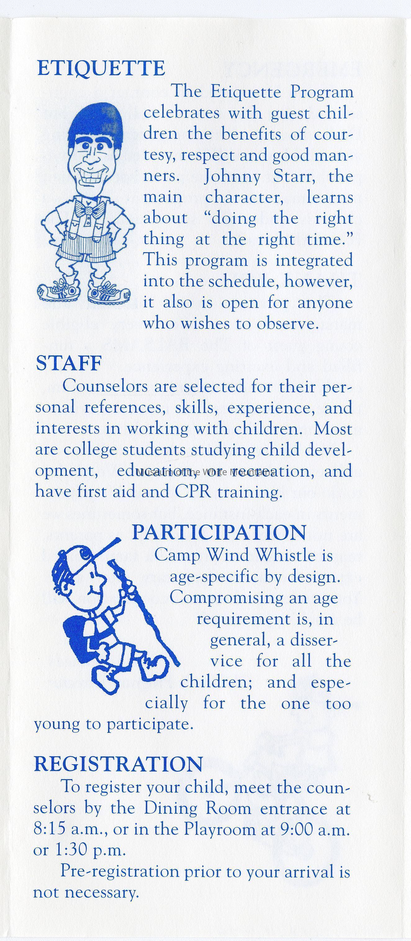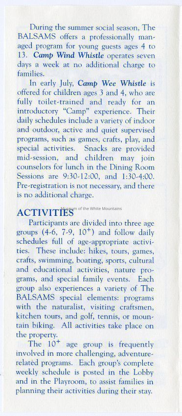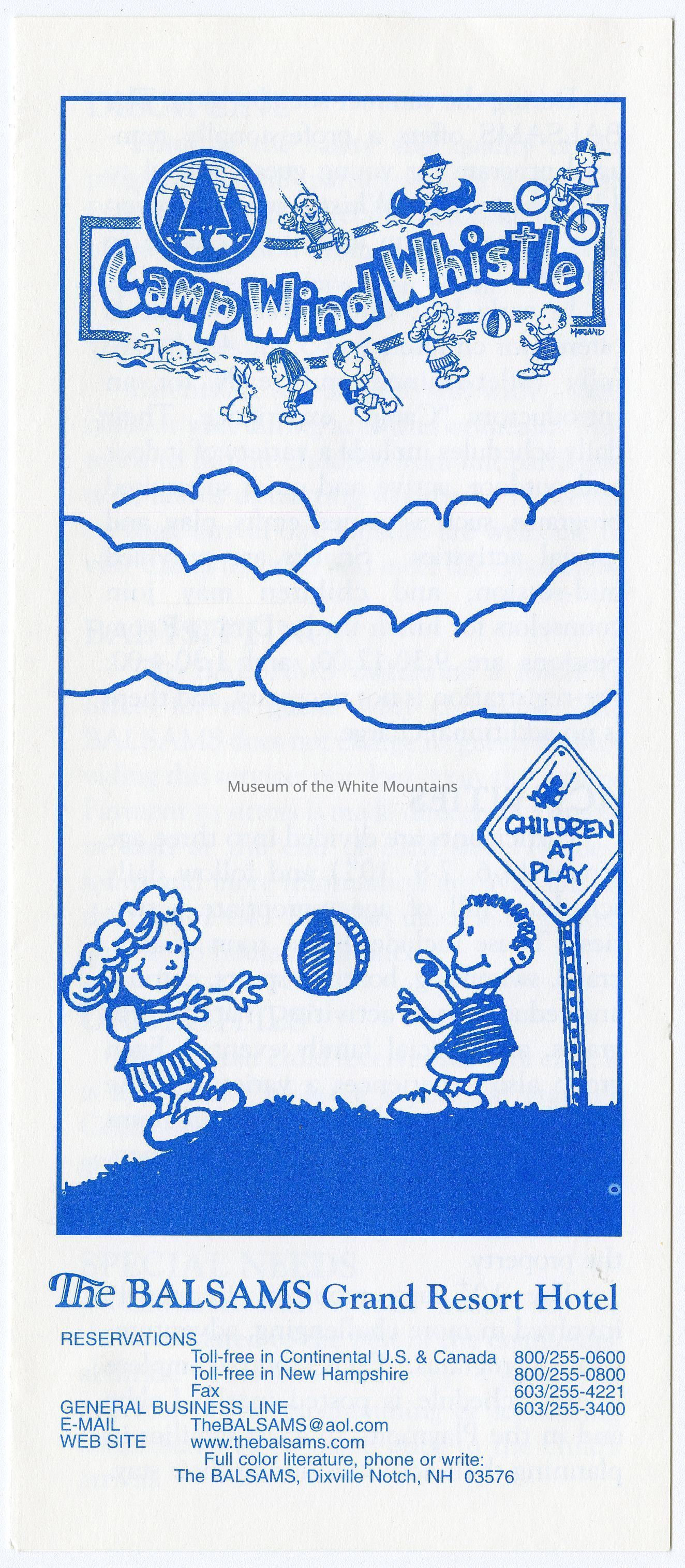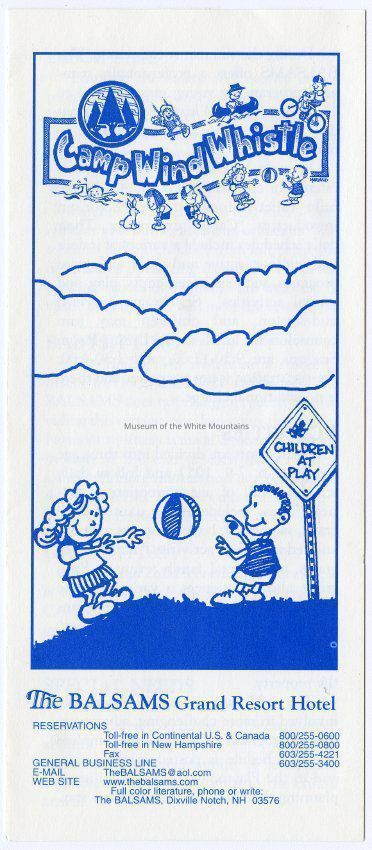 A Brochure for Camp Wind Whistle at the Balsams Grand Resort Hotel. Enclosed are sections describing activities, etiquette, staff, registration, dining, dress, discipline, visits, babysitting, gratuities, and special needs. On the back is a 'Thank You' message from the Children's Program Director, John Kennedy.Acquisition