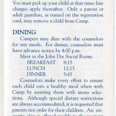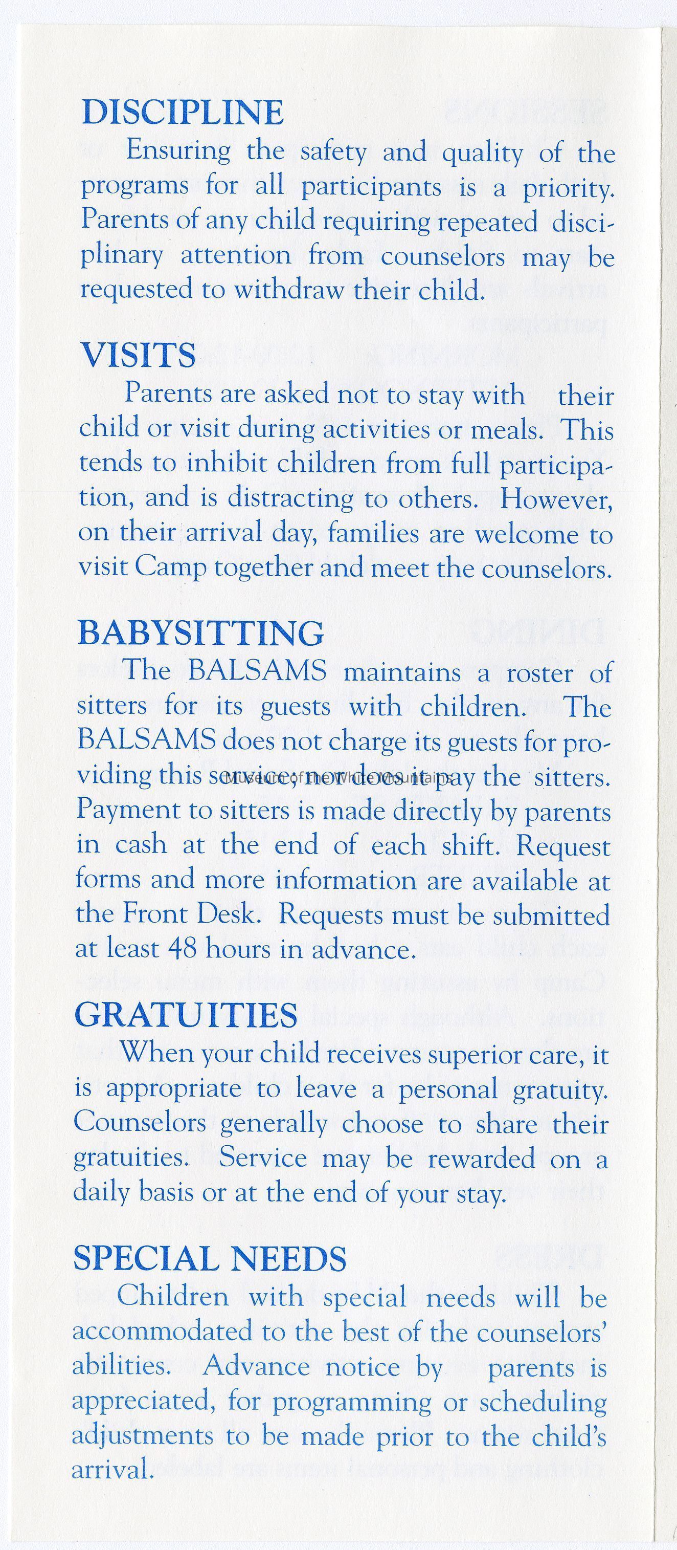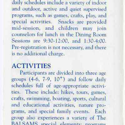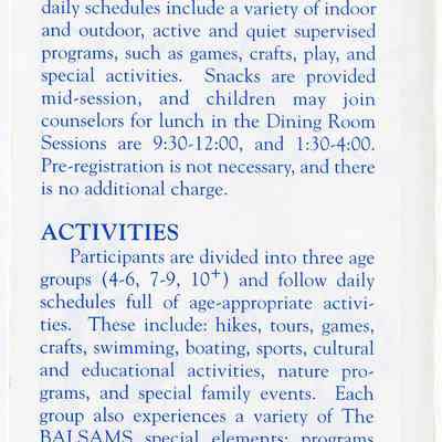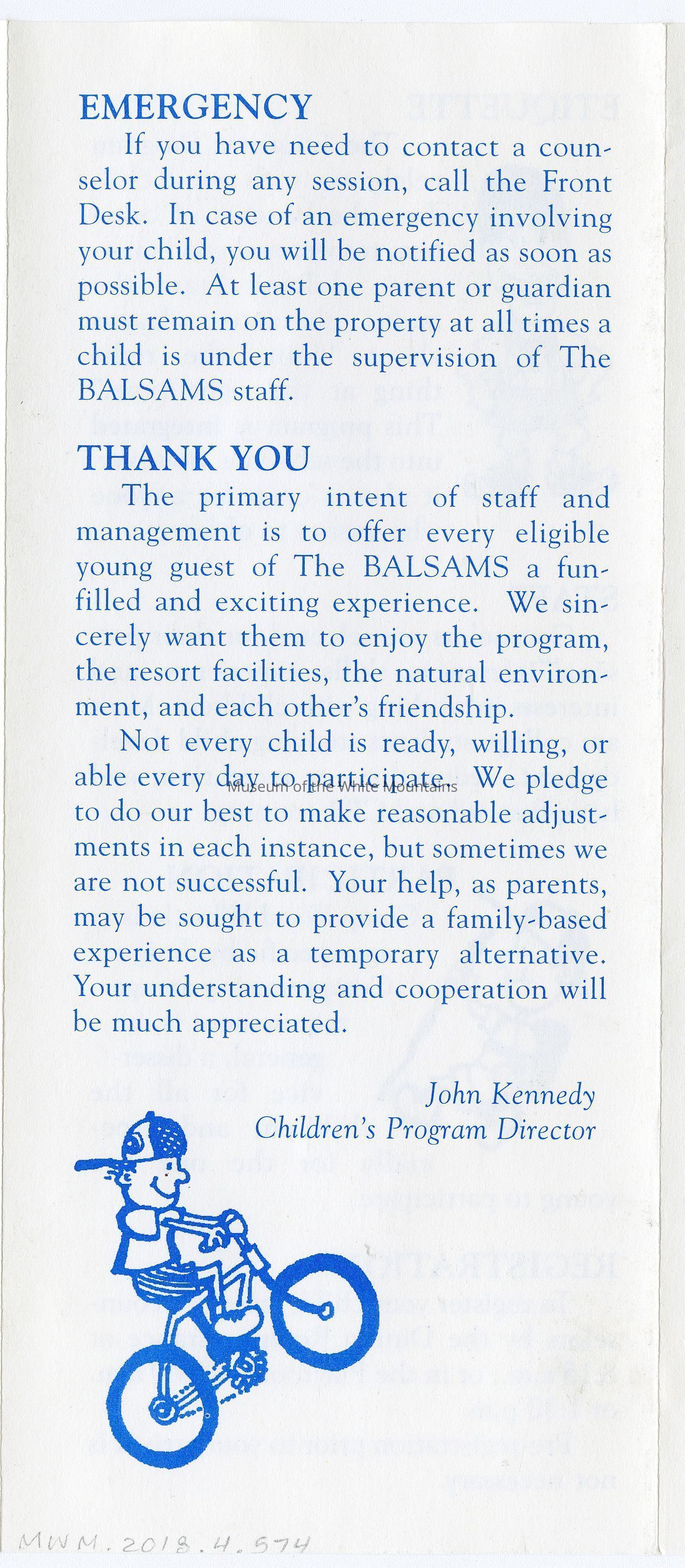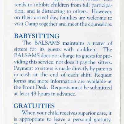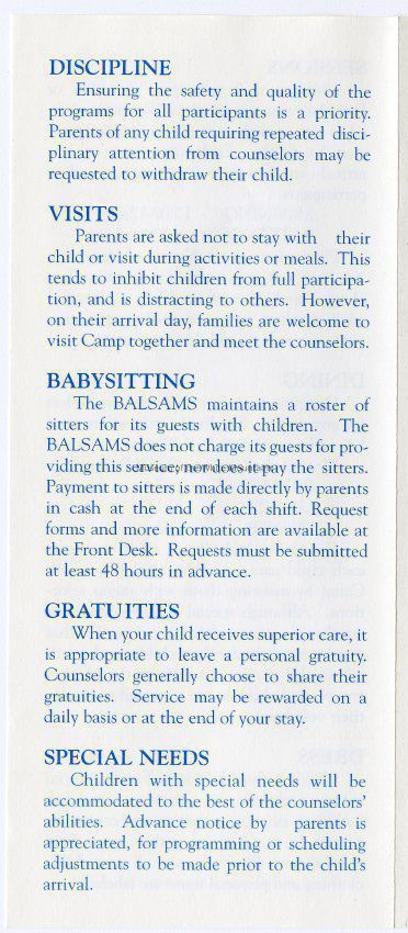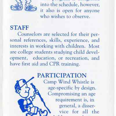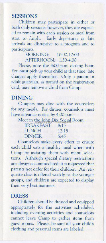 A Brochure for Camp Wind Whistle at the Balsams Grand Resort Hotel. Enclosed are sections describing activities, etiquette, staff, registration, dining, dress, discipline, visits, babysitting, gratuities, and special needs. On the back is a 'Thank You' message from the Children's Program Director, John Kennedy.Acquisition