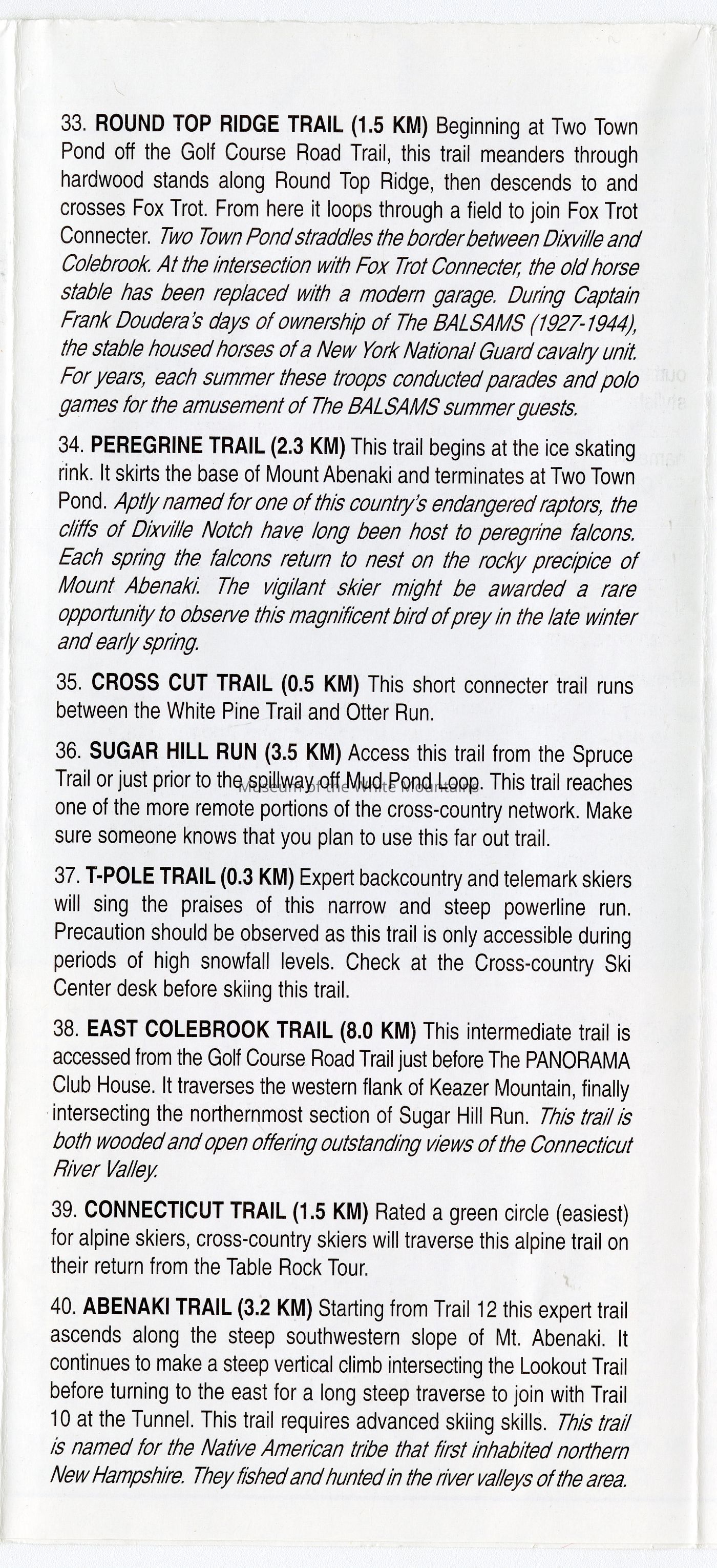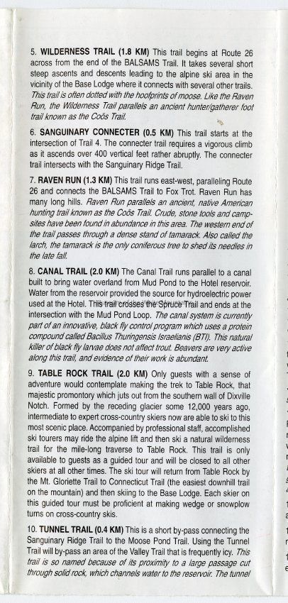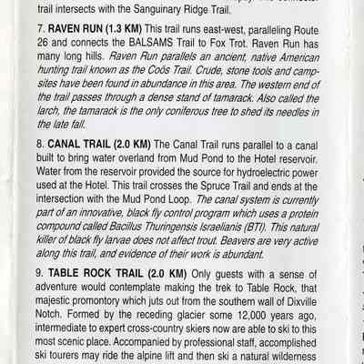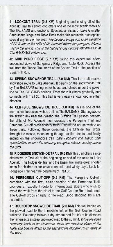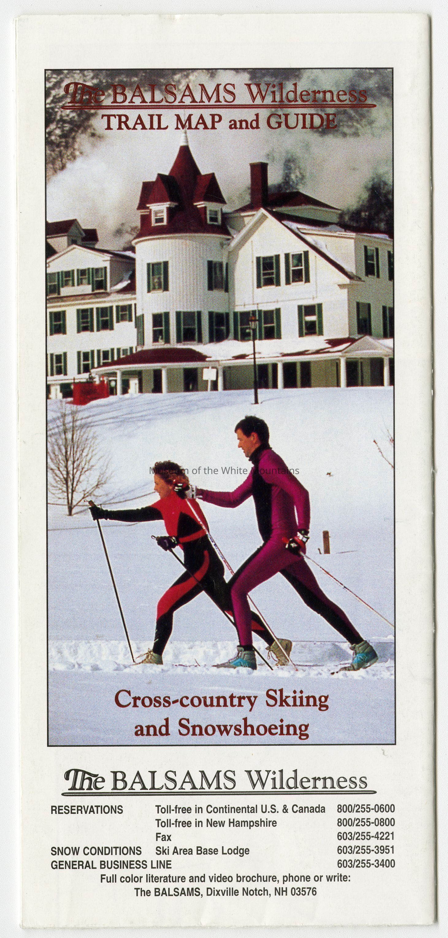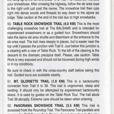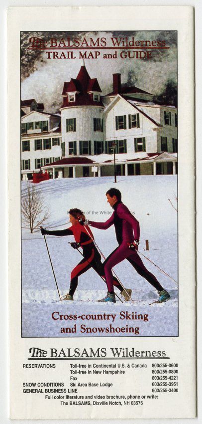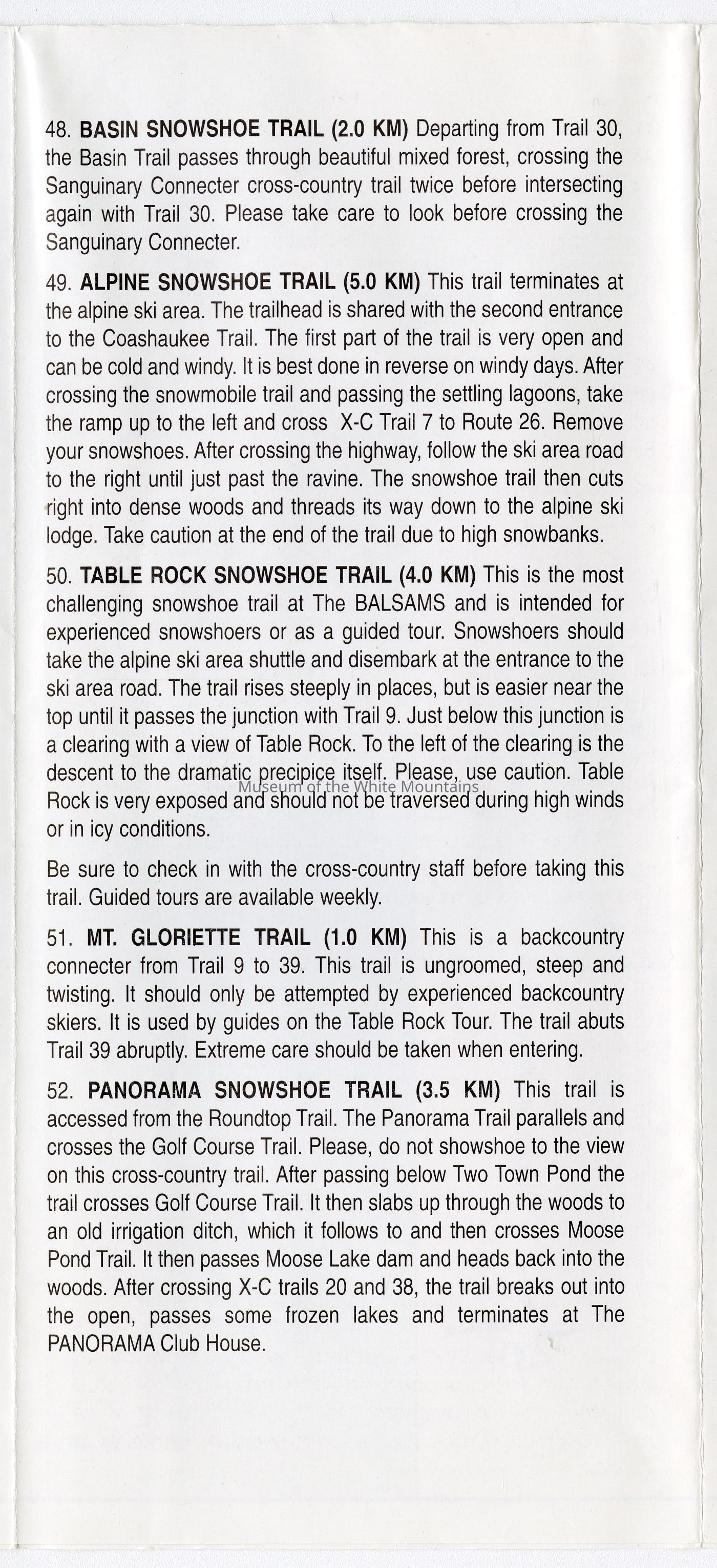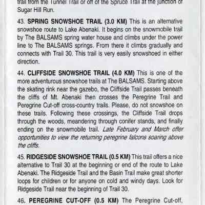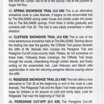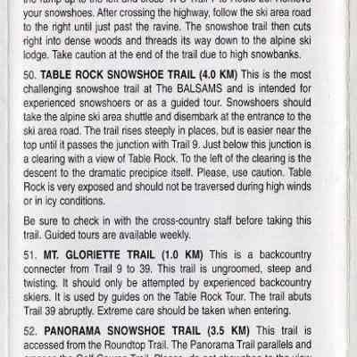 Trail map and guide for cross-country skiing and snow shoeing in the Balsams Wilderness. Enclosed are a list of 52 total trails from the Gold Course Road trail to the Panorama Snow Shoe trail. On the back there is a full map showing all 52 trails along with their difficulty. Under each trail is a description along with natural history annotations in italics.