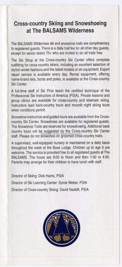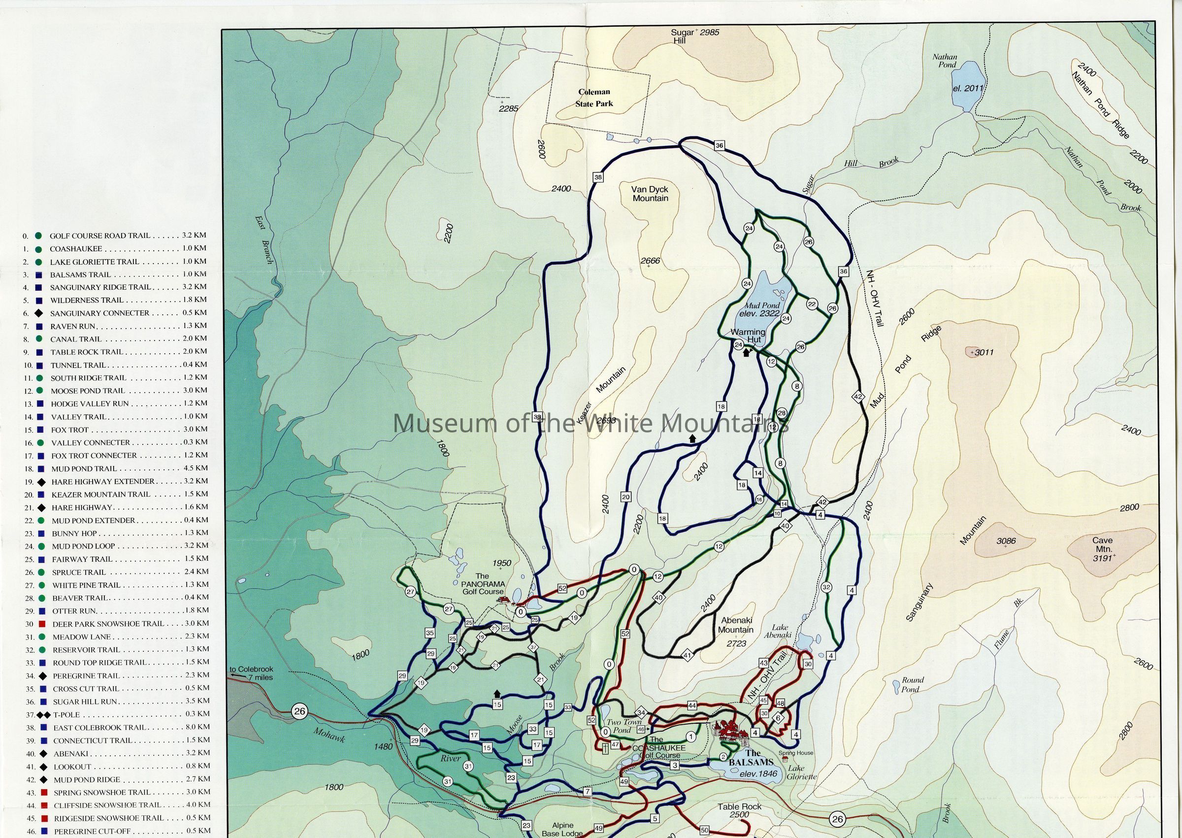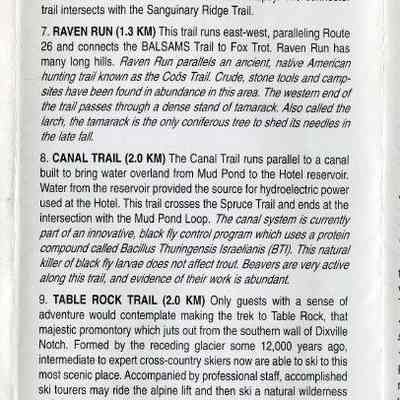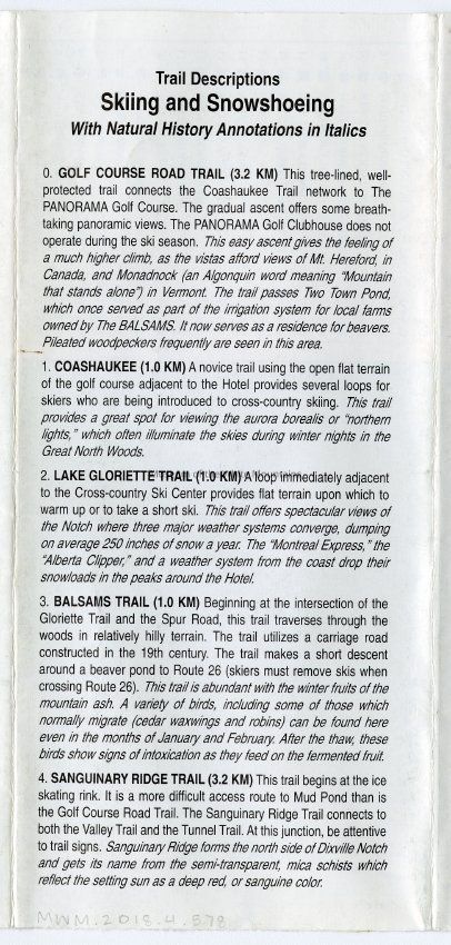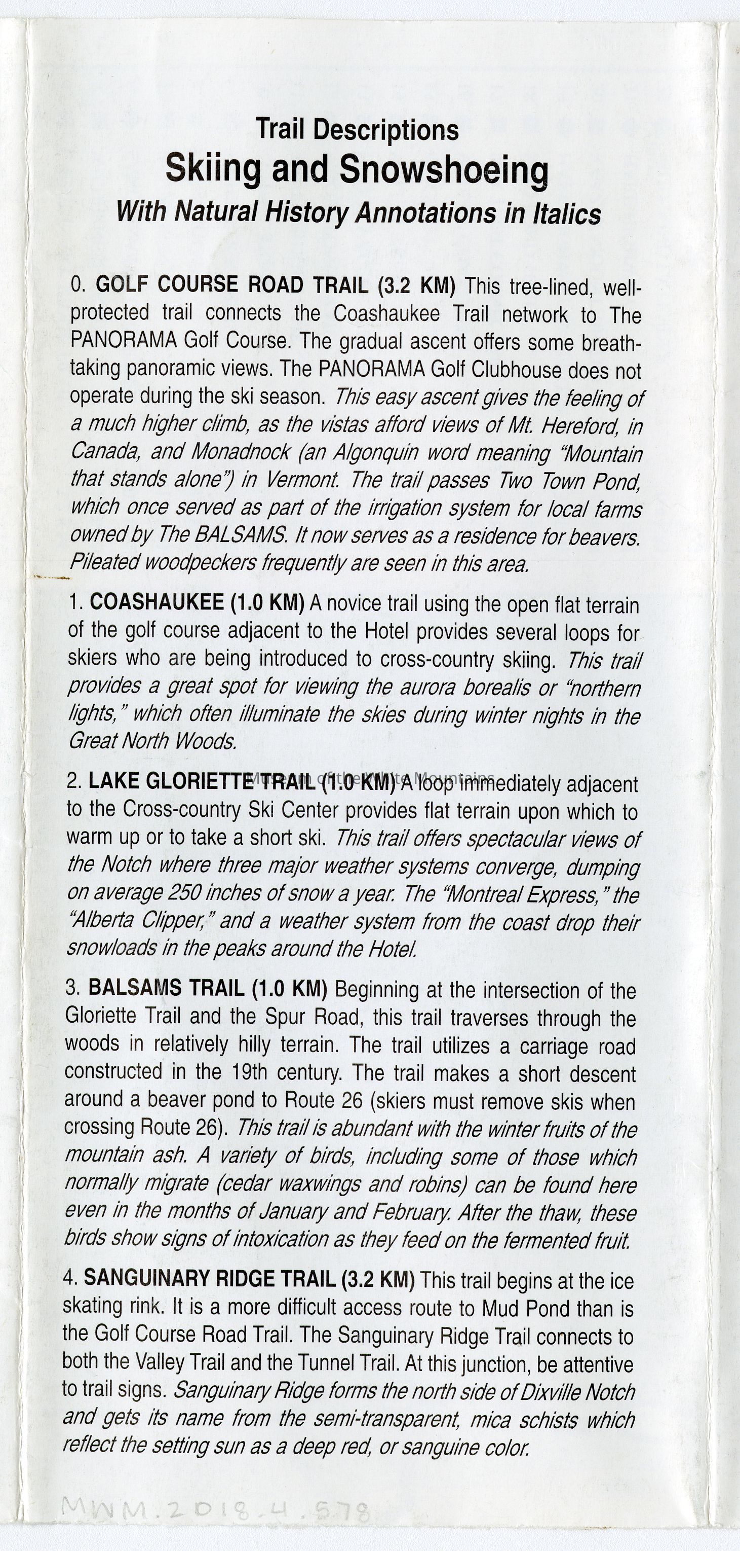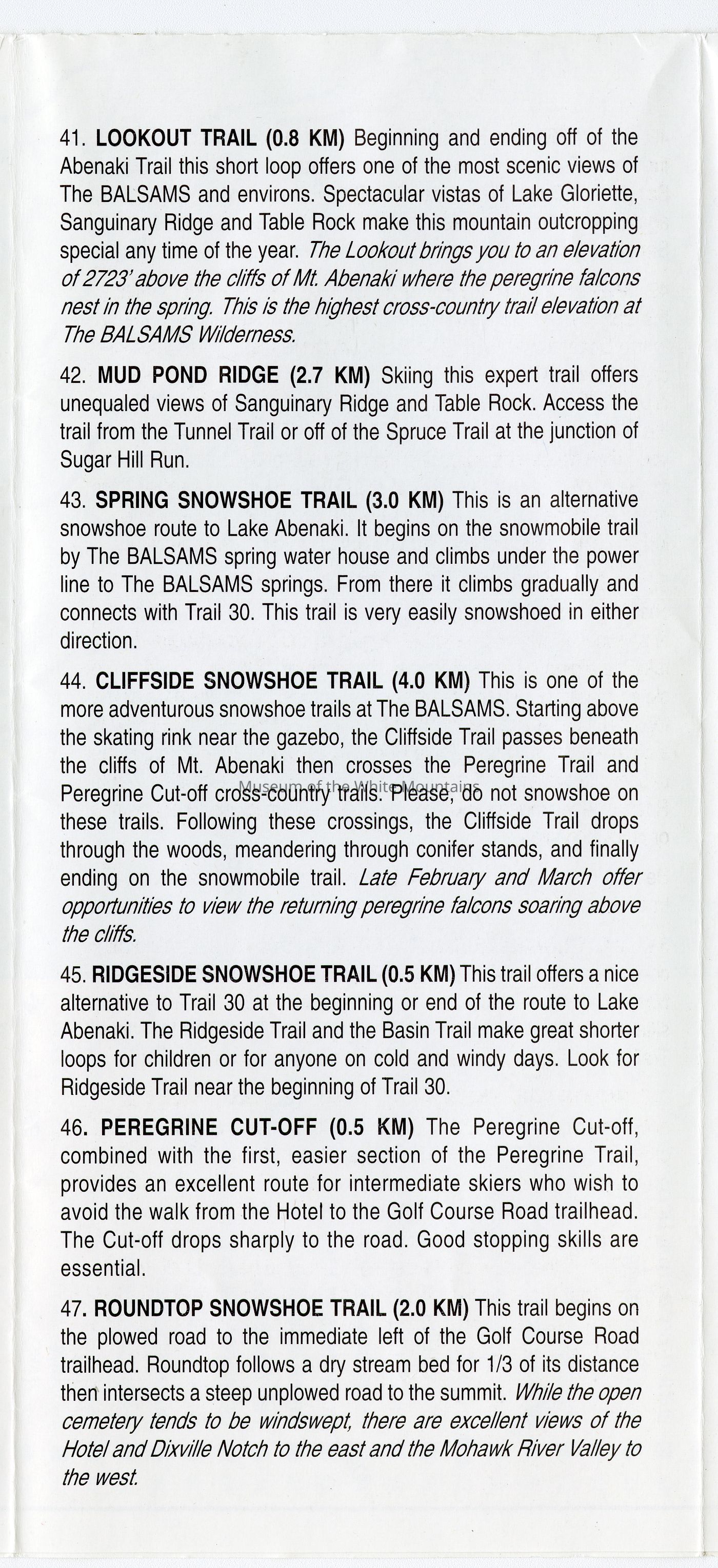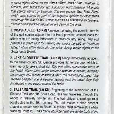 Trail map and guide for cross-country skiing and snow shoeing in the Balsams Wilderness. Enclosed are a list of 52 total trails from the Gold Course Road trail to the Panorama Snow Shoe trail. On the back there is a full map showing all 52 trails along with their difficulty. Under each trail is a description along with natural history annotations in italics.