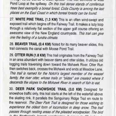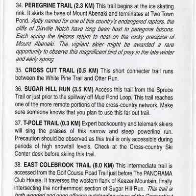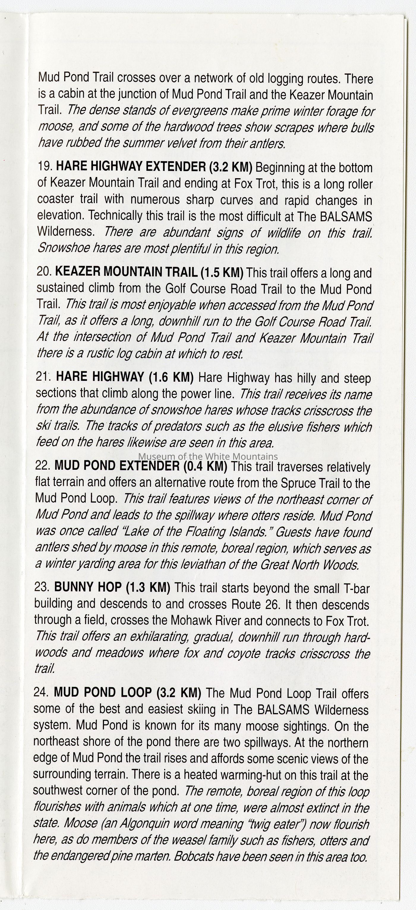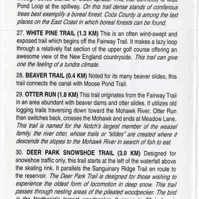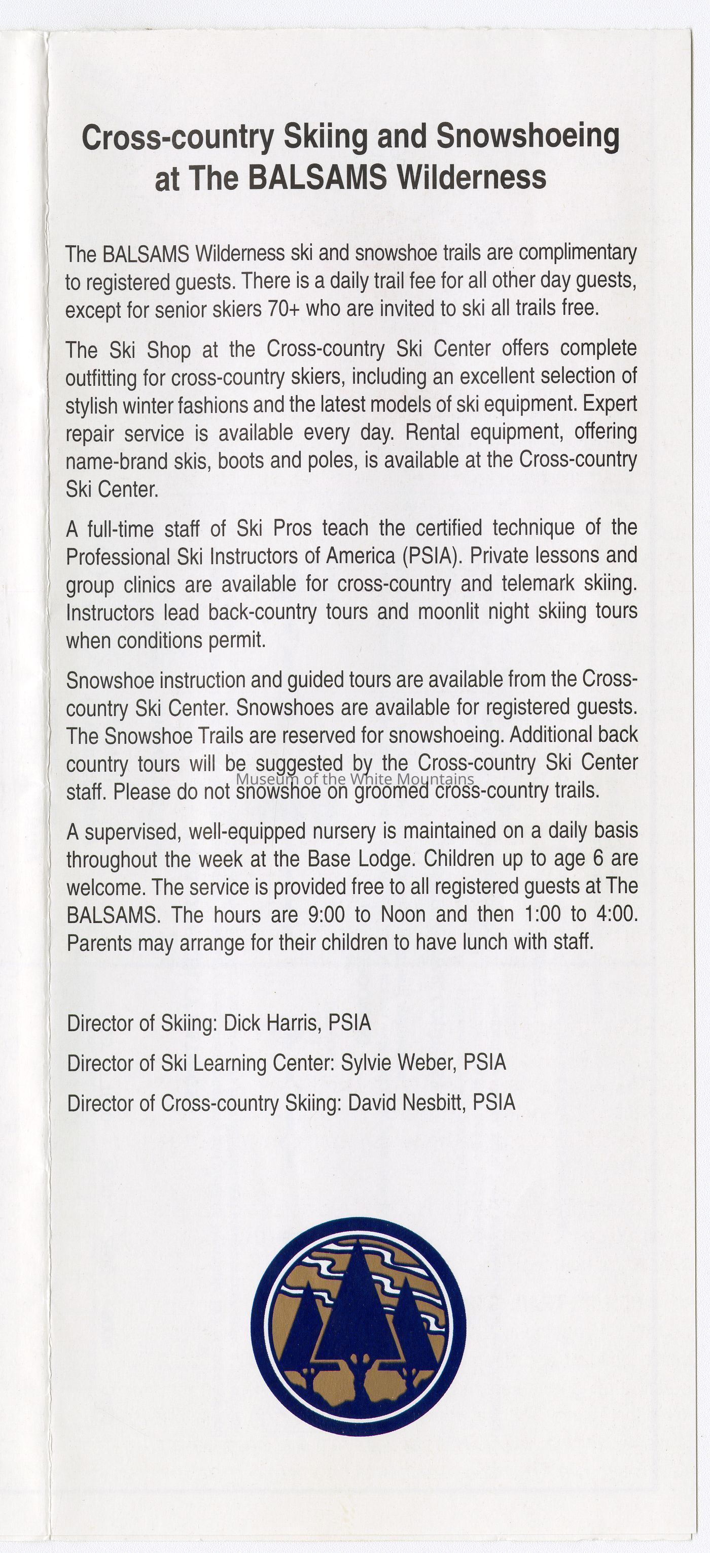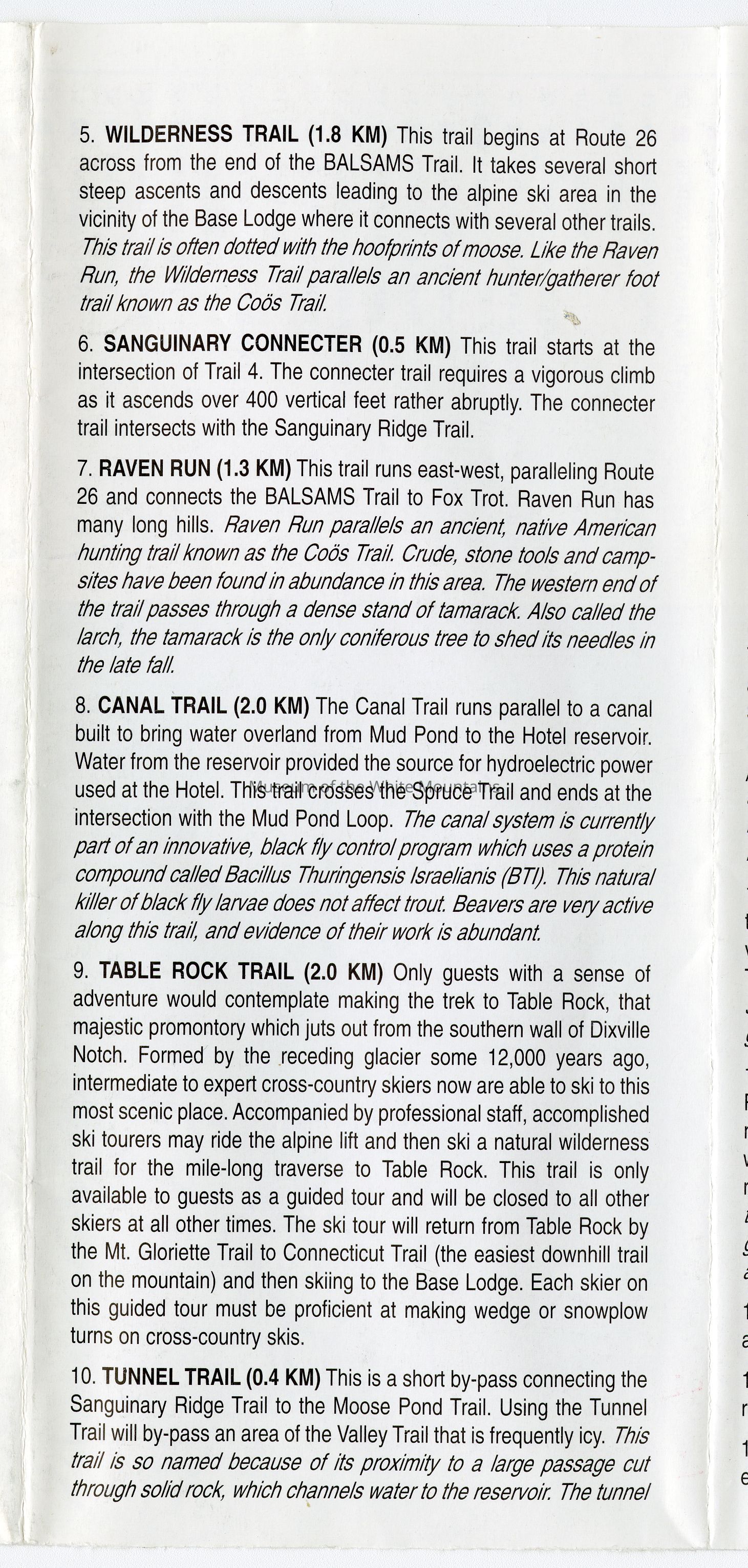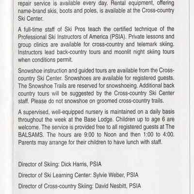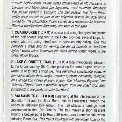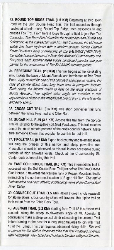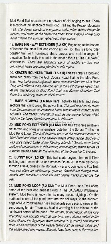 Trail map and guide for cross-country skiing and snow shoeing in the Balsams Wilderness. Enclosed are a list of 52 total trails from the Gold Course Road trail to the Panorama Snow Shoe trail. On the back there is a full map showing all 52 trails along with their difficulty. Under each trail is a description along with natural history annotations in italics.