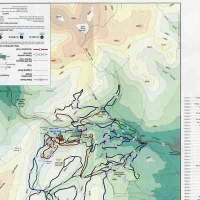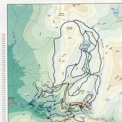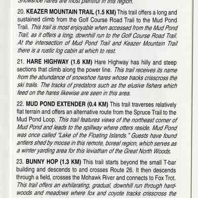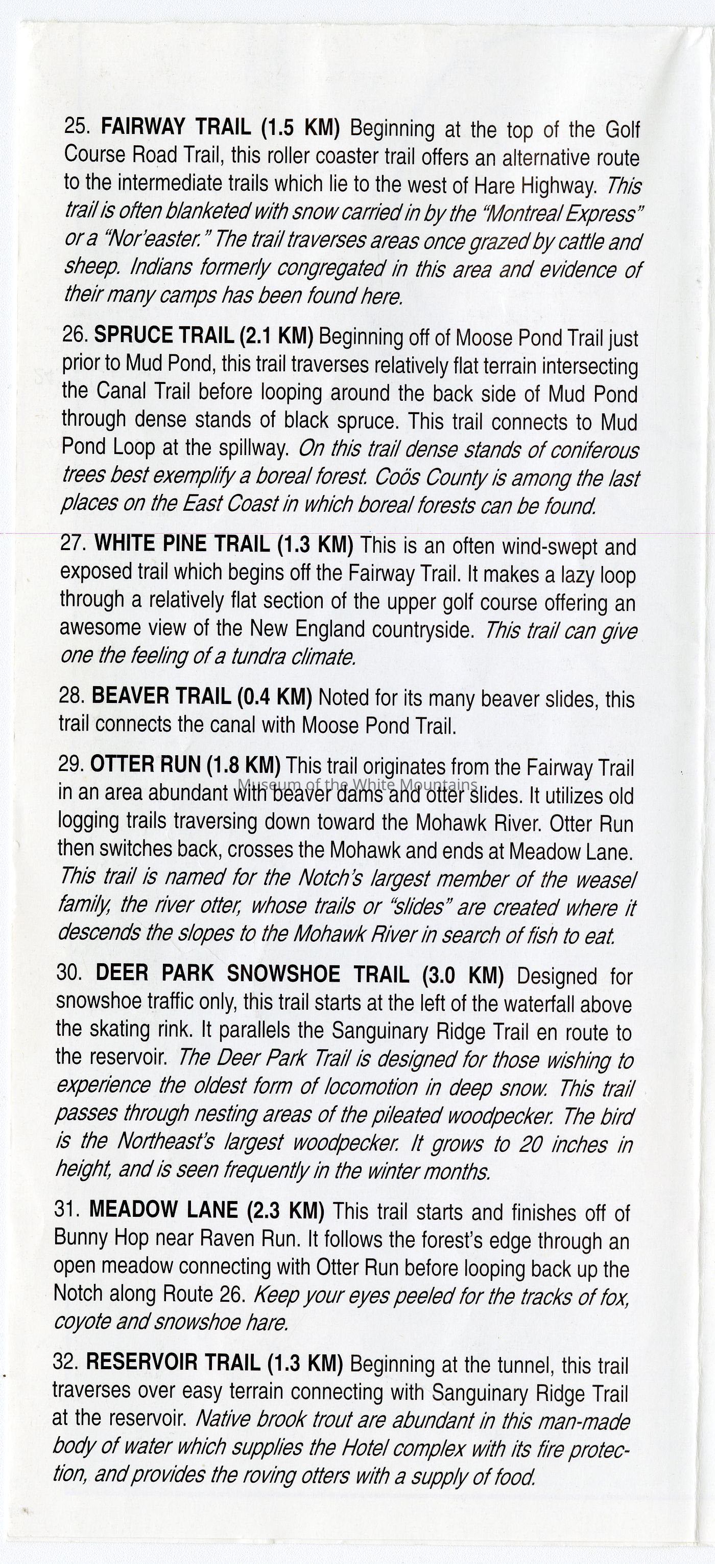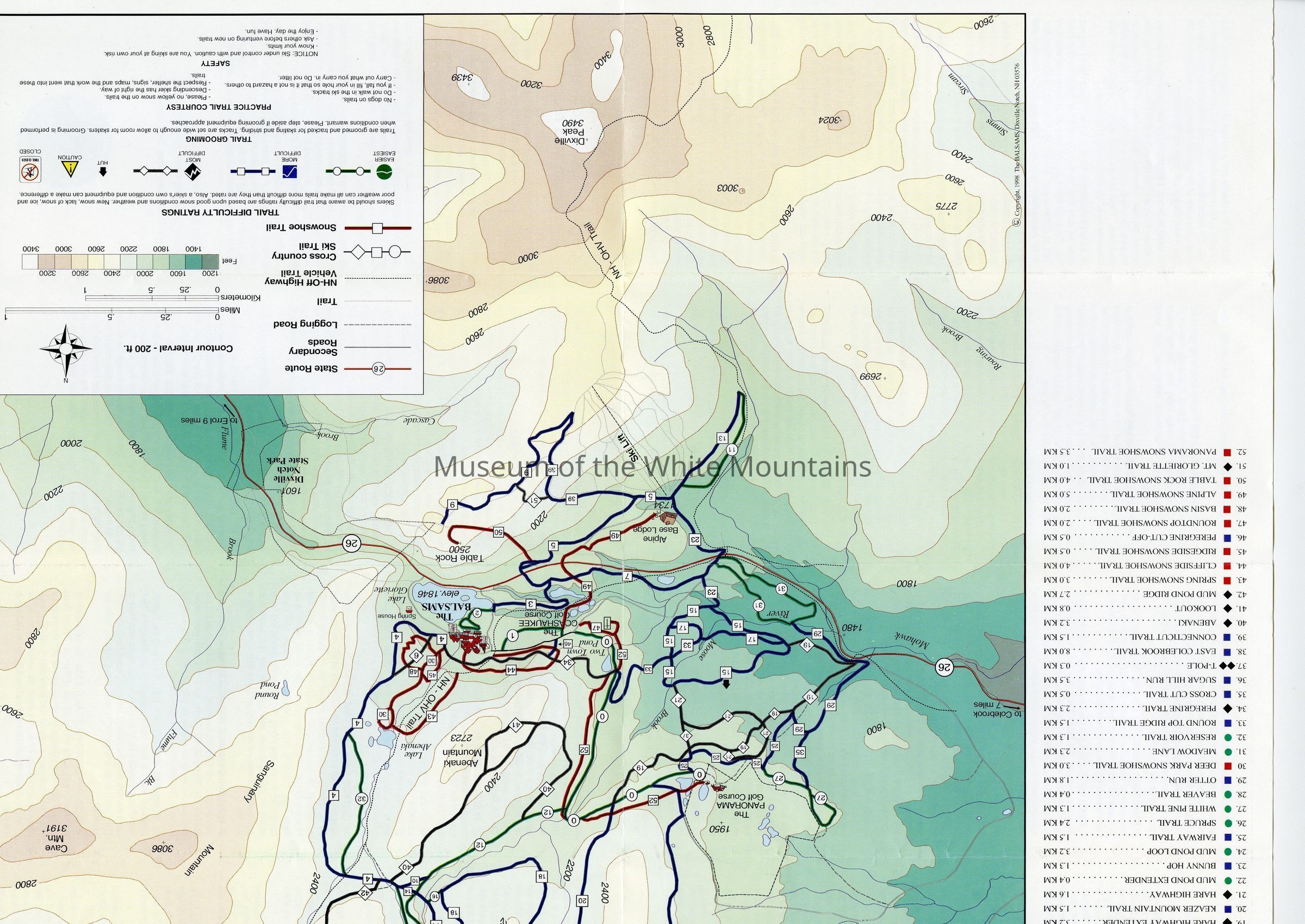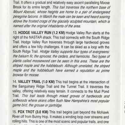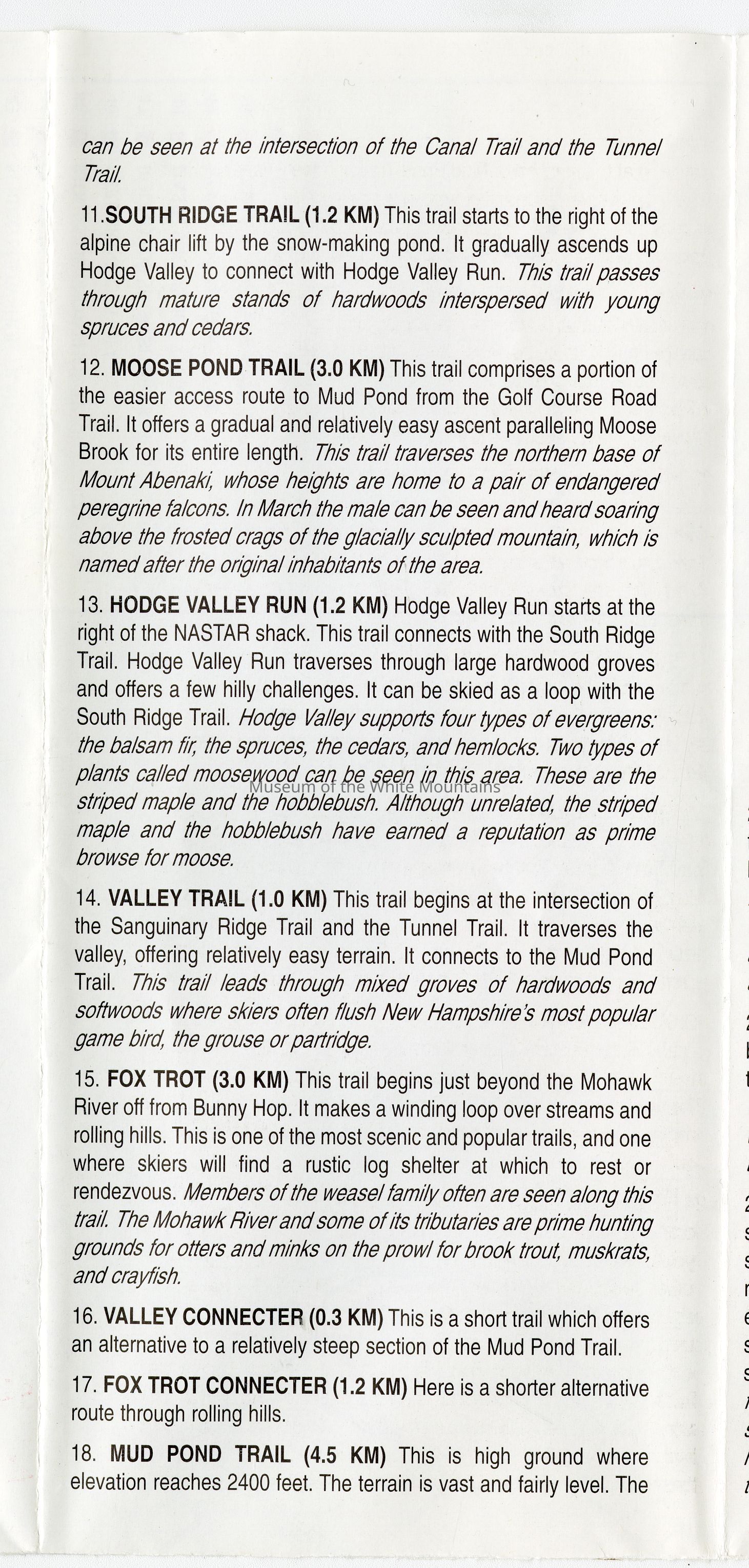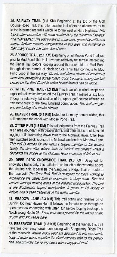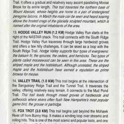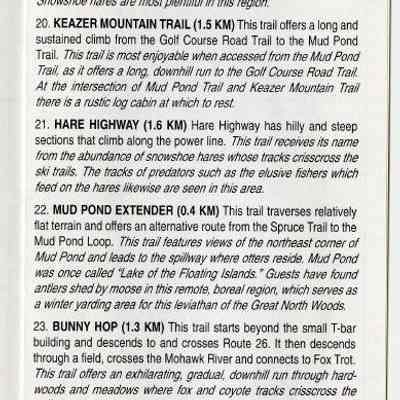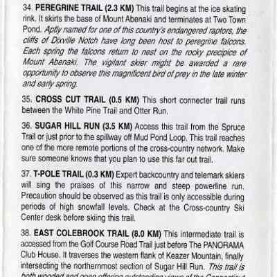 Trail map and guide for cross-country skiing and snow shoeing in the Balsams Wilderness. Enclosed are a list of 52 total trails from the Gold Course Road trail to the Panorama Snow Shoe trail. On the back there is a full map showing all 52 trails along with their difficulty. Under each trail is a description along with natural history annotations in italics.