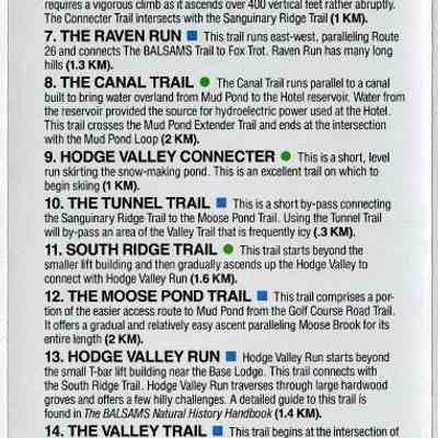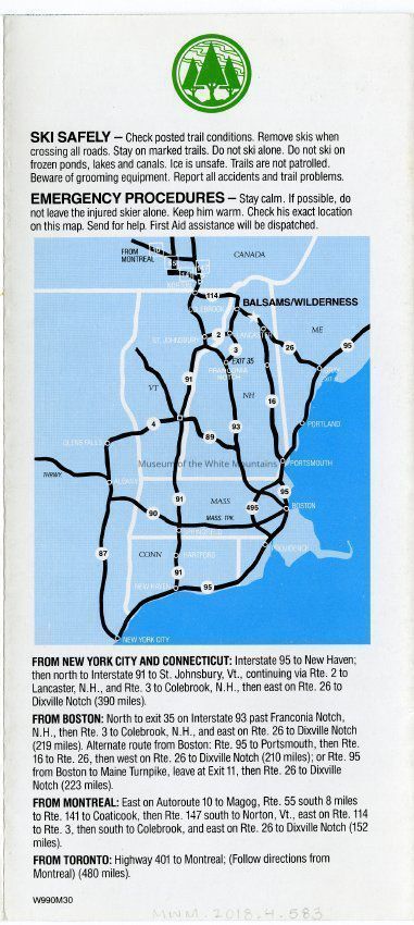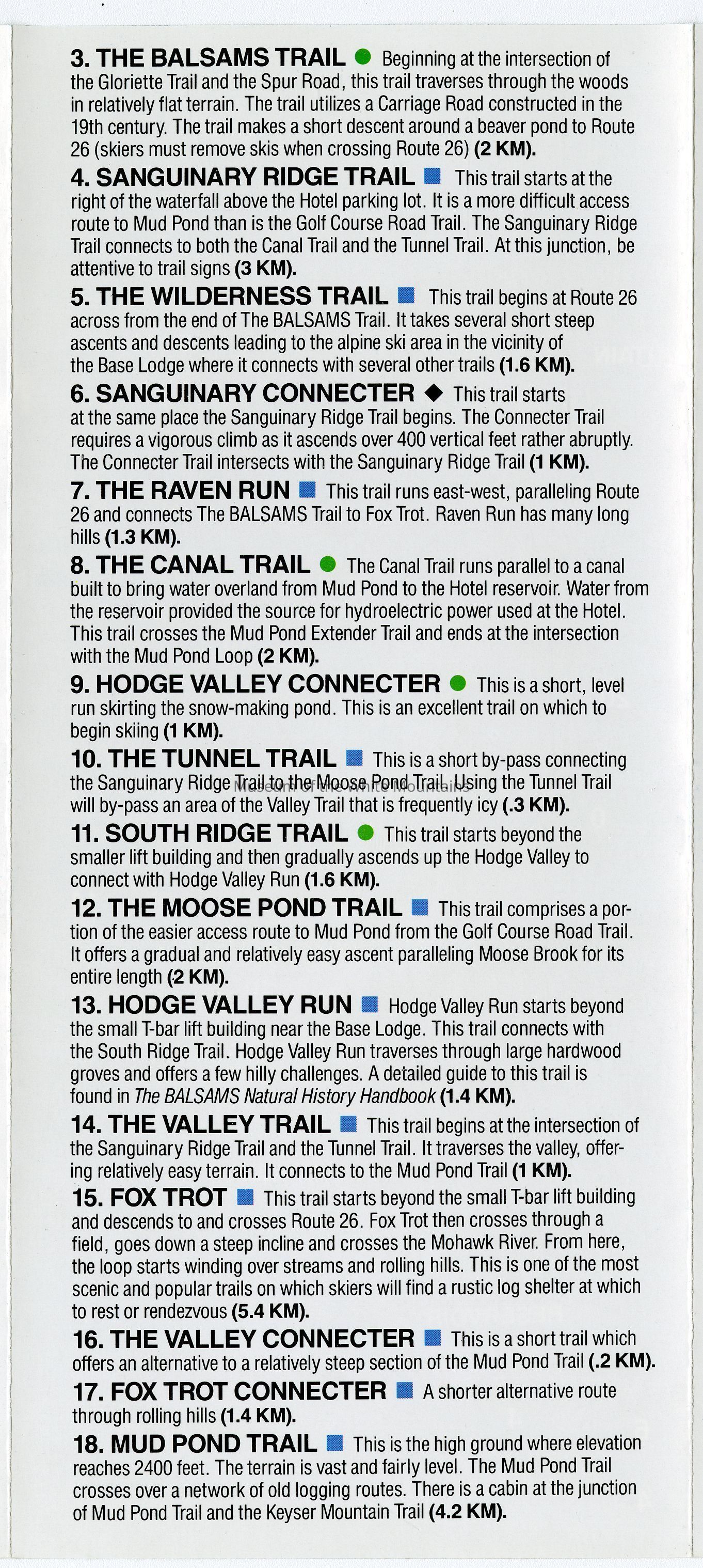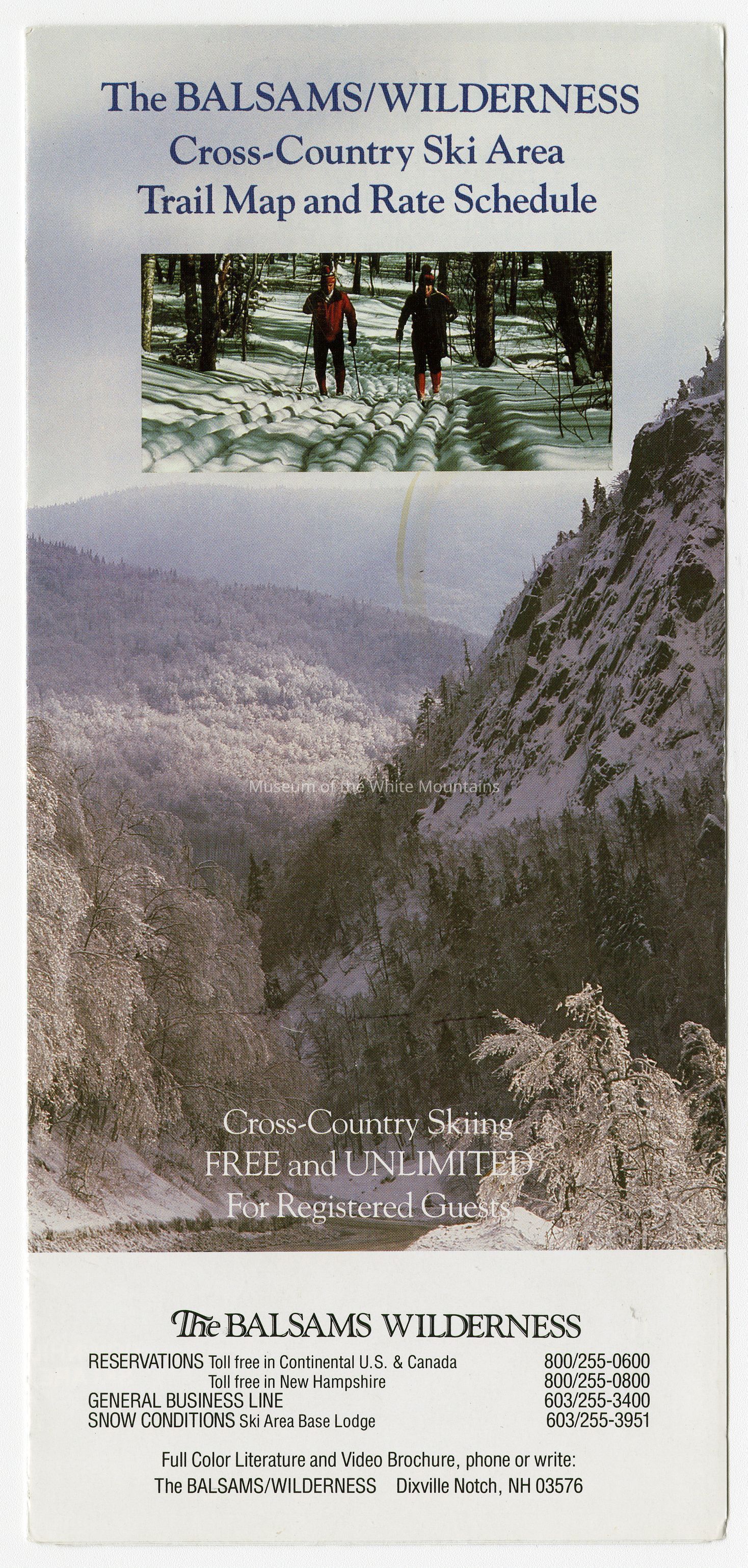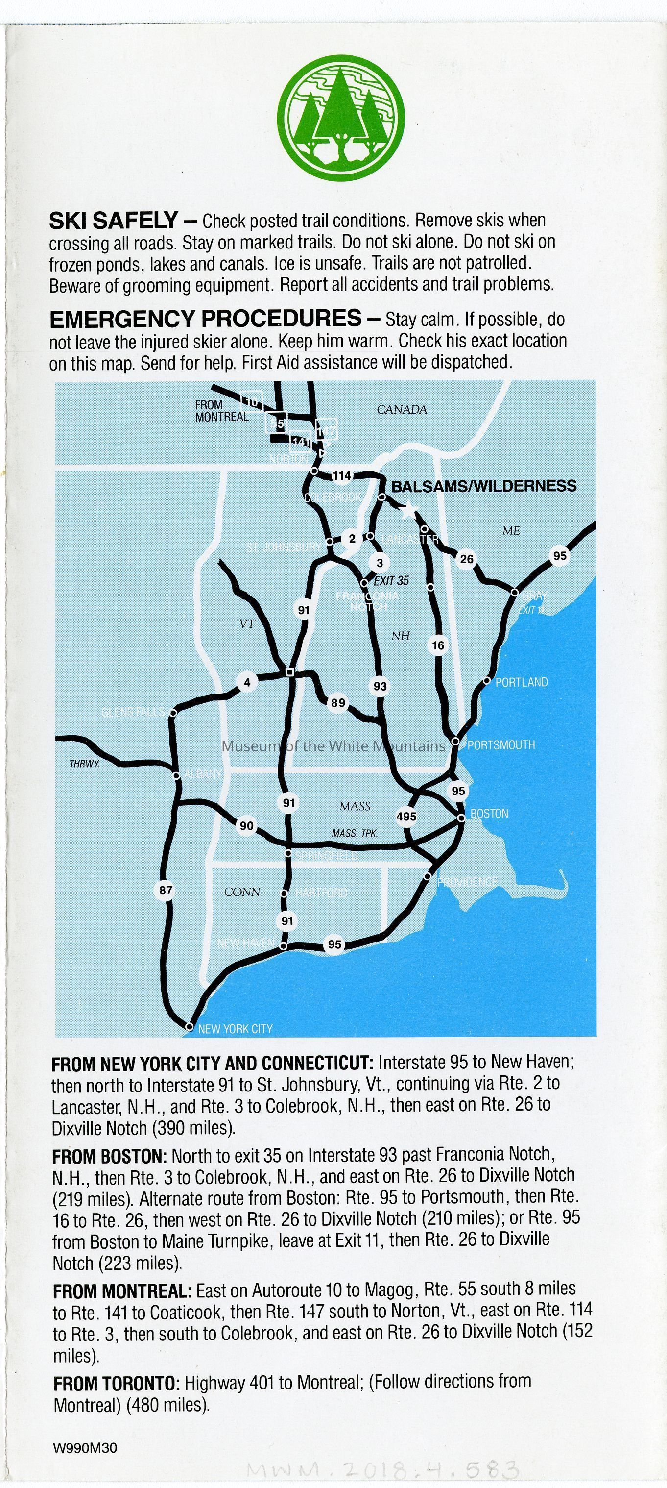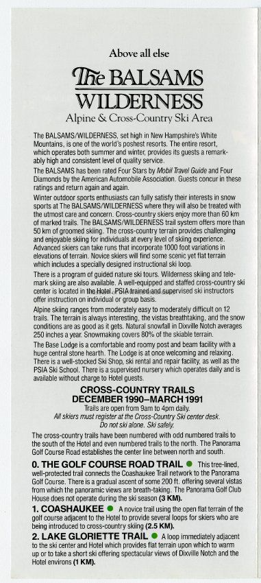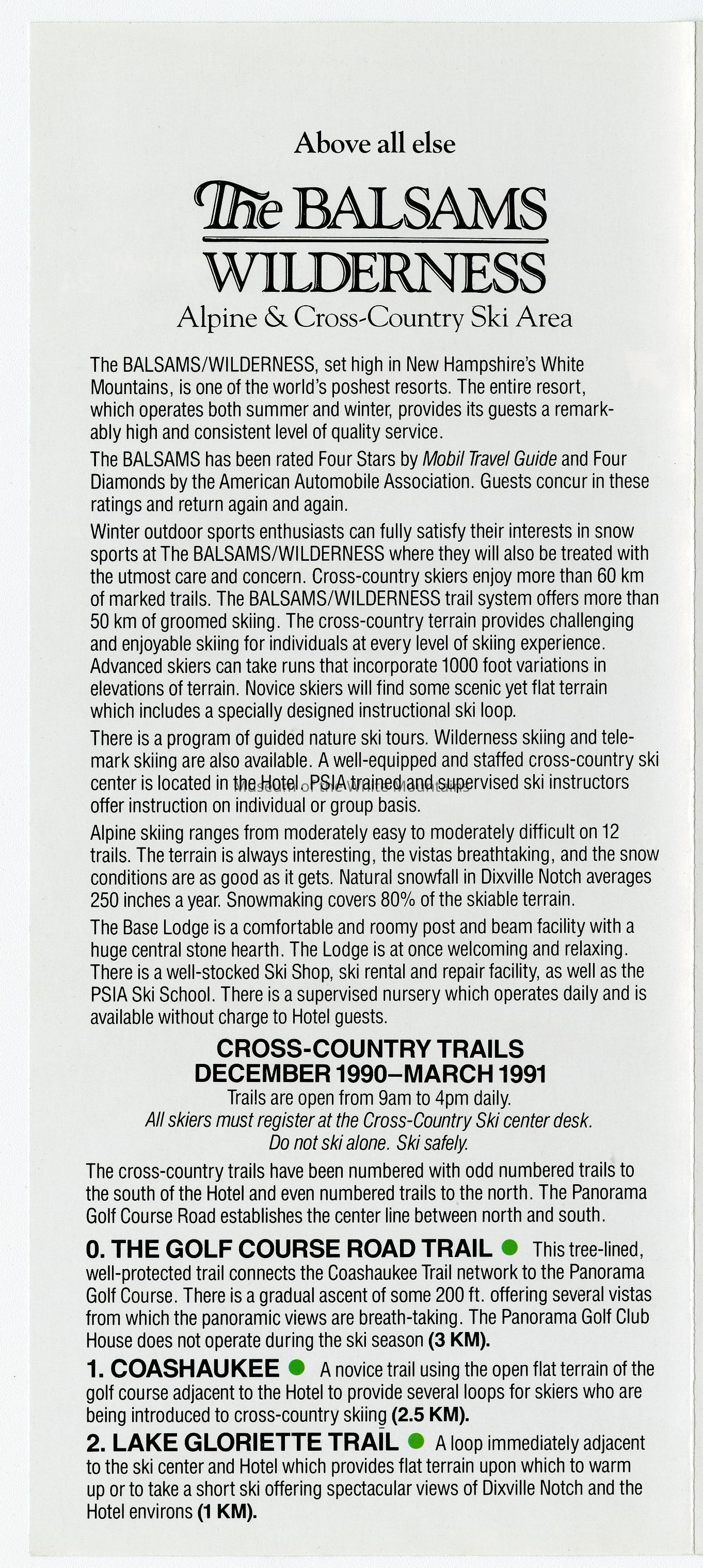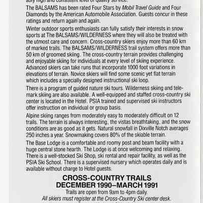 Brochure from the Balsams winter season of 1990-1991. Enclosed is a trail map and legend, along with 25 trails with descriptions, and daily trail fees. On the back is a section on emergency procedures and a reminder to ski safely along with a map and directions to the hotel from New York City, Connecticut, Boston, Montreal and Toronto.Acquisition