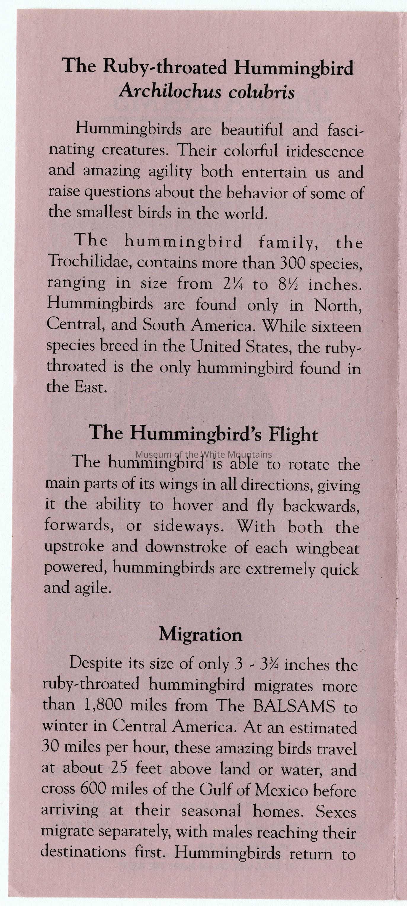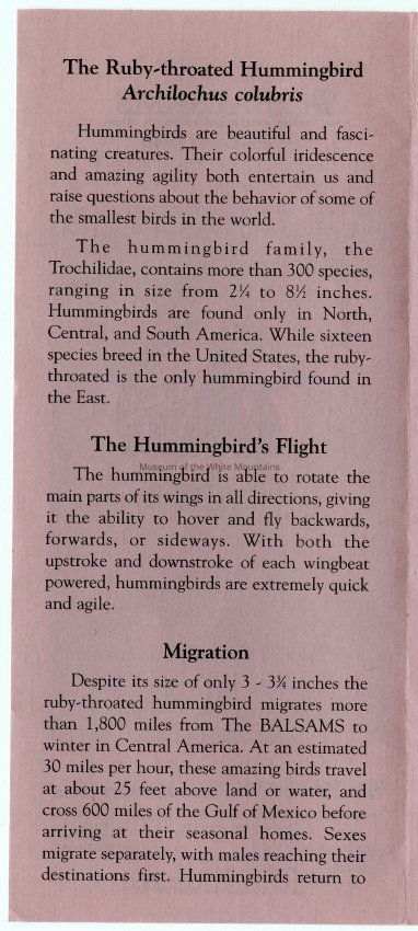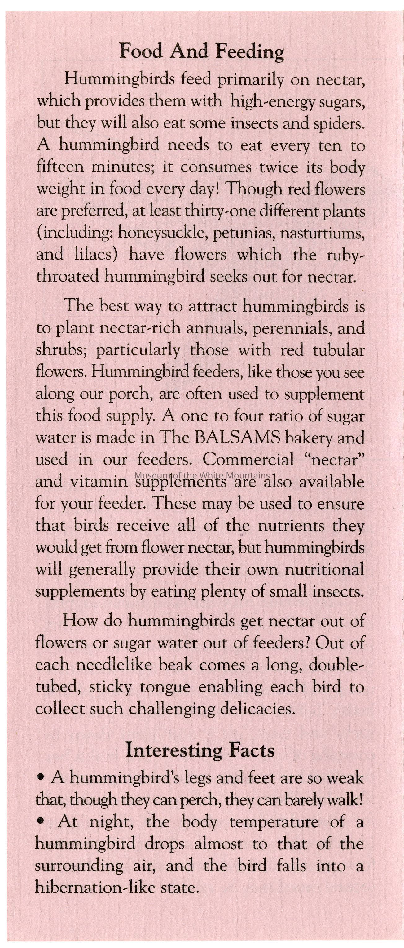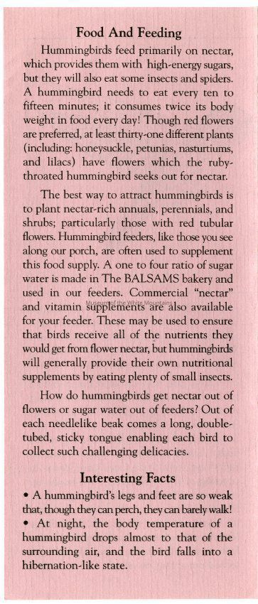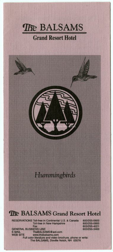 Brochure from the Balsams Grand Resort Hotel about hummingbirds. Enclosed are sections about the ruby-throated hummingbird, the hummingbird's flight, migration, breeding, food and feeding, intersting facts, and how to care for your hummingbird feeders.Acquisition