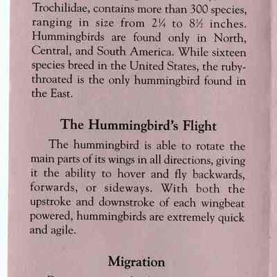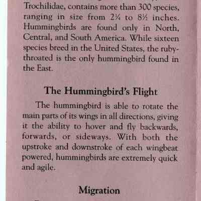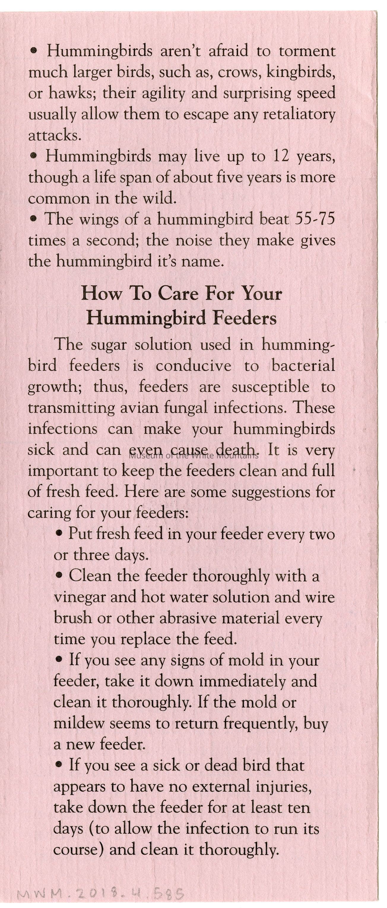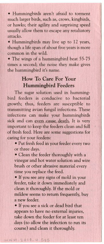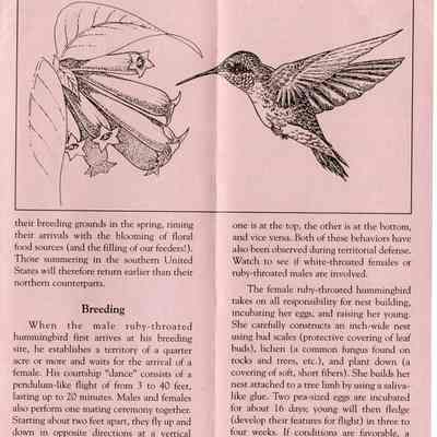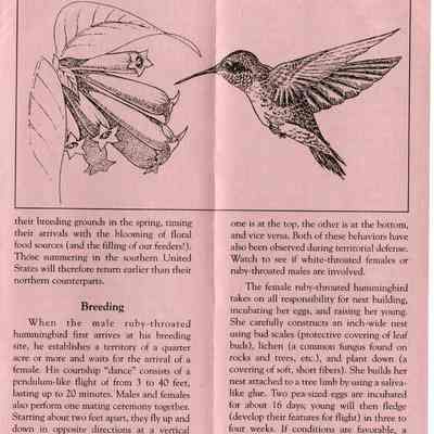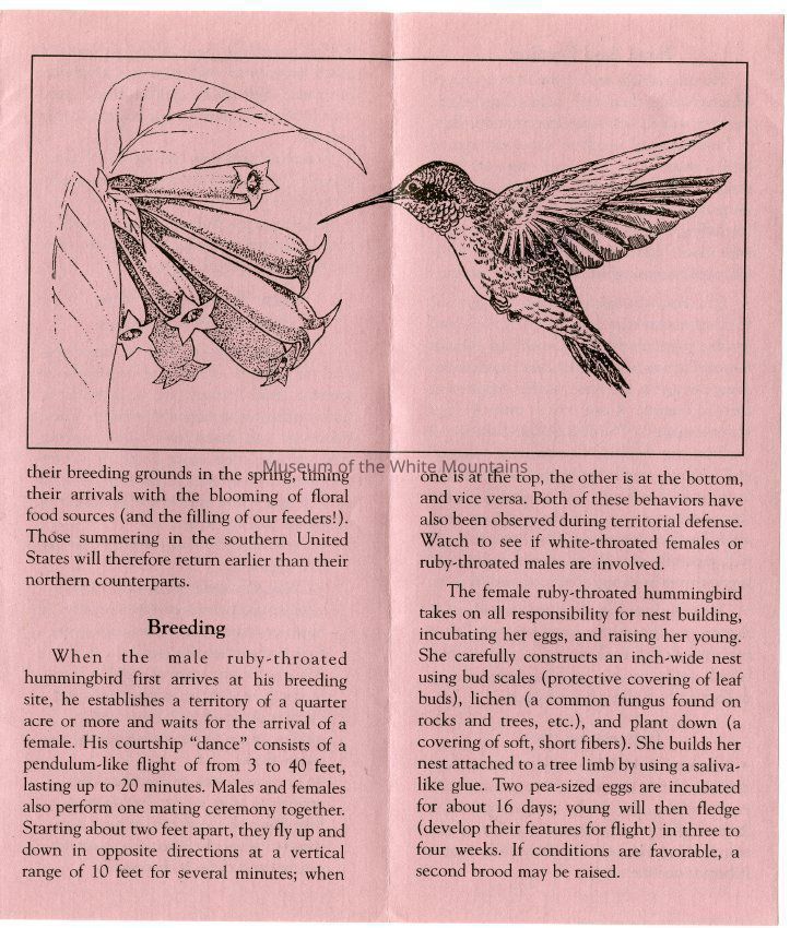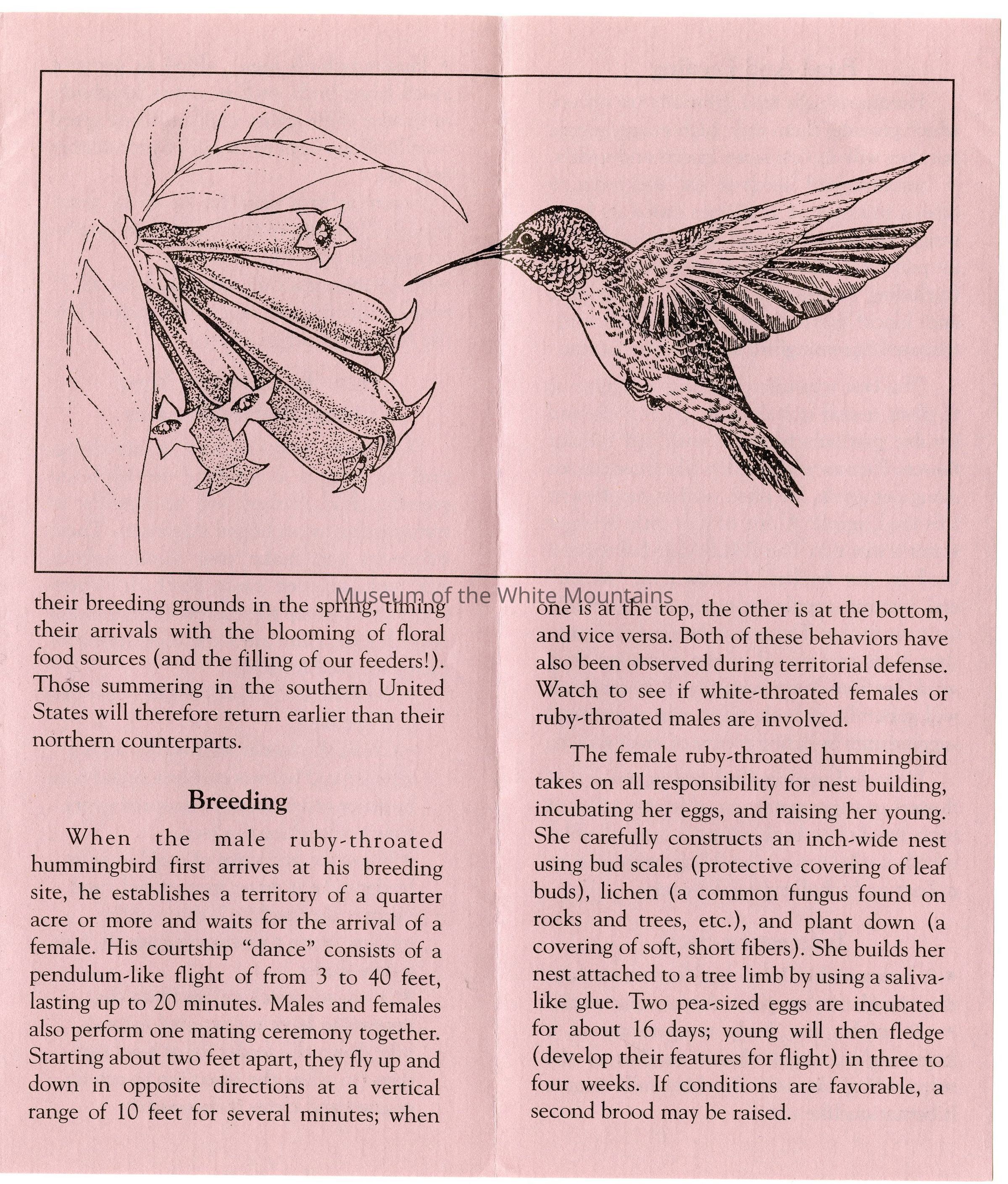 Brochure from the Balsams Grand Resort Hotel about hummingbirds. Enclosed are sections about the ruby-throated hummingbird, the hummingbird's flight, migration, breeding, food and feeding, intersting facts, and how to care for your hummingbird feeders.Acquisition