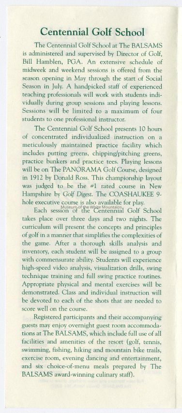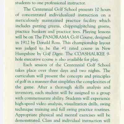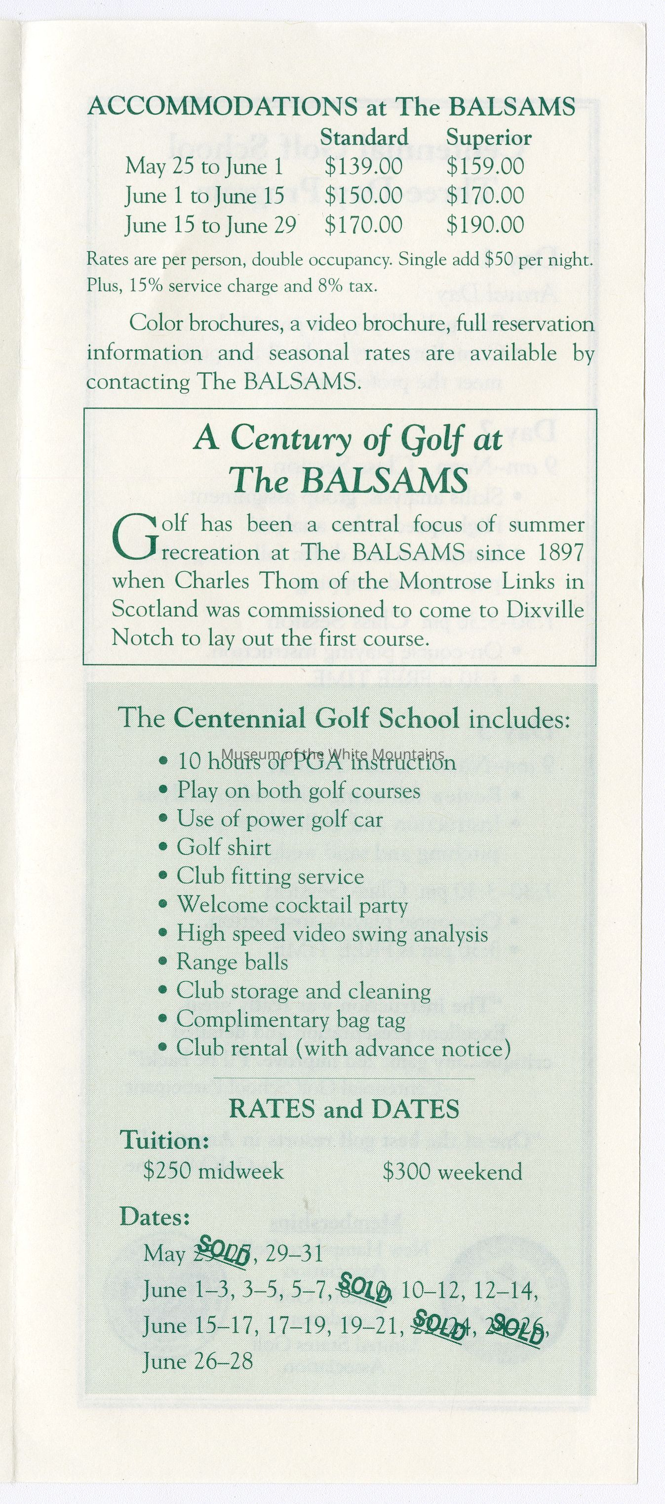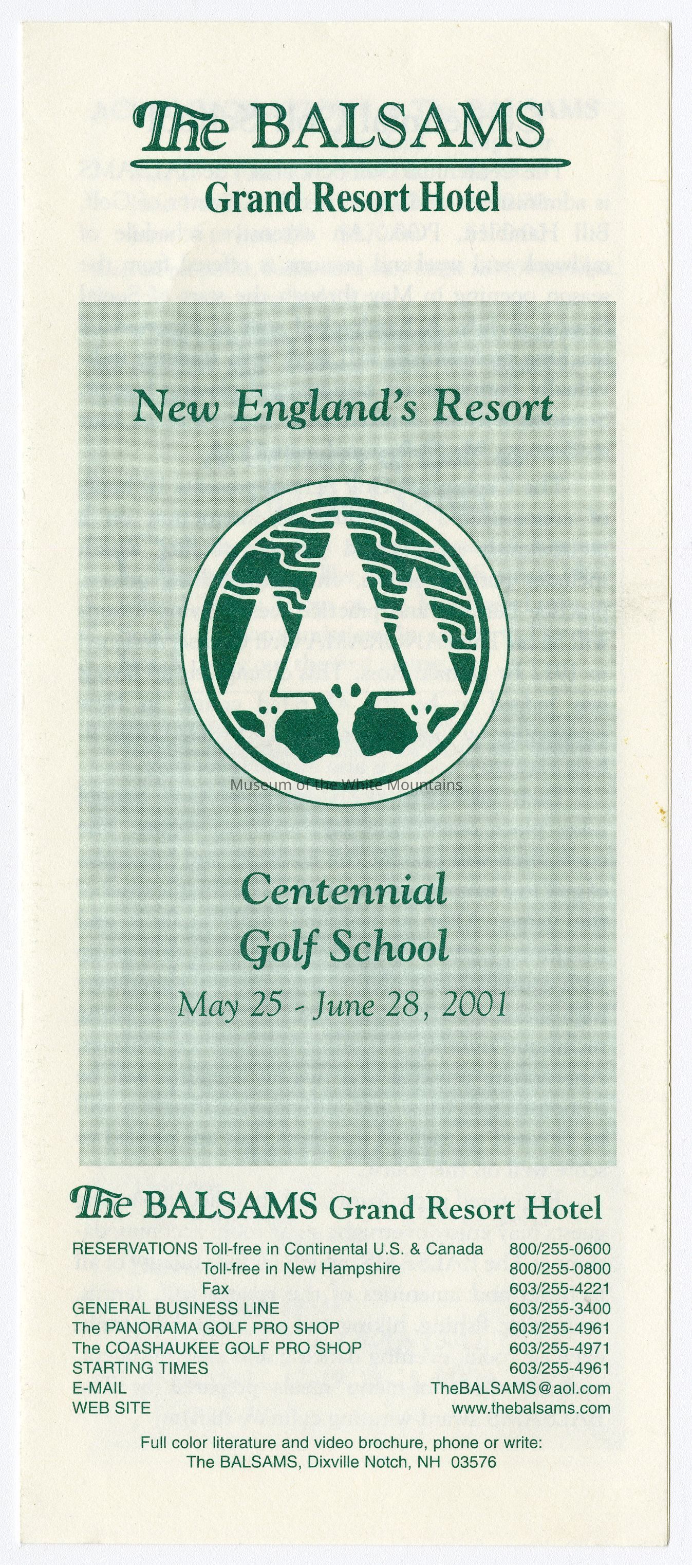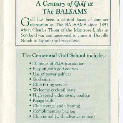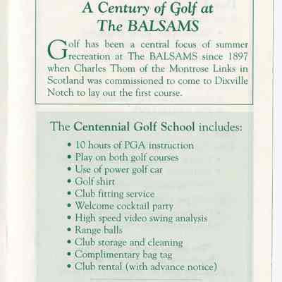 Brochure from the Balsams celebrating a century of golf at the hotel. Enclosed is information about the centennial golf school program along with rates and dates. On the back is a schedule for the three-day gold school program.