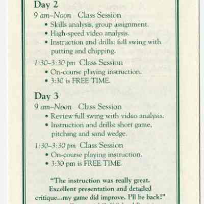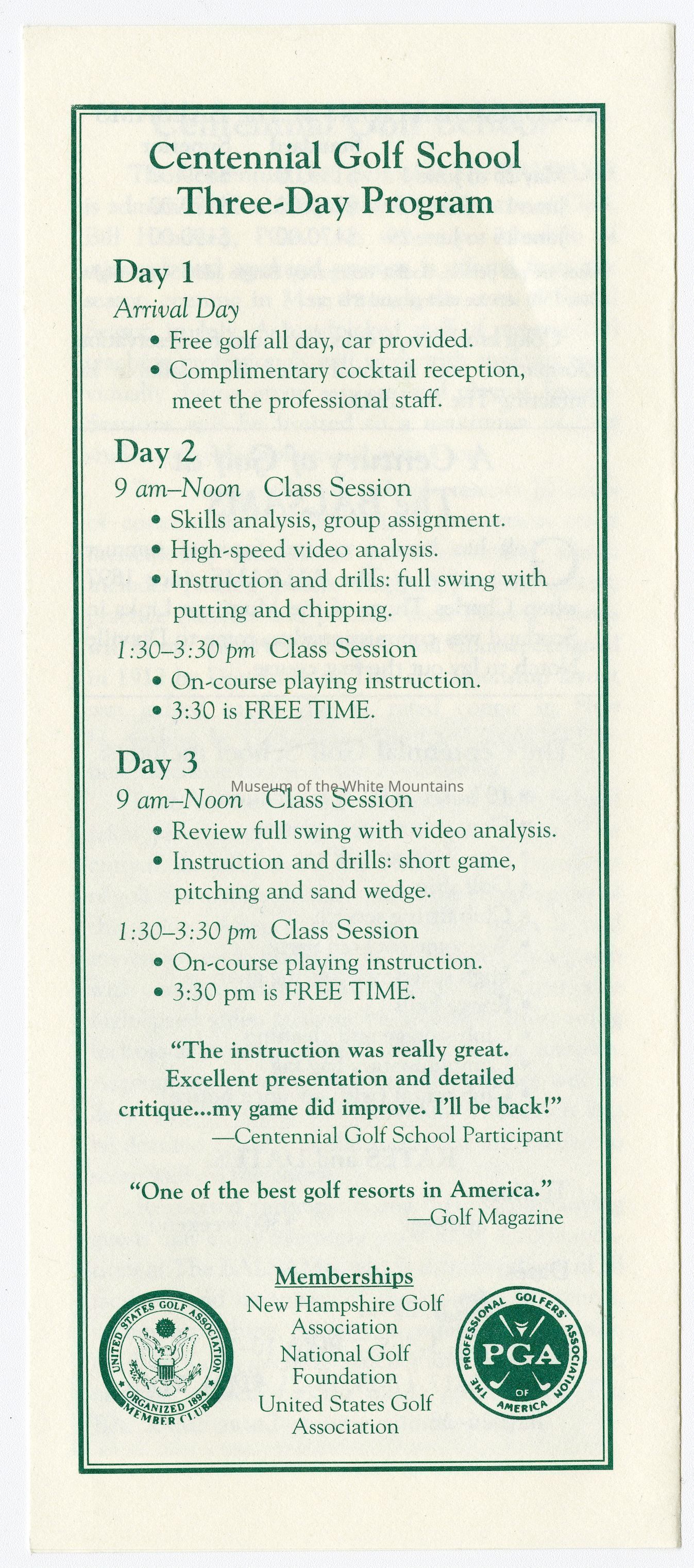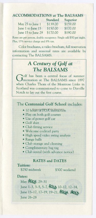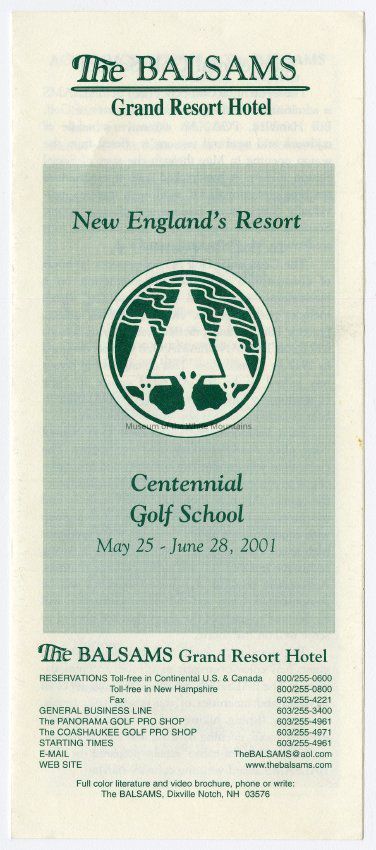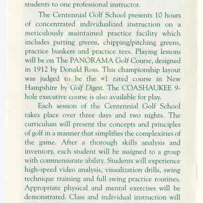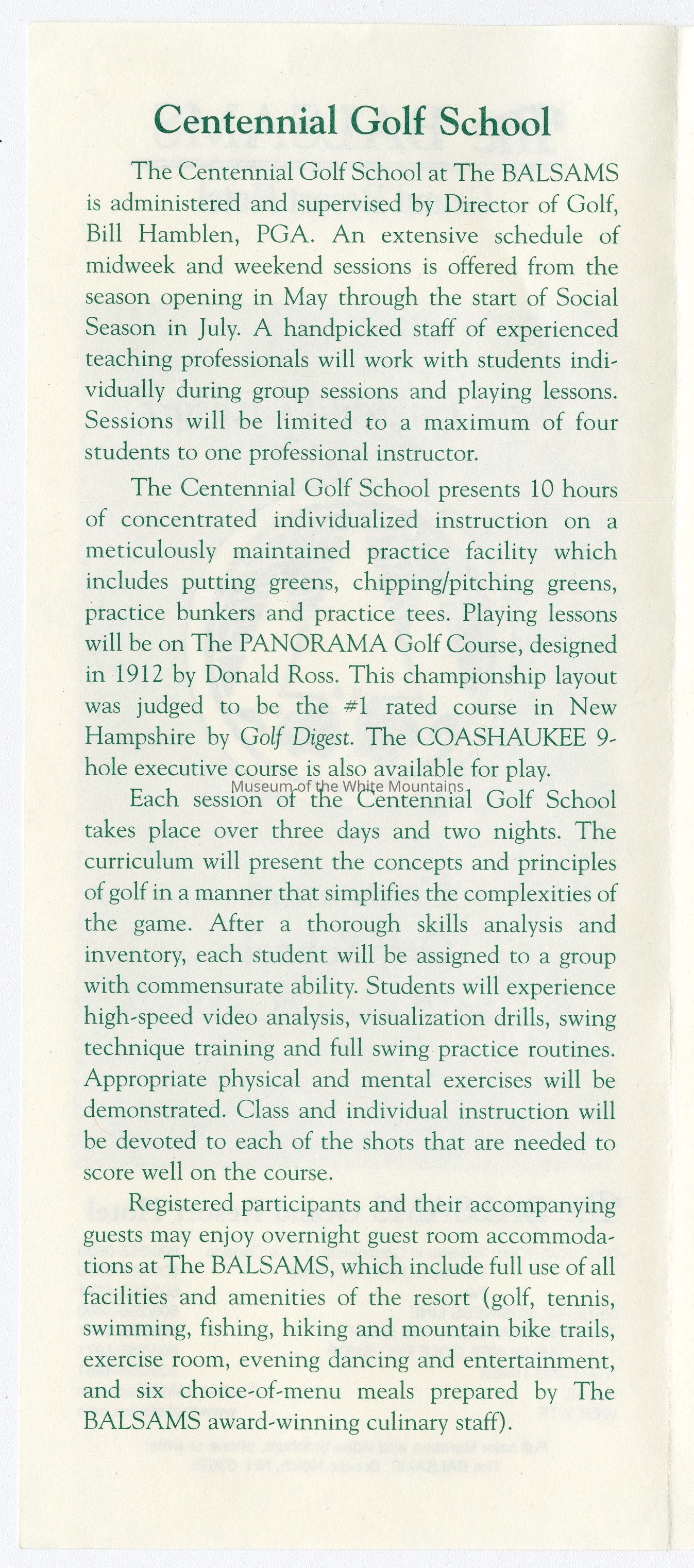 Brochure from the Balsams celebrating a century of golf at the hotel. Enclosed is information about the centennial golf school program along with rates and dates. On the back is a schedule for the three-day gold school program.