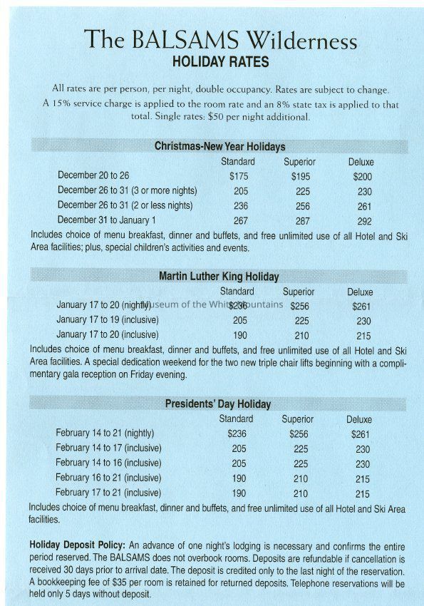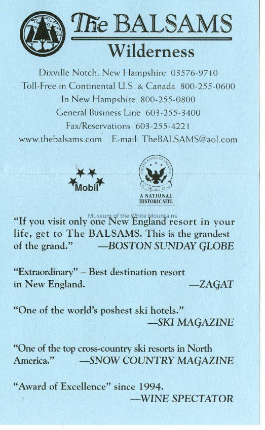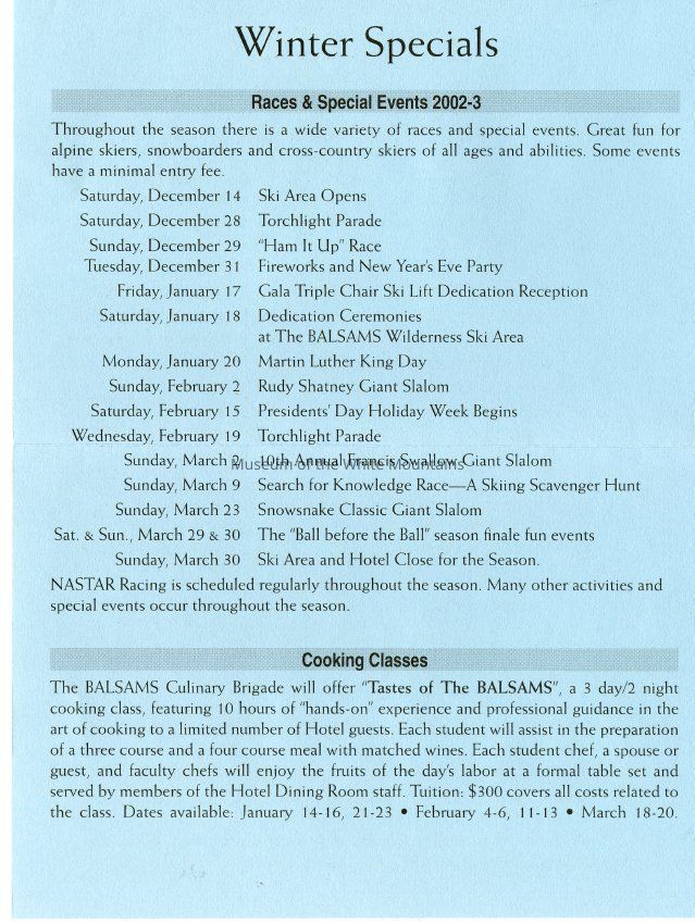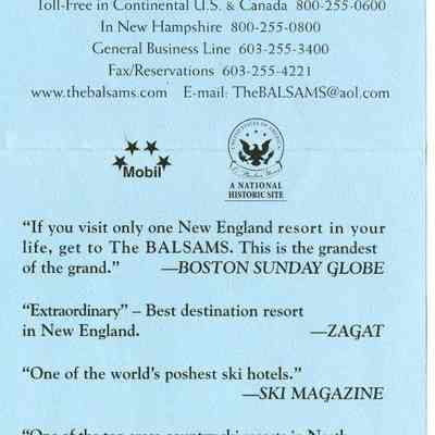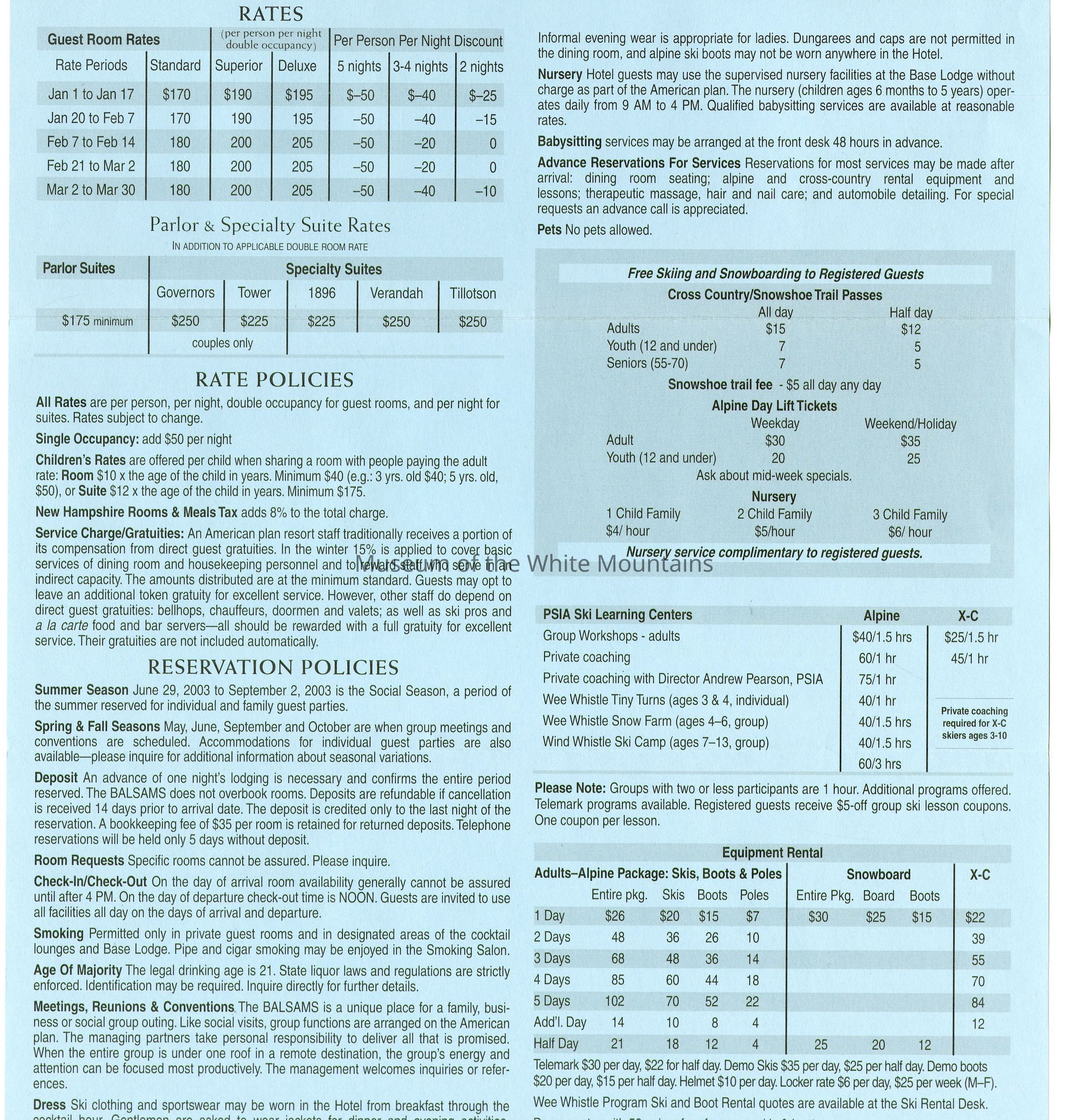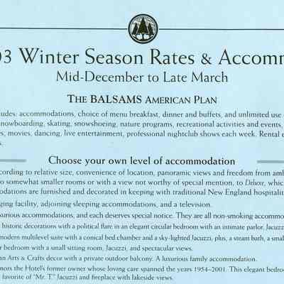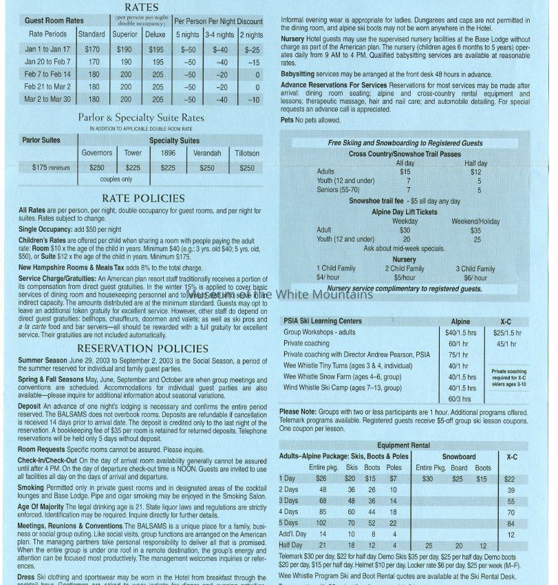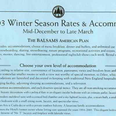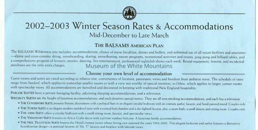 Brochure from the Balsams 2002-2003 with information about choosing your own level of accomodation, guest room rates, parlor and specialty suite rates, rate and reservation policies, cross country/snowshoe trail passes, lift tickets, equipment rental, and PSIA ski learning centers. On the back is information about holidays rates, winter specials, and directions to the hotel from New York City, Connecticut, Boston, Portland, Montreal and Toronto.Acquisition