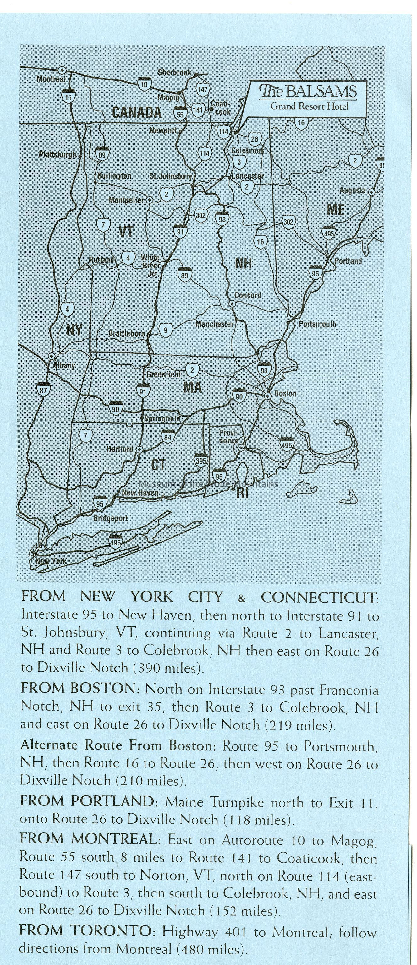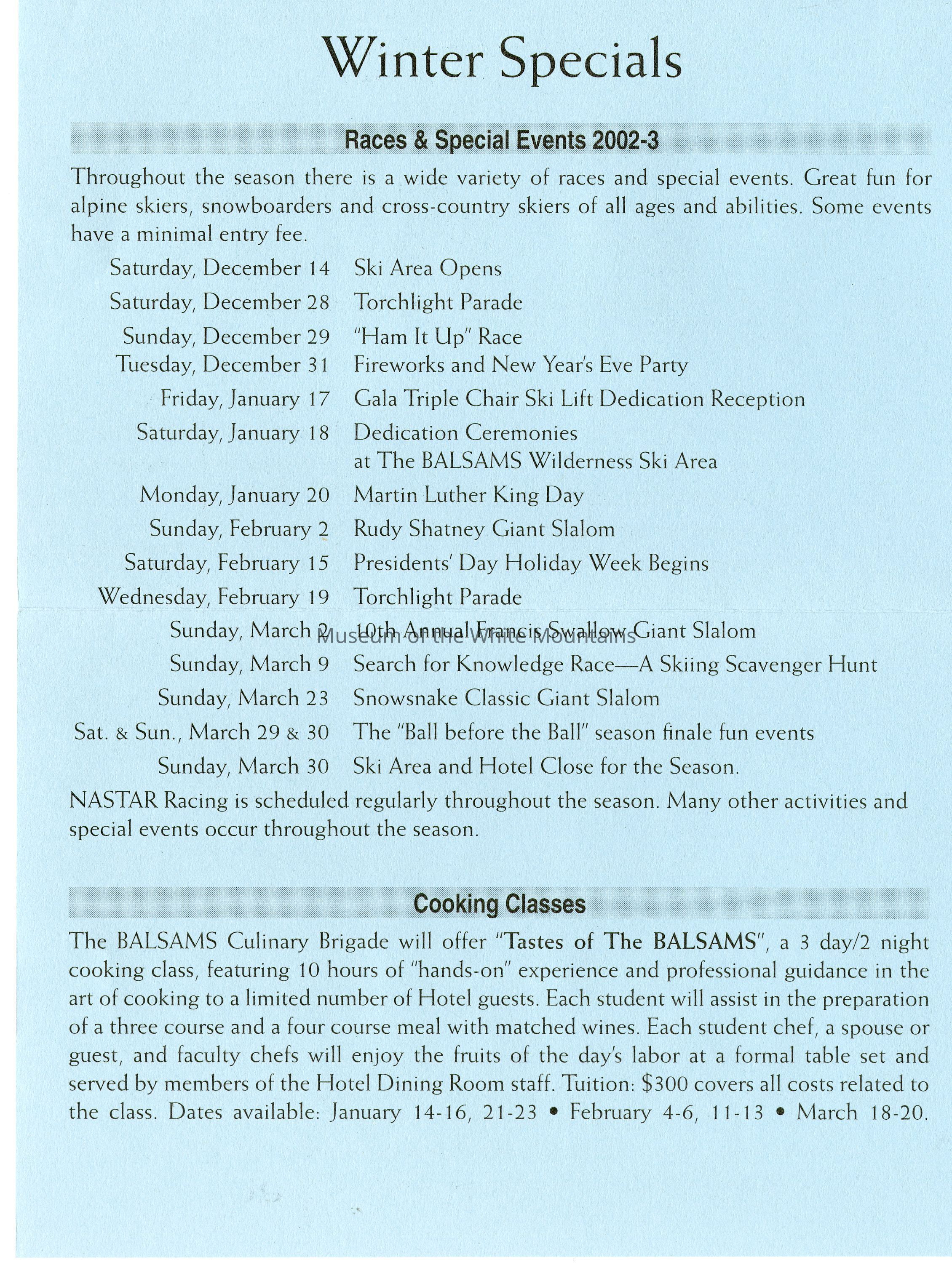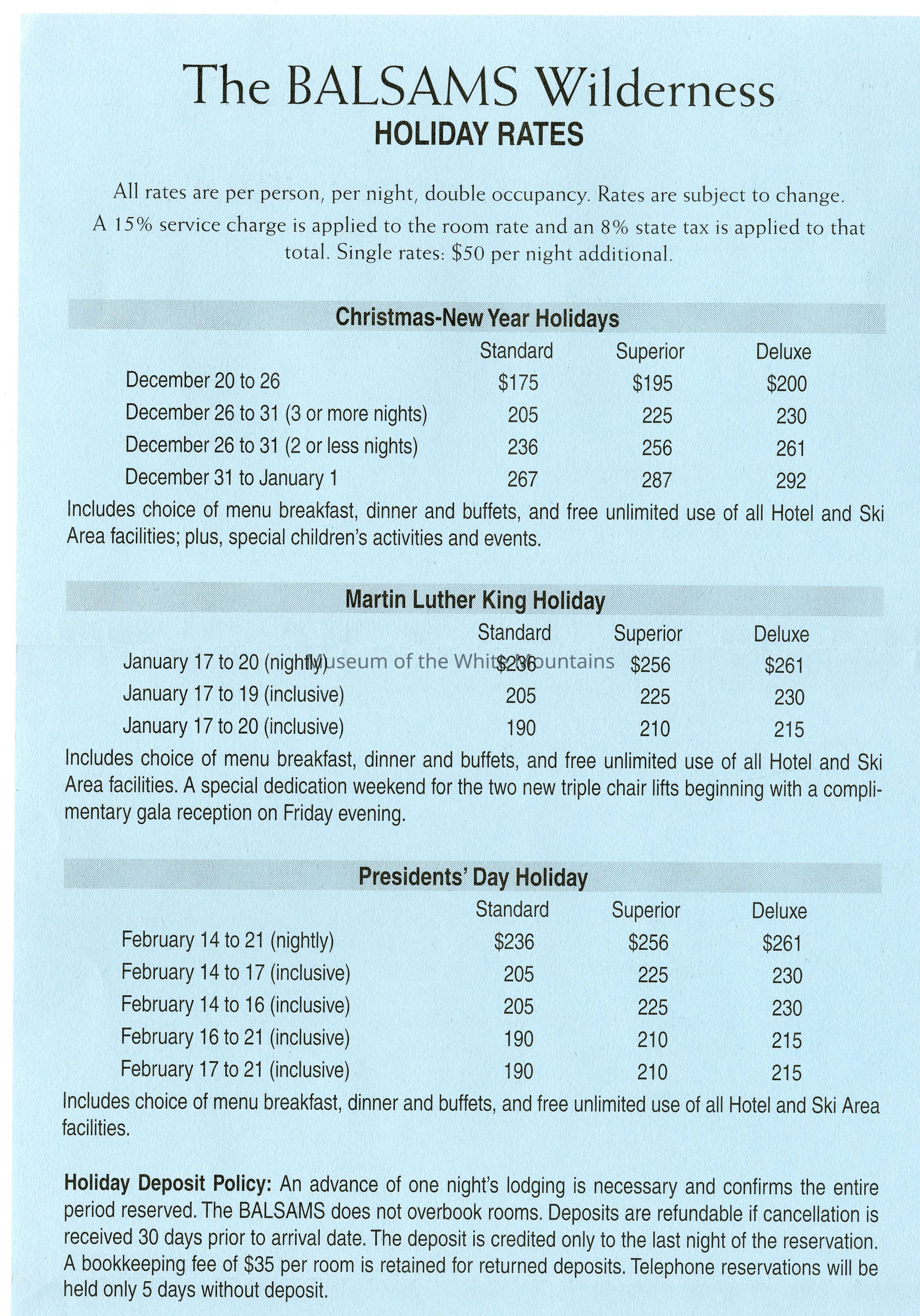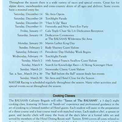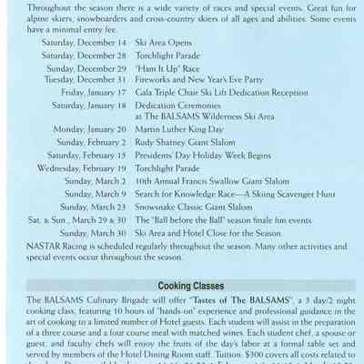Brochure from the Balsams 2002-2003 with information about choosing your own level of accomodation, guest room rates, parlor and specialty suite rates, rate and reservation policies, cross country/snowshoe trail passes, lift tickets, equipment rental, and PSIA ski learning centers. On the back is information about holidays rates, winter specials, and directions to the hotel from New York City, Connecticut, Boston, Portland, Montreal and Toronto.Acquisition