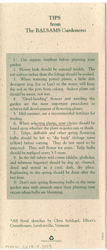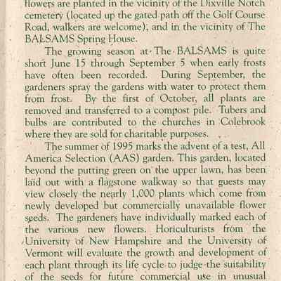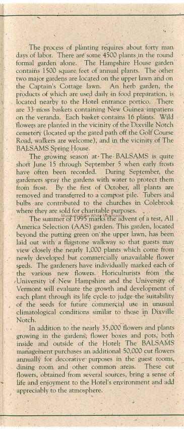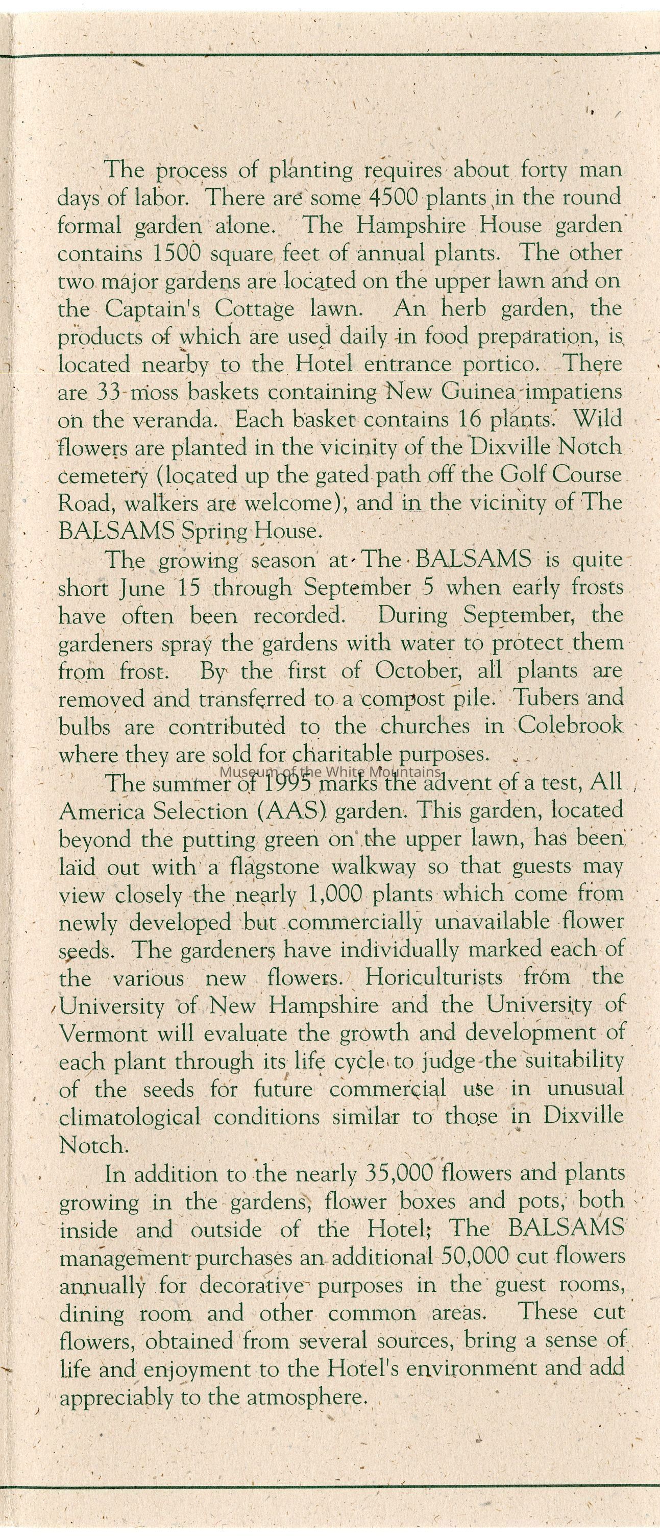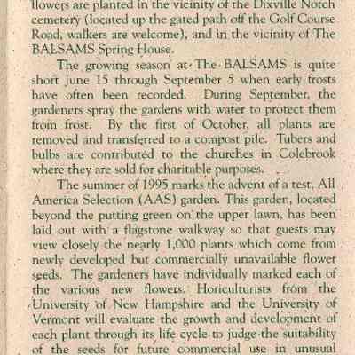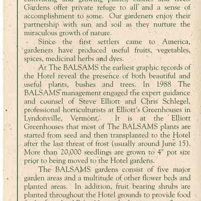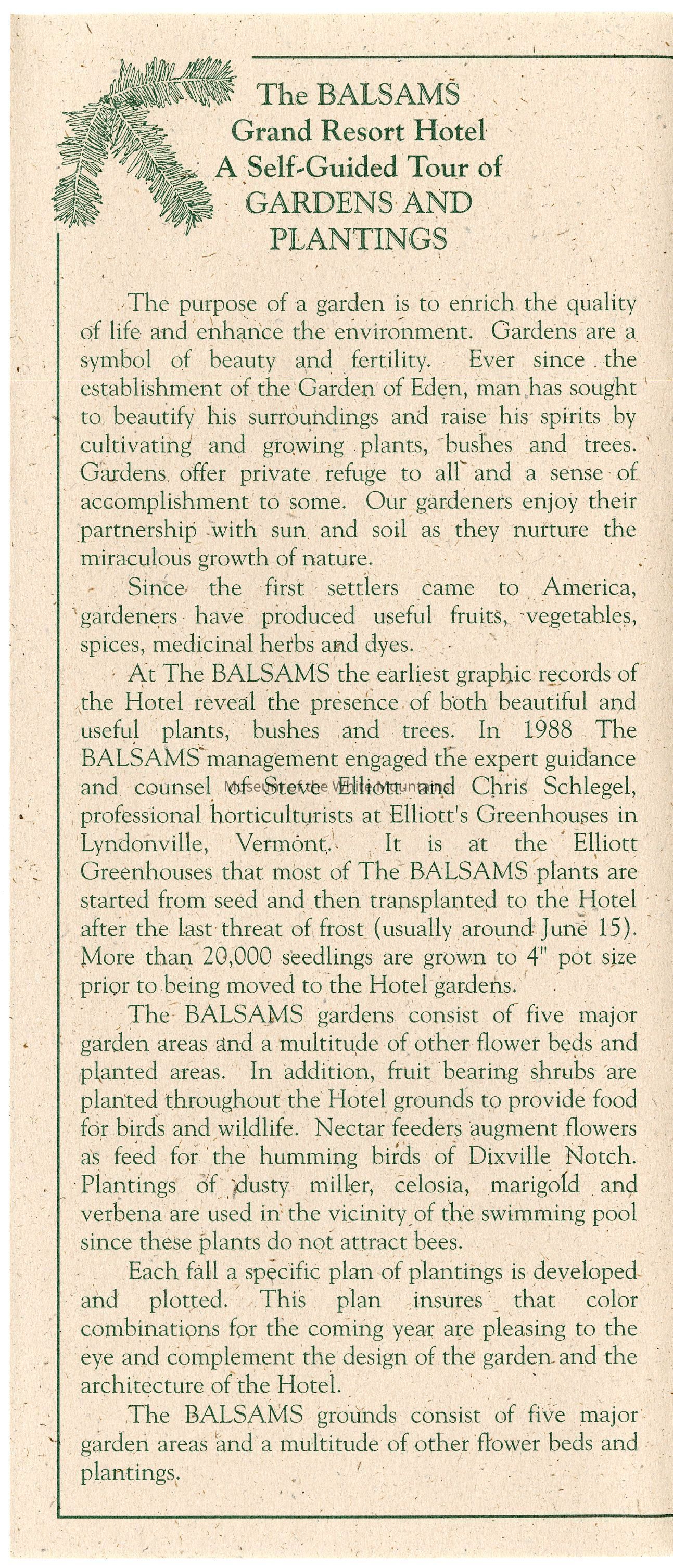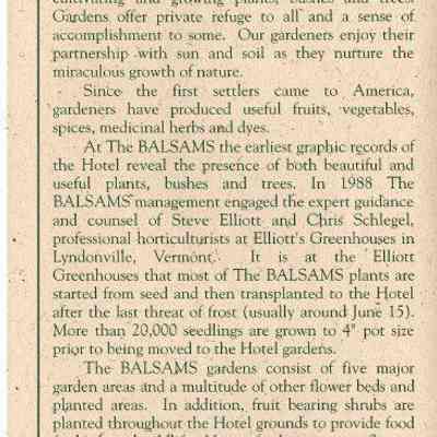 A Brochure with information about the gardens and plantings on the hotel property. Enclosed are sections with illustrations for border plants, medium and smaller height annuals, bakcground annuals, garden locations, and tips from the Balsams gardeners.Acquisition