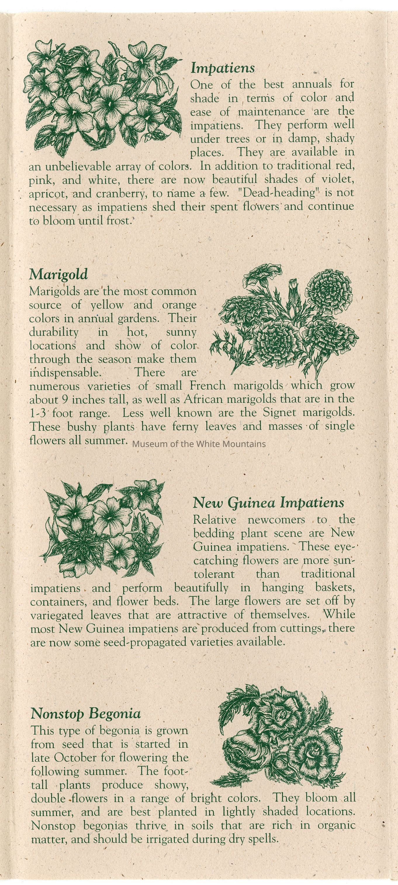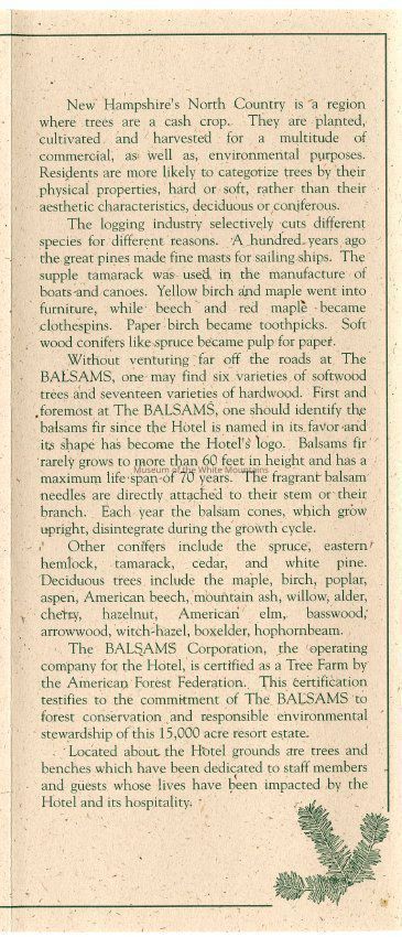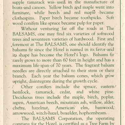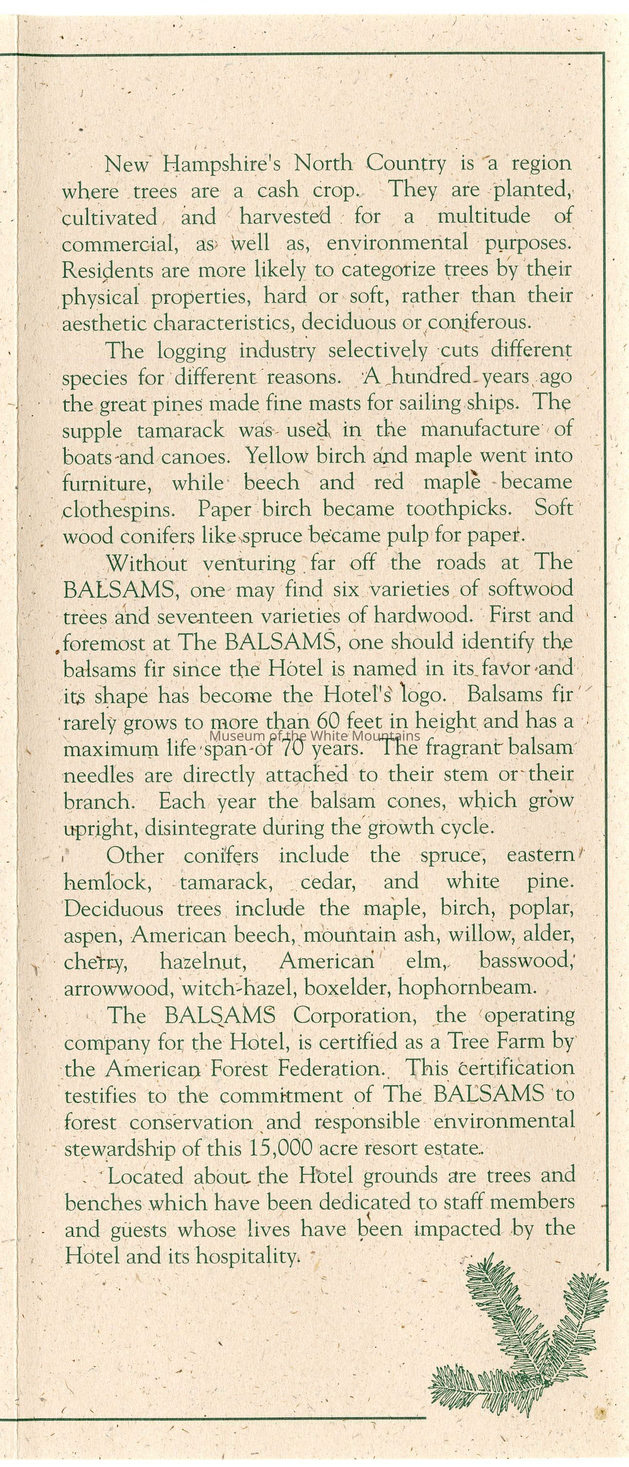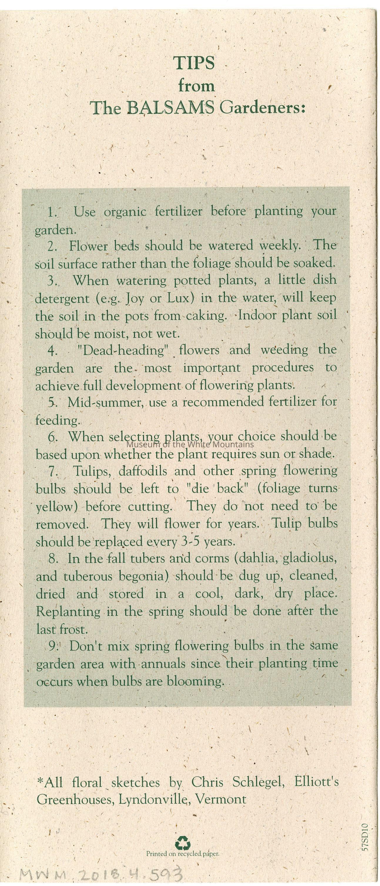 A Brochure with information about the gardens and plantings on the hotel property. Enclosed are sections with illustrations for border plants, medium and smaller height annuals, bakcground annuals, garden locations, and tips from the Balsams gardeners.Acquisition