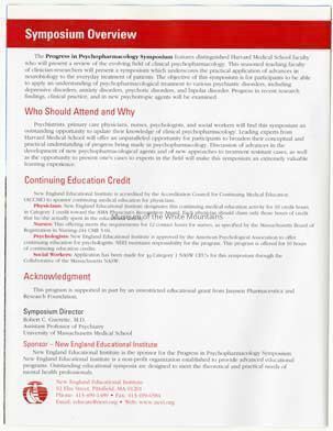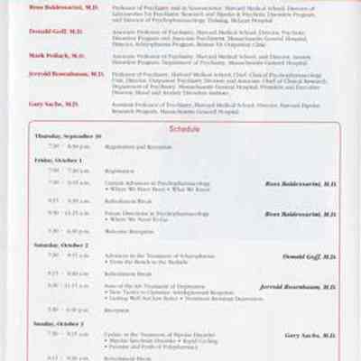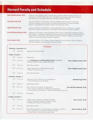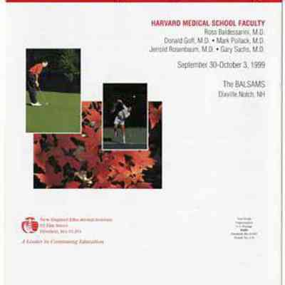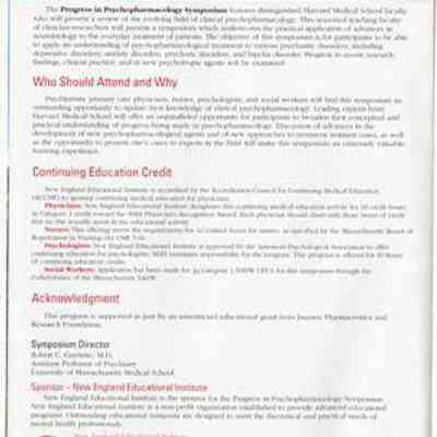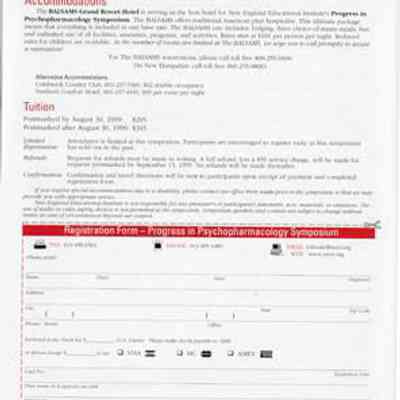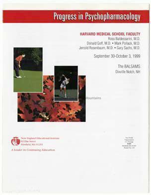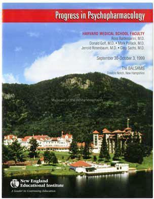 Brochure and schedule for the Progress in Psychopharmacology Symposium for the year of 1999 hosted by the Balsams Grand Resort Hotel. Enclosed is a description of the hotel and its ammenities, along with sections describing Harvard Faculty and Schedule, Registration and Accomodation information and a Symposium overview.