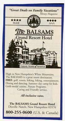 Magazine advertisement for the Balsams Grand Resort Hotel. On the top there is a review from Money Magazine that says, "Great Deals On Family Vacations". Additional text reads, "High in New Hampshire's White Mountains, The Balsams is a great resort destination. FREE: golf, tennis, hiking, biking, entertainment. Dining and dancing. Summer day camp for kids. Gold-medal cuisine. Nature Programs. Caring and Friendly service. All-inclusive rates."Acquisition