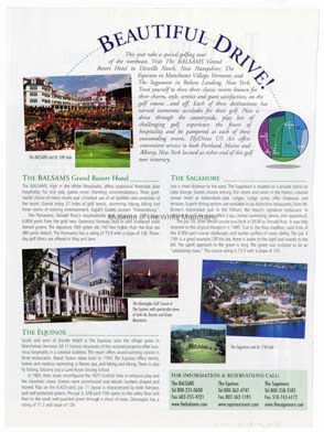 Magazine advertisement encouraging tourists to take a special golfing tour of the northeast featuing the Balsams Grand Resort Hotel along with The Equinox in Manchester Village, Vermont and the Sagamore in Bolton Landing, New York. Included are images of each resort along with descriptions highlighting their golf courses.