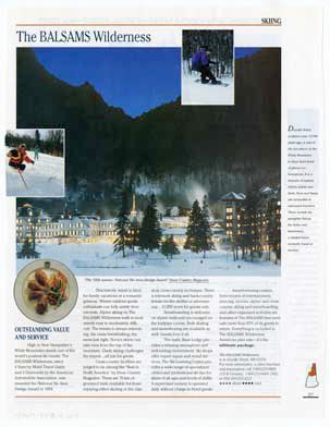 Magazine advertisement for The Balsams Wilderness including images of the hotel and people skiing and snowboarding. Below is a heading titled "Outstanding Service and Value" describing the historic winter resort along with its cross-country facilities, rustic base lodge, and the American plan rate.