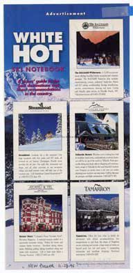 Advertisment from a November 27, 1995 edition of the New Yorker Magazine. The White Hot Ski Notebook, a skiers' guide to the best destinations and finest accomodation in the country, features the Balsams Wilderness along with other resorts such as Steamboat, Telluride Resort, Strater Hotel, and Tamarron.Acquisition
