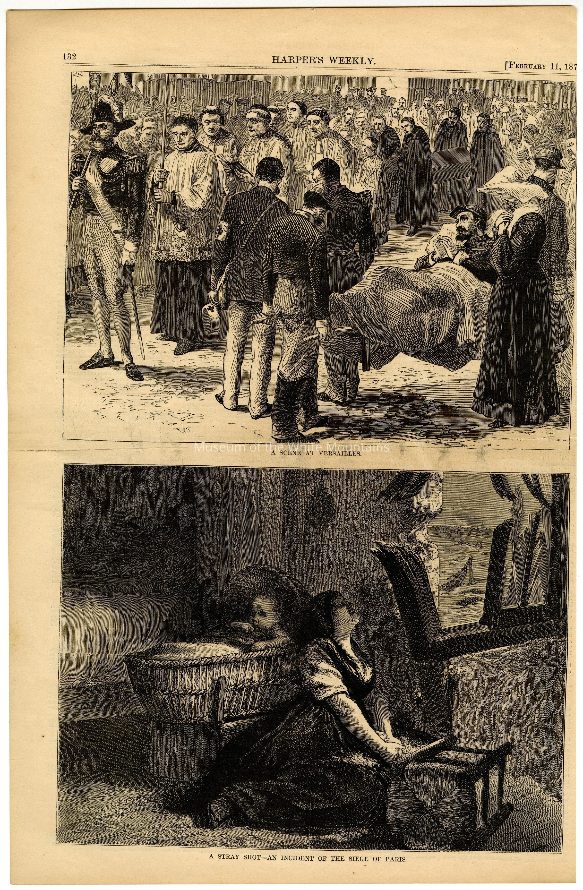 A page from Harper's Weekly dated February 11, 1871. The front contains two engravings: On top, an engraving depicting 'a scene at Versailles,' and below, 'an incident of the siege of Paris.'