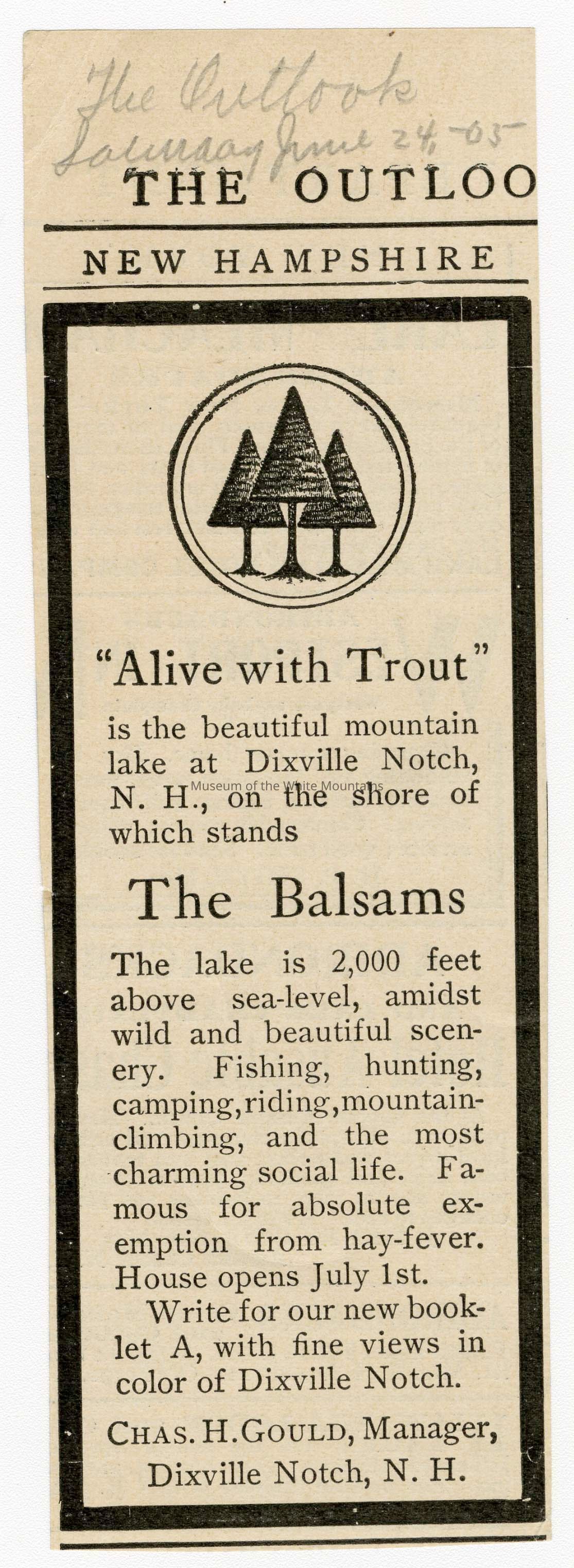 Small newspaper clipping for The Balsams from The Outlook, the headlining title is that the mountain lake is "alive with trout." It lists amenities and mentions Chas. H. Gould as the manager. Additional text reads "Fishing, hunting, camping, riding, mountain climbing, and the most charming social life."Acquisition
