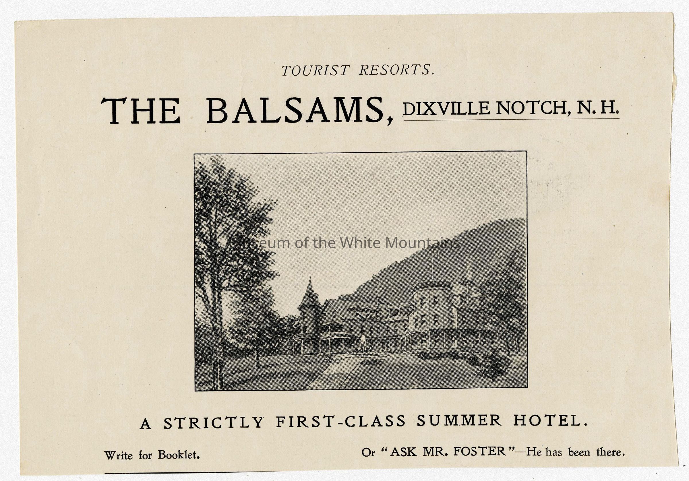 An excerpt of an ad from Tourist Resorts. Describes The Balsams as "a strictly first-class summer hotel."