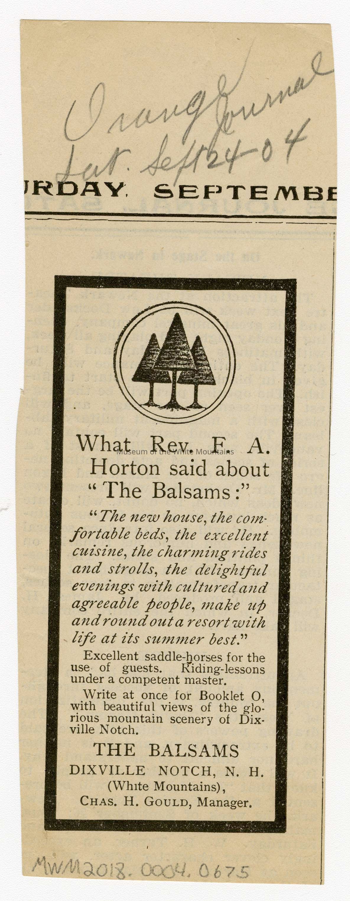 A positive review by Rev. F. A. Horton of The Balsams in the newspaper. Some text reads "The new house, the comfortable beds, the excellent cuisine, the charming rides and strolls, the delightful evening with cultured and agreeable people, make up and round out a resort with life at its summer best."Acquisition