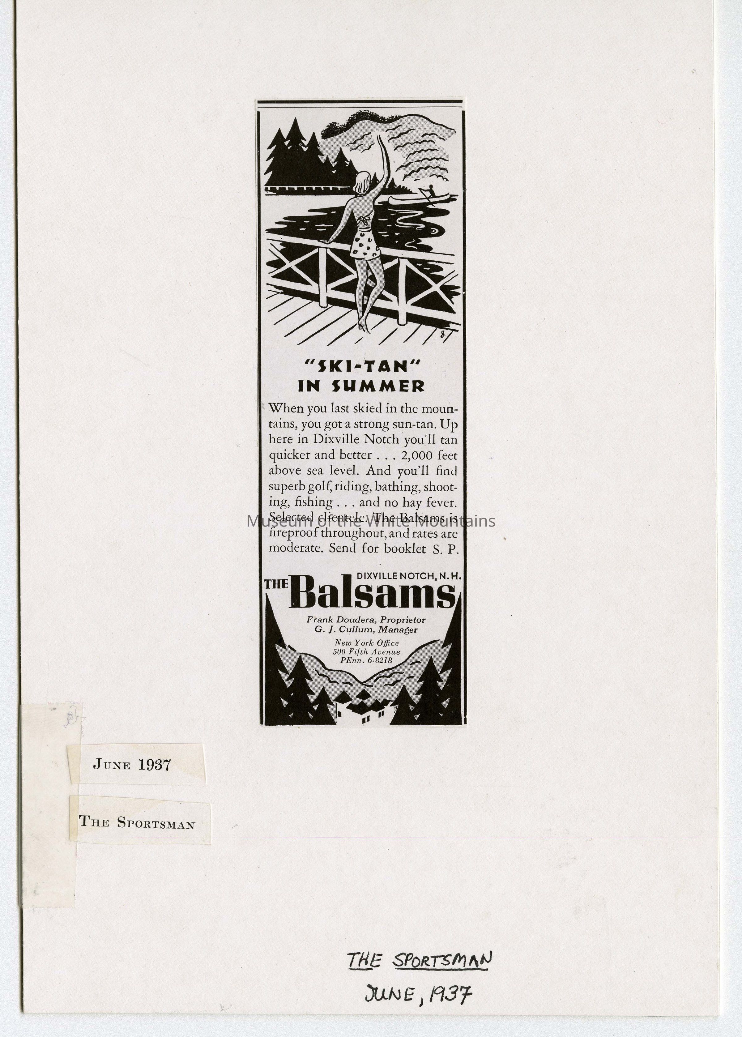 1937 Newspaper ad with illustrations for The Balsams. Announces their summer season along with activities such as golf, horseback riding, fishing and more. The header text is "Ski-Tan in Summer," with additional text reading "When you last skied in the mountains, you got a strong sun-tan. Up here in Dixville Notch, you'll tan quicker and better."Acquisition