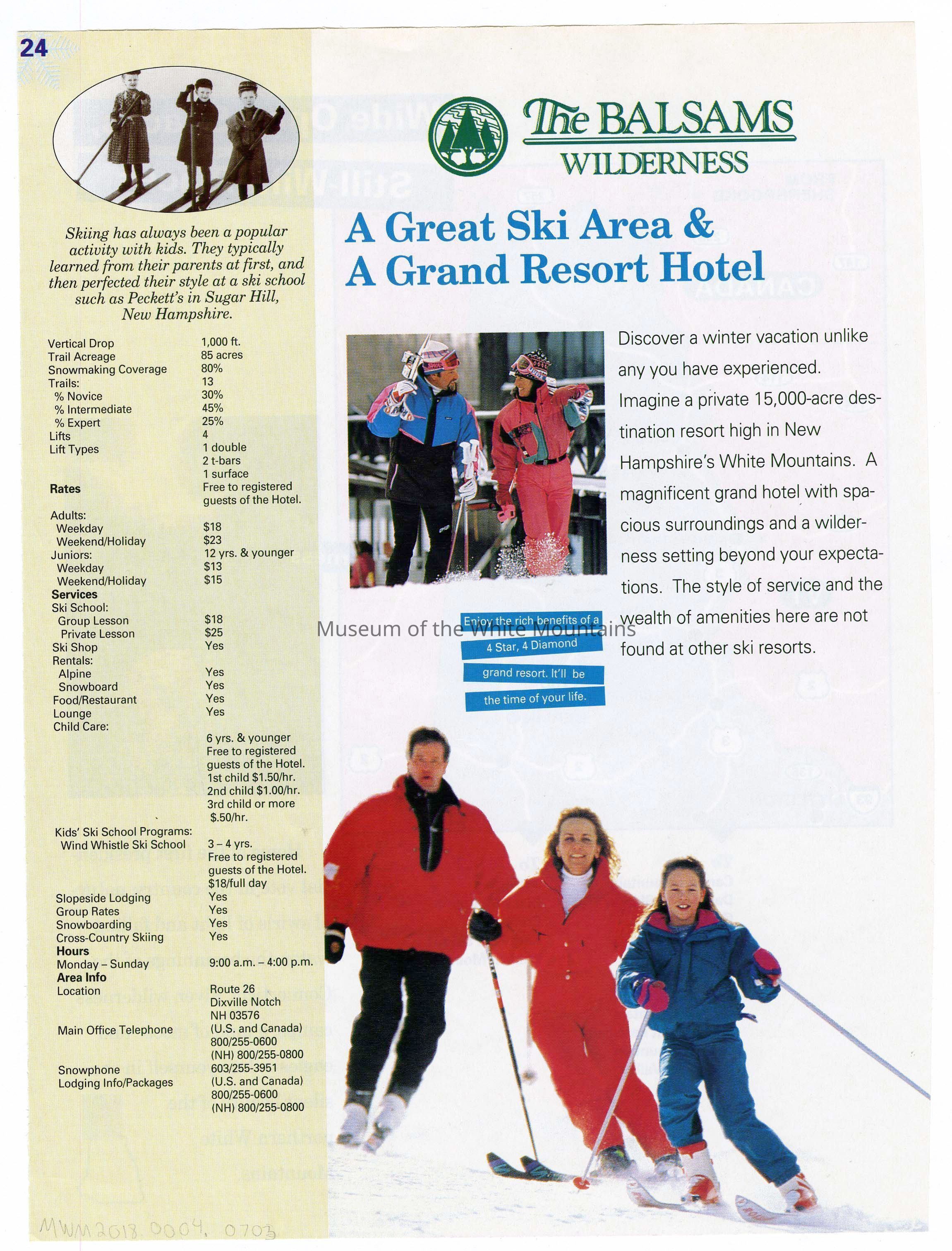 Page out of a magazine promoting The Balsams Wilderness. The lefthand side has information on for rates along with contact information. Some text reads "The style of service and the wealth of amenities here are not found at other ski resorts."