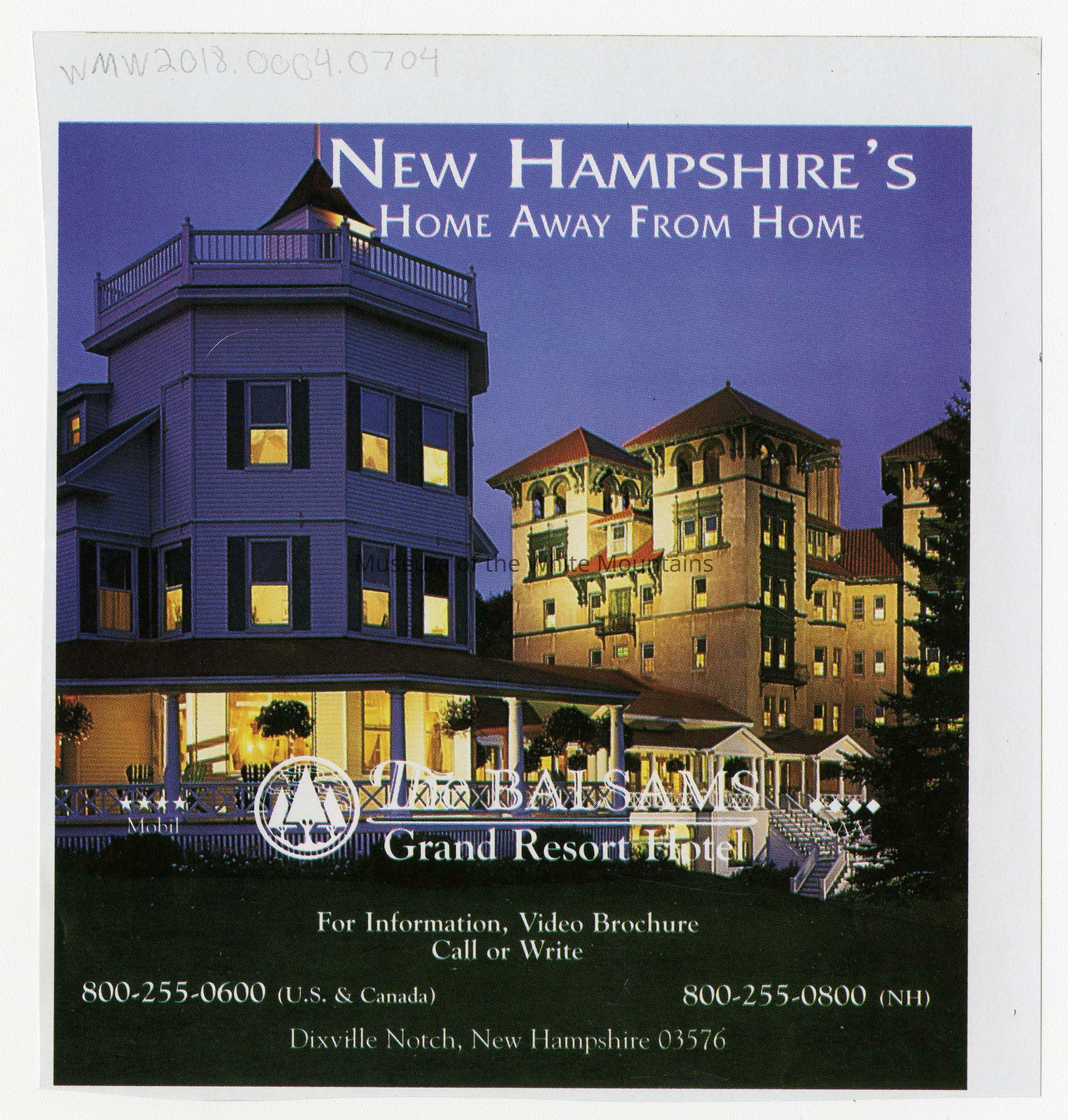 Ad from a magazine with text over a picture of the lodging buildings from The Balsams. The tagline is "New Hampshire's home away from home," and gives contact information.