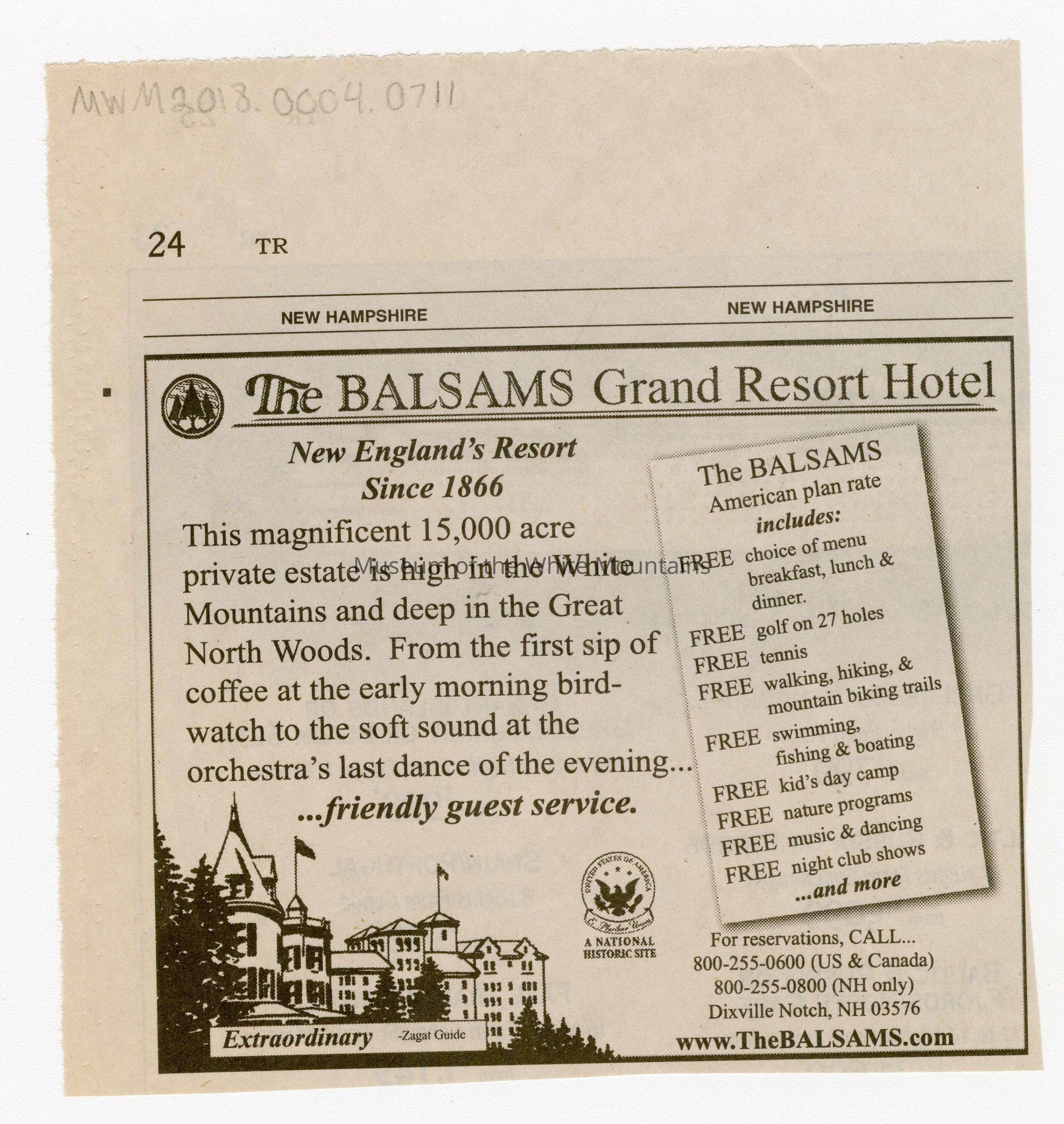 Newspaper ad for The Balsams. Explains the American Plan and praises the hotel service.