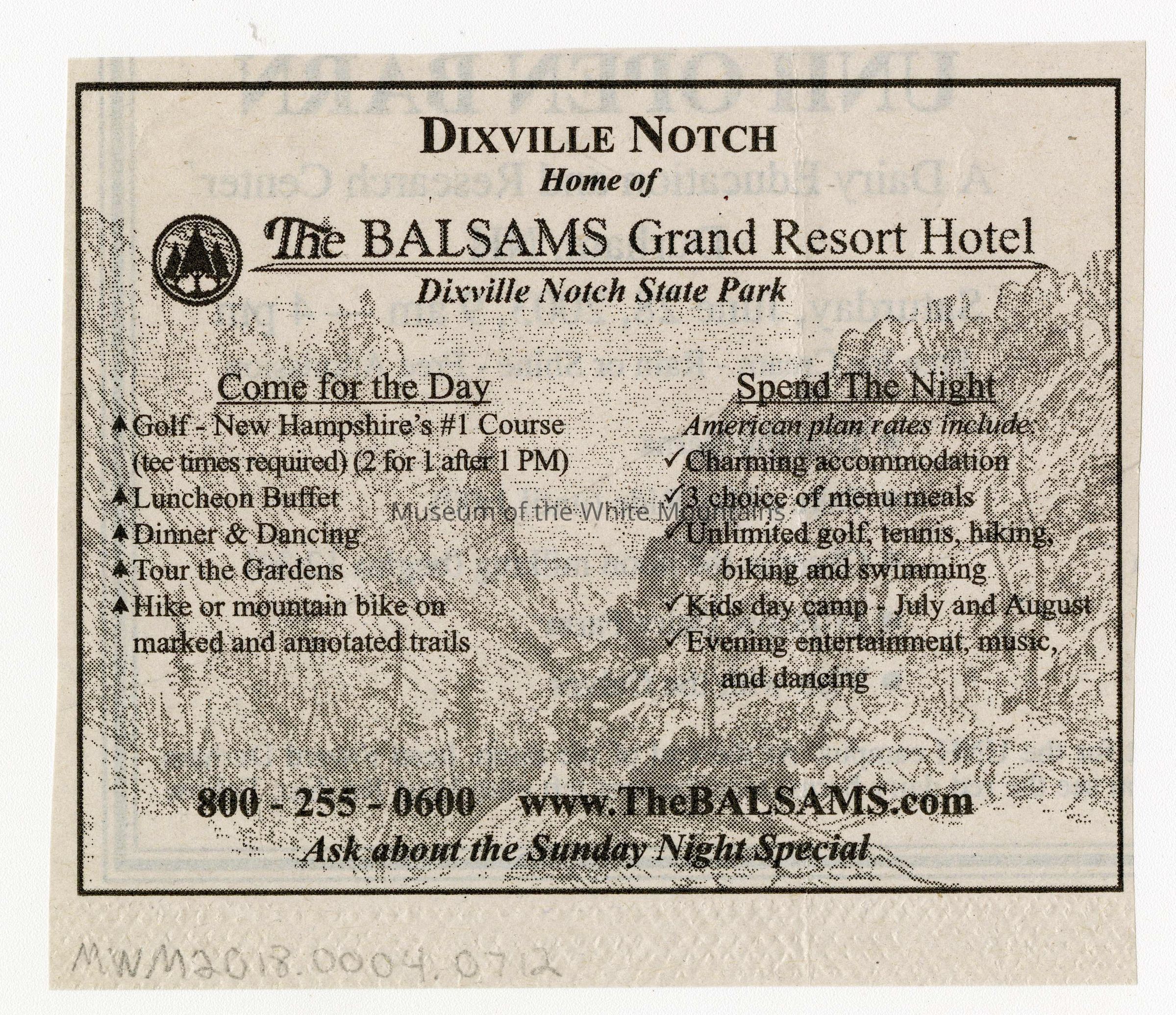 Newspaper advertisement that gives daytime and nighttime activities for The Balsams.