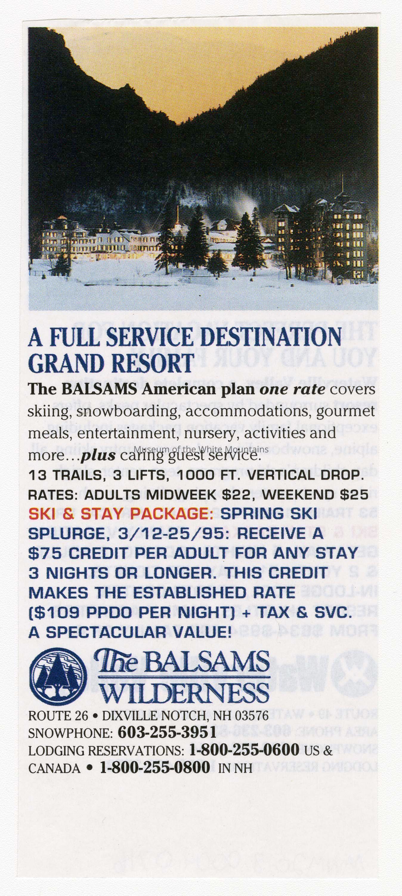 Magazine ad for The Balsams Wilderness along with details of ski packages. Contact information along with the address of the resort are at the bottom.