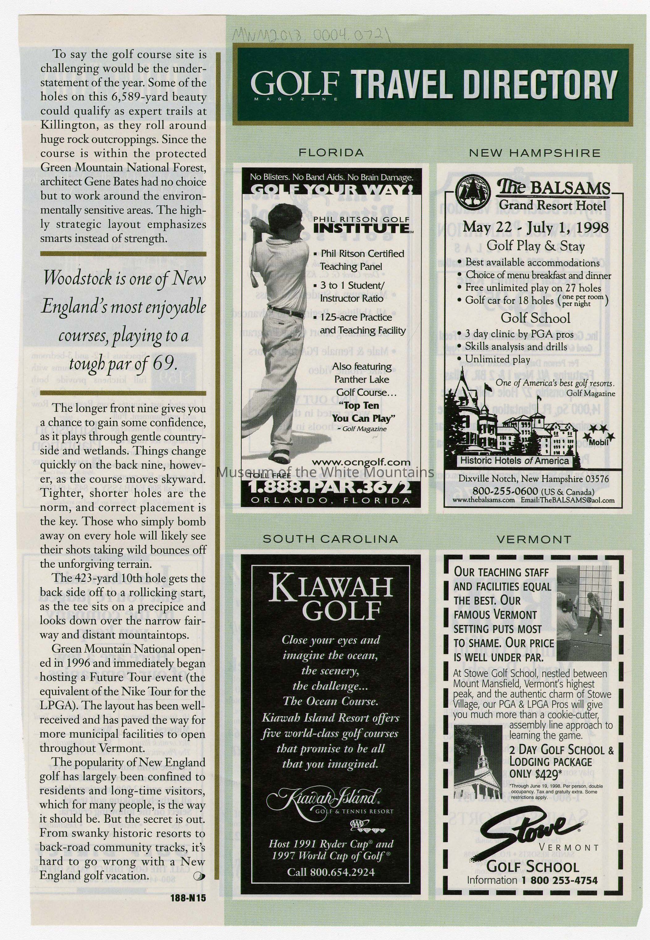 A page from a magazine Golf Travel Directory.