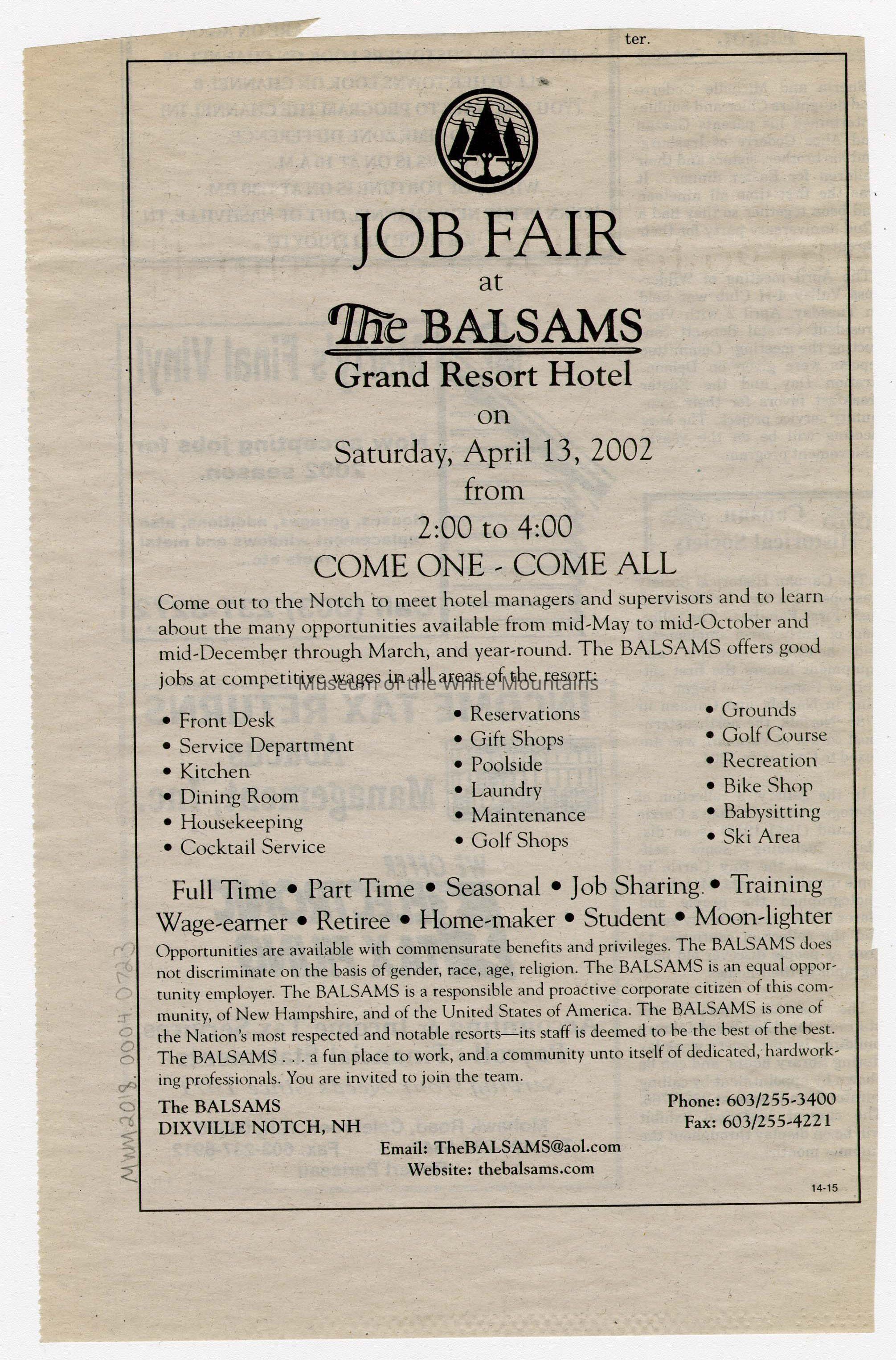 Newspaper ad for a job fair at The Balsams in April 2002. The jobs offered are a mix of seasonal and year round.