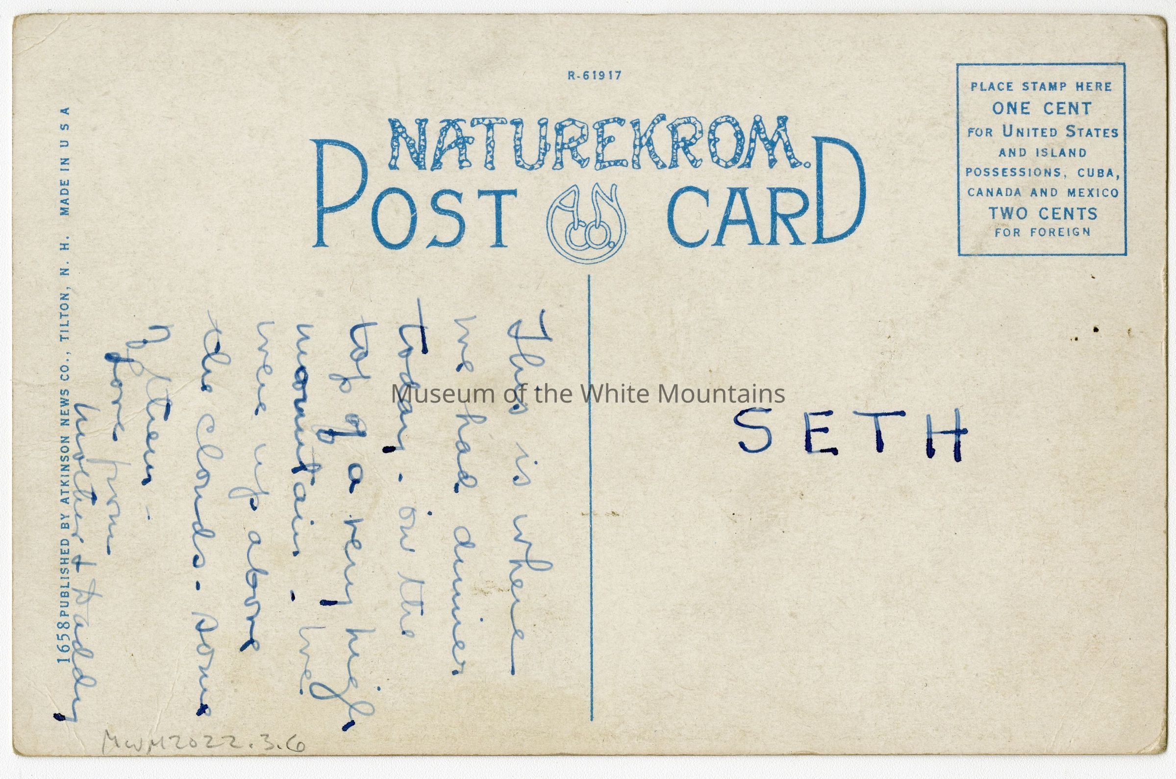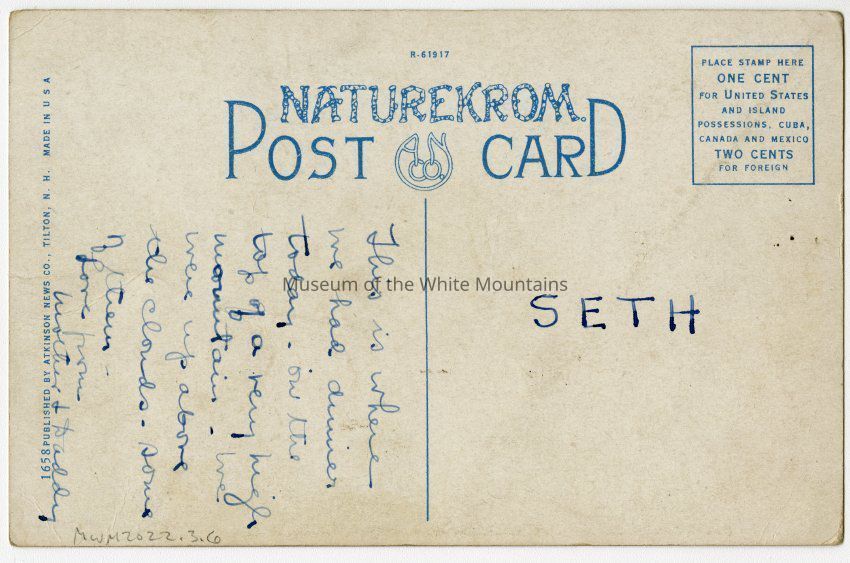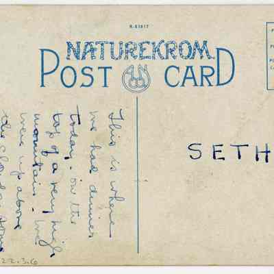 "This is where we had dinner today. On the top of a very high mountain. We were up above the clouds. Some of them. Love from Mother + Daddy"Collection