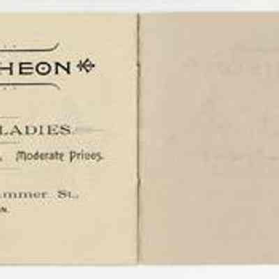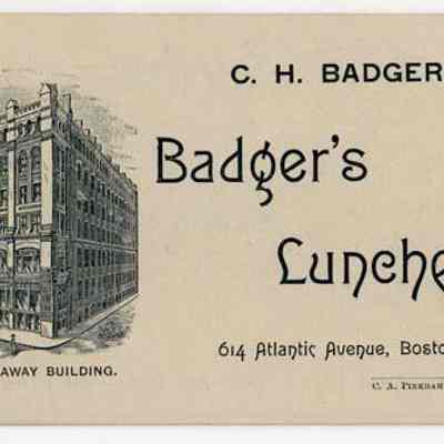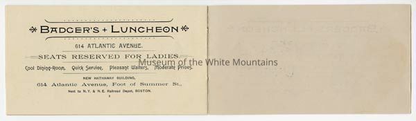 The last page of the brochure advertises for Badger's Luncheon. Printed on the page is, "614 Atlantic Avenue., Seats Reserved for Ladies., Cool Dining-Room, Quick Service, Pleasant Waiters, Moderate Prices., New Hathaway Building, 614 Atlantic Avenue, Food of Summer St., Next to N.Y. & N.E. Railroad Depot, Boston."Collection