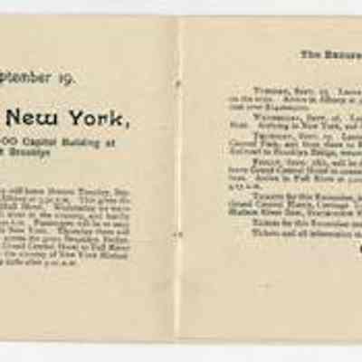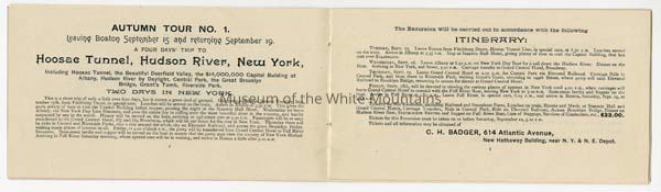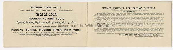 The following page outline Autumn Tour Number One through the Hoosac Tunnel on the Hudson River in New York. The dates and length of the trip are identified in mid-September. It describes what will be seen on the tour, where the passenger will go, an itinerary, ticket restrictions, information, and the cost of the tour.