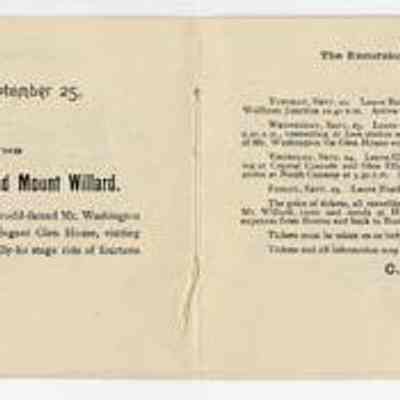 Particular highlights in the tour include ascending Mount Washington, "via the World-famed Mt. Washington Railroad, and descending the mountain in mountain carriages to the new and elegant Glen House, visiting Crystal Cascades, Glen Ellis Falls, passing in full view of Tuckerman's Ravine."
