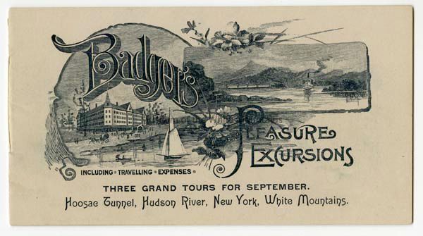 The cover of the Badger's Pleasure Excursions features prints of hotels, sailboats, steamboats, trains, mountains, and water. Also printed on the cover is, "Badger's Pleasure Excursions, Including* Traveling* Expenses, Three Grand Tours for September, Hoosac Tunnel, Hudson River, New York, White Mountains."