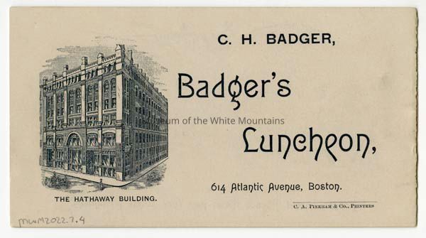 The back of the brochure features a print of the Hathaway Building with a label printed under the image and has the following printed, "C.H. Badger, Badger's Luncheon, 614 Atlantic Avenue, Boston., C.A. Pinkham & Co., Printers"