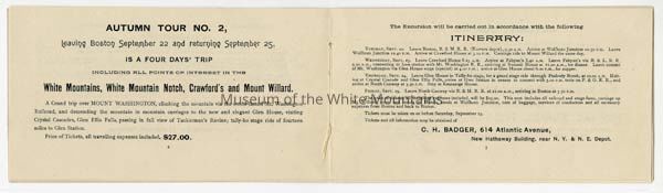 The next page describes Autumn Tour Number Two through the White Mountains of New Hampshire. The dates of the trip are identified as "leaving Boston on September 22 and returning September 25." It also indicates the length of the trip. Specific points of interest indicated are, "White Mountains, White Mountain Notch, Crawford's, and Mount Willard."