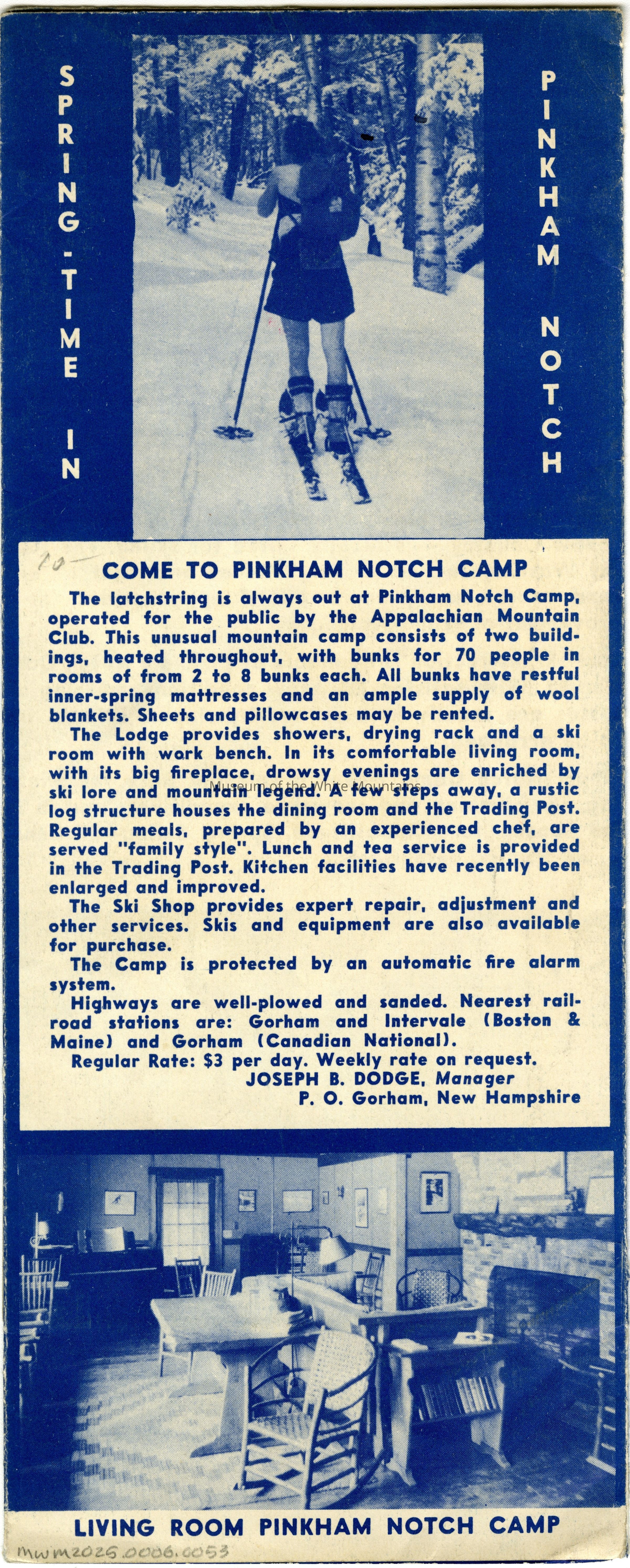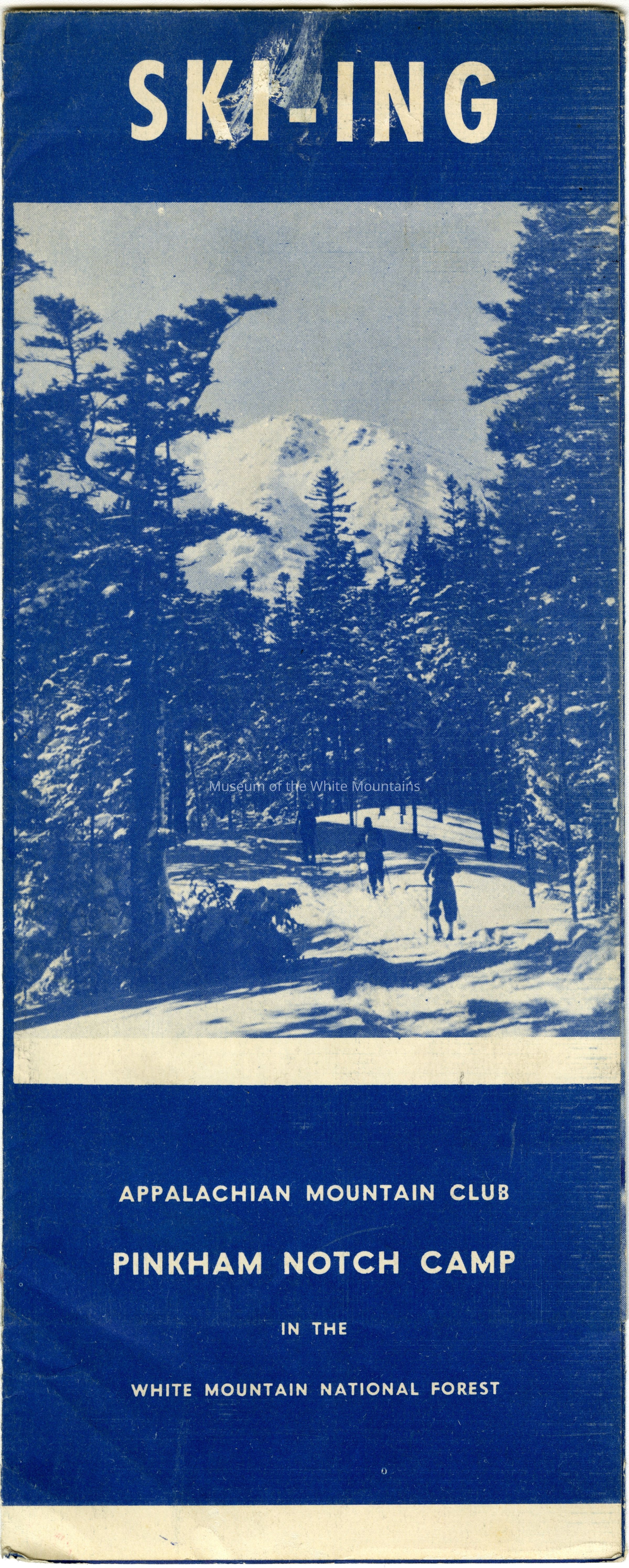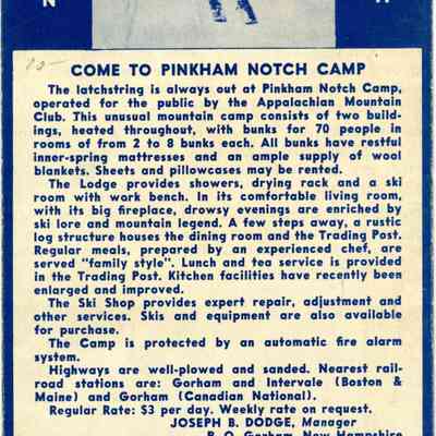 A blue and white pamphlet containing images and information on Pinkham Notch Camp and skiing.Acquisition