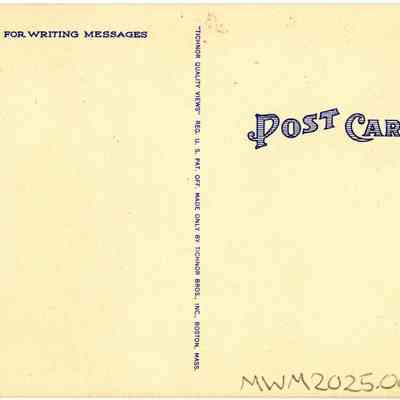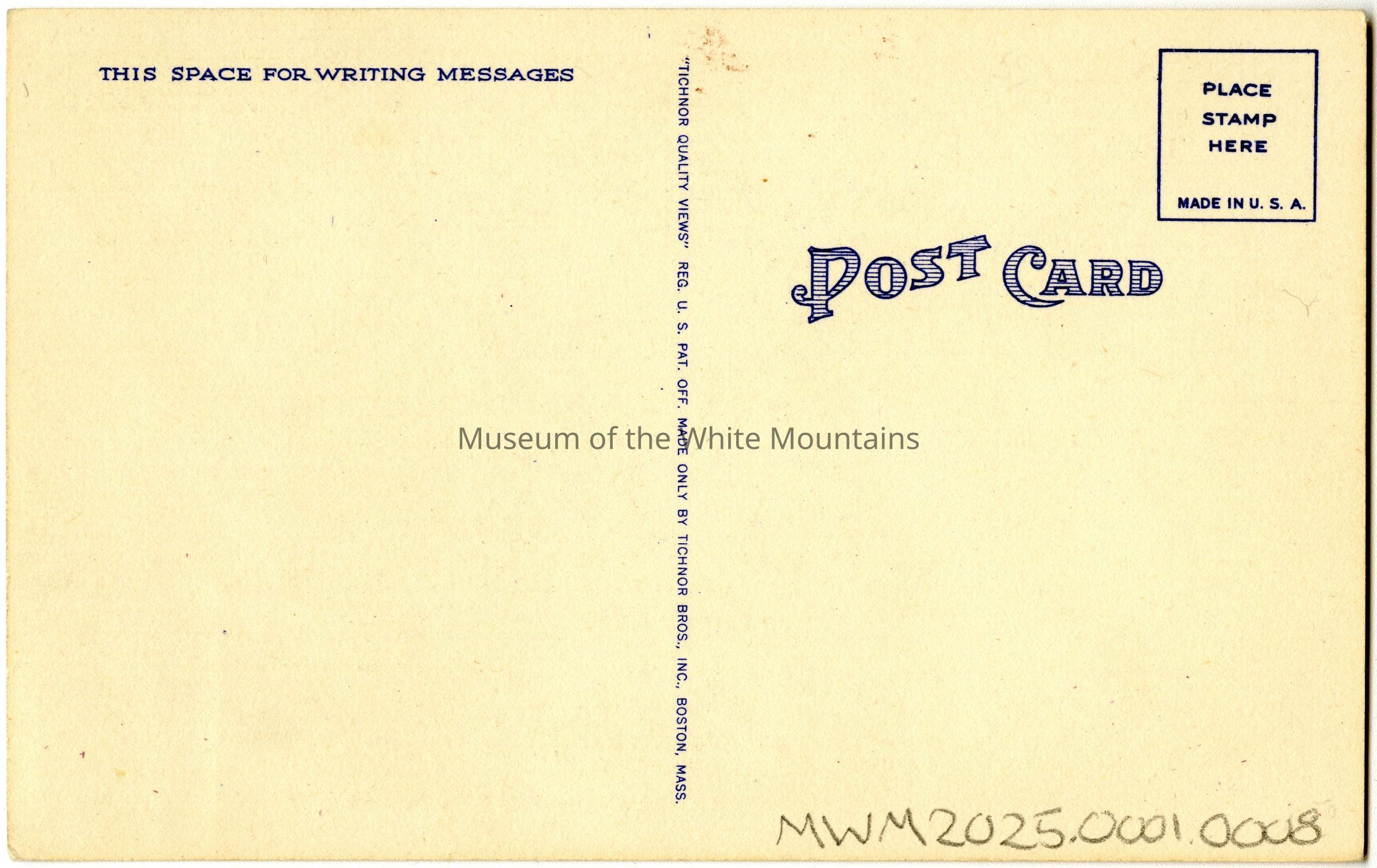 A postcard containing a color portrait depiction of a bridge before a forest and Mt. Liberty.