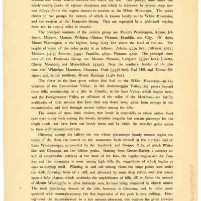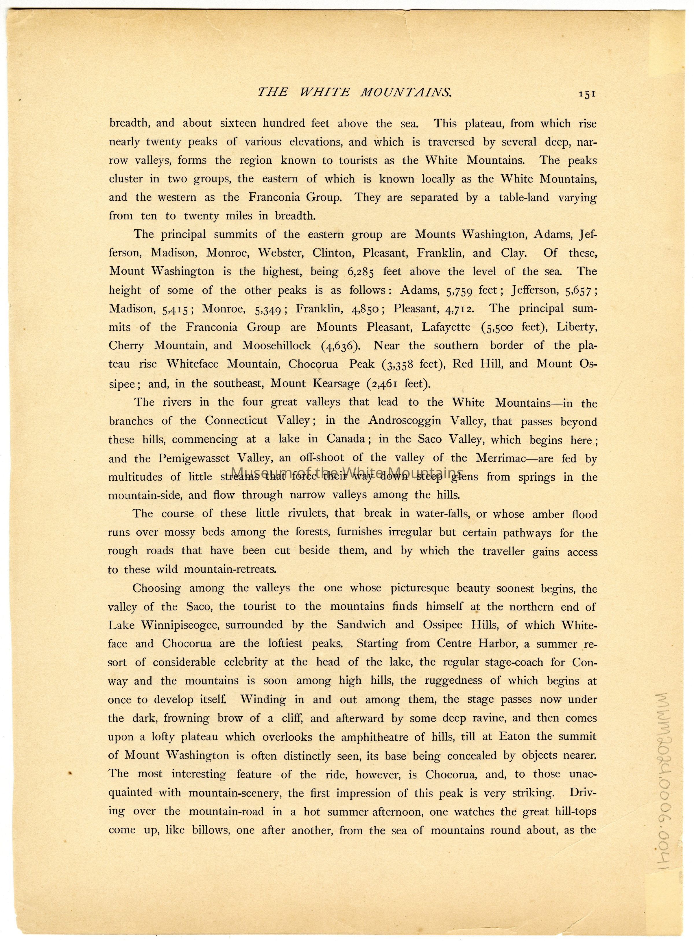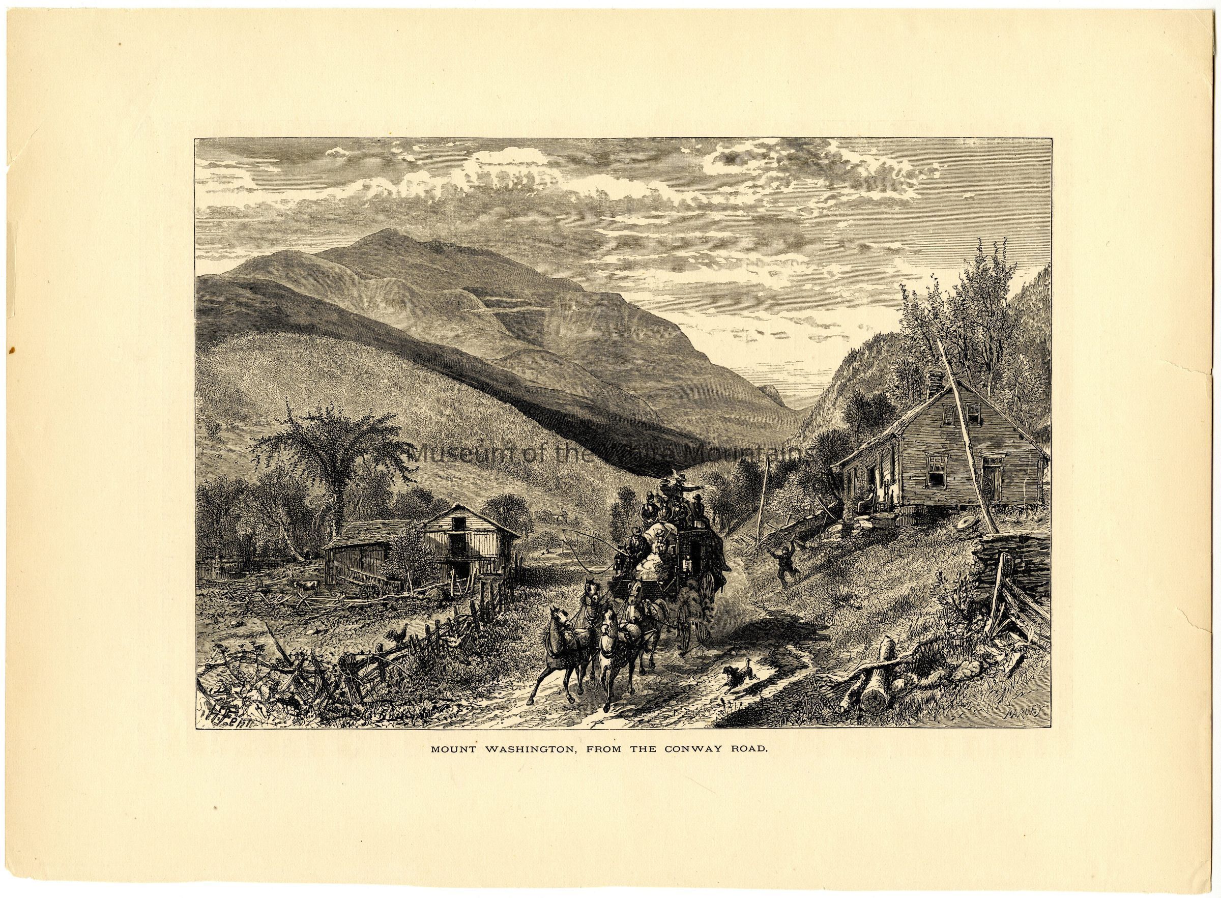 A landscape engraving of Mount Washington viewed from Conway Road where horses pulls a carriage down a road in between two buildings on the front. Page 151 from a publication titled 'THE WHITE MOUNTAINS' on the back.
