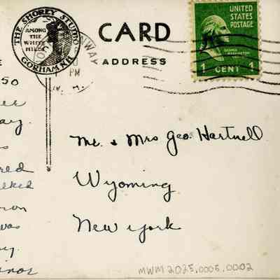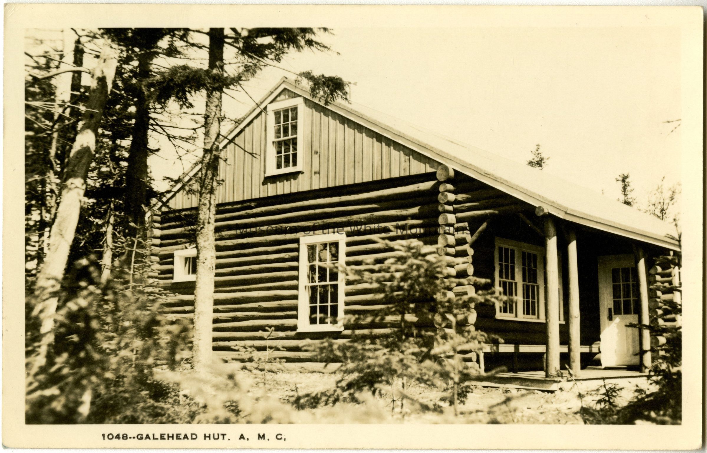 A postcard containing a low-angle photograph of Galehead Hut. The image is black and white. Typical postcard back. Stamped with Shorey Studio, Gorham, NH. Postmarked from North Conway, NH on the 6th of an obscured month, 1950, at 1pm.