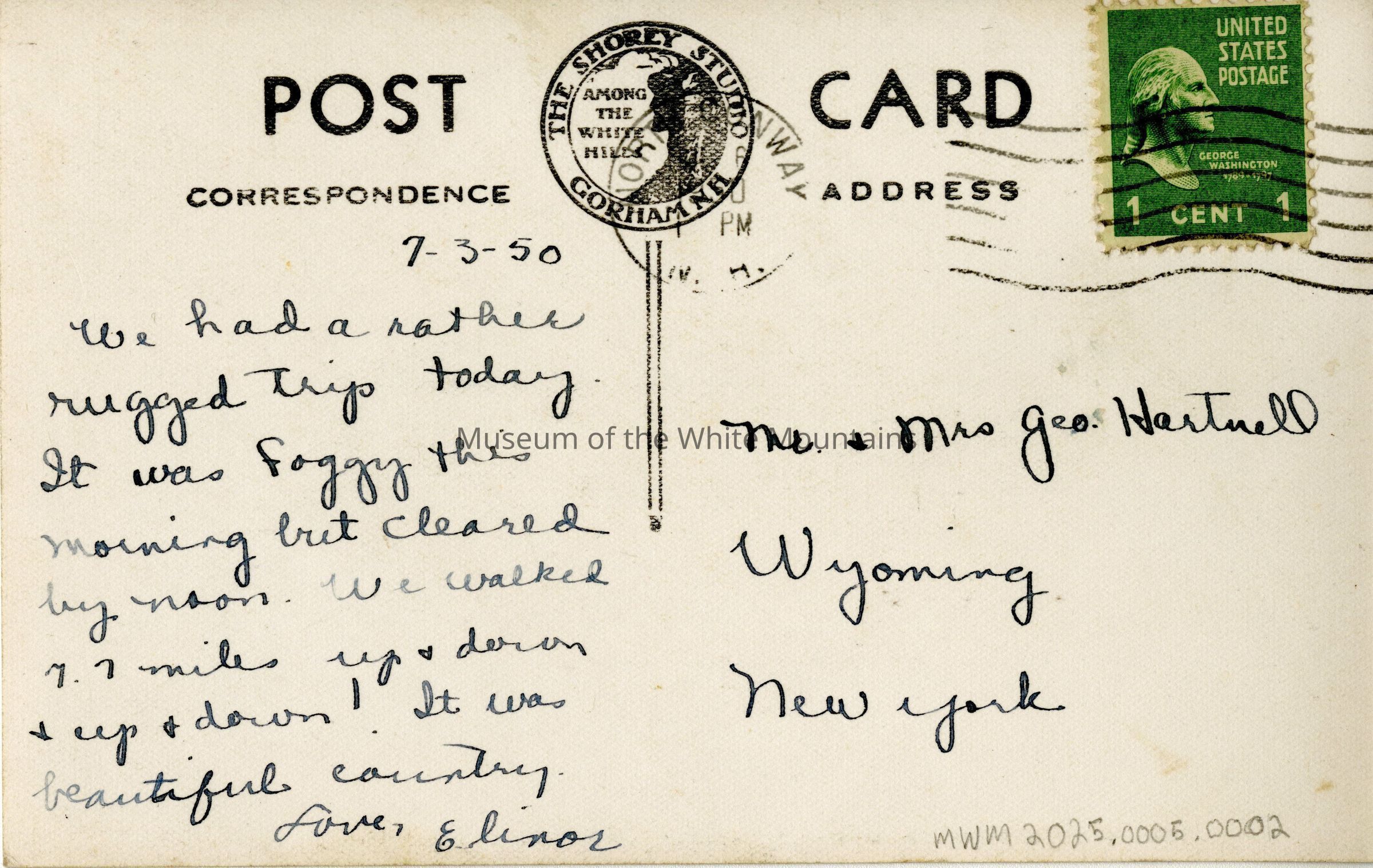 Transcription: 7-3-50, We had another rugged trip today. It was foggy this morning but cleared by noon. We walked 7.7 miles up + down + up + down! It was beautiful country. Love, Elinor